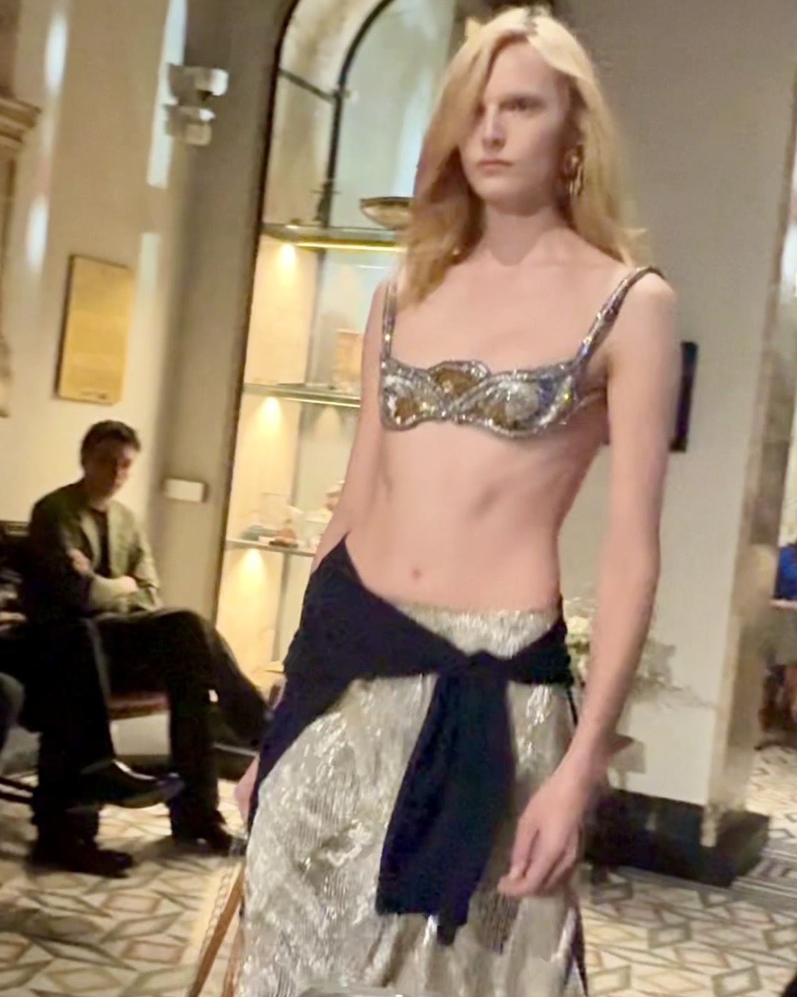 마크 뉴슨이 디자인한 무대는 마치 픽셀화된 로마의 거리처럼 보였다. 낯설면서도 익숙하고, 차갑지만 동시에 따뜻했다. 그 사이를 지나가는 옷들은 한순간 무너질 듯 가볍고, 또렷하게 자기 자리에서 버텼다. 지퍼와 드로스트링이 달린 재킷은 스포츠웨어 같았고, 동시에 밤에 피는 꽃처럼 은밀한 우아함을 가졌다.