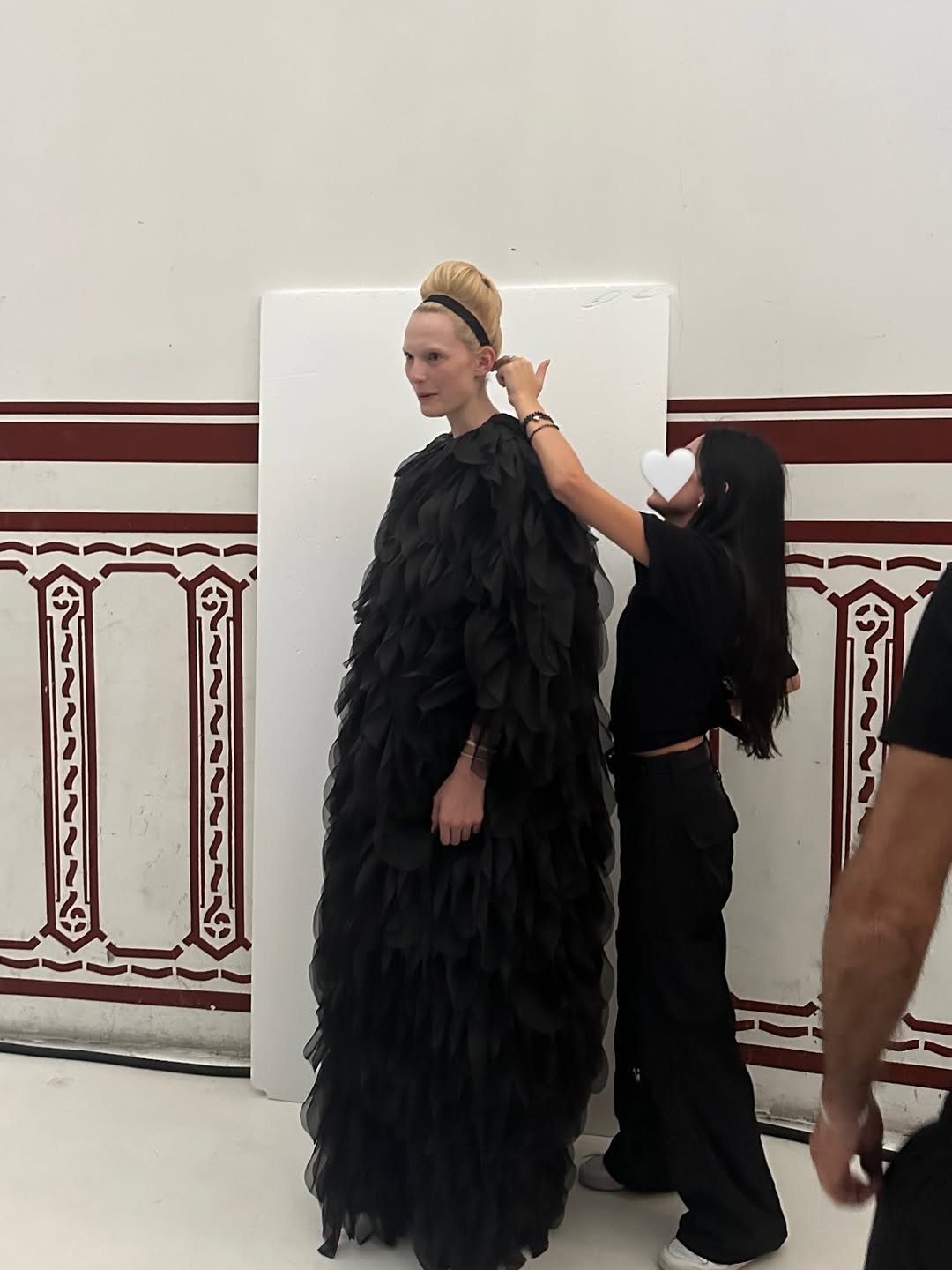 알렉스 콘사니가 런웨이에 오르기 전 룩 체크를 받고 있다. 룩 순서가 정리된 보드를 엿봤다. 모델들의 얼굴과 의상을 번갈아 보며 앞으로 펼쳐질 장면을 그려본다. 전체적으로 보니 클래식 트렌치코트의 다양한 변주가 이번 컬렉션의 중심임을 알 수 있었다. 힙 라인을 따라 흐르는 풍성한 장식, 수백 장의 조각을 접어 완성한 꽃잎 같은 오간자 스커트, 홀터넥 드레스로 변모한 트렌치코트 등. 거의 모든 룩에는 엘라스틱 벨트와 하네스 형태의 스트랩이 더해져 실루엣을 또렷하게 완성한다. 긴장감이 고조된다. 이제 쇼가 시작된다.