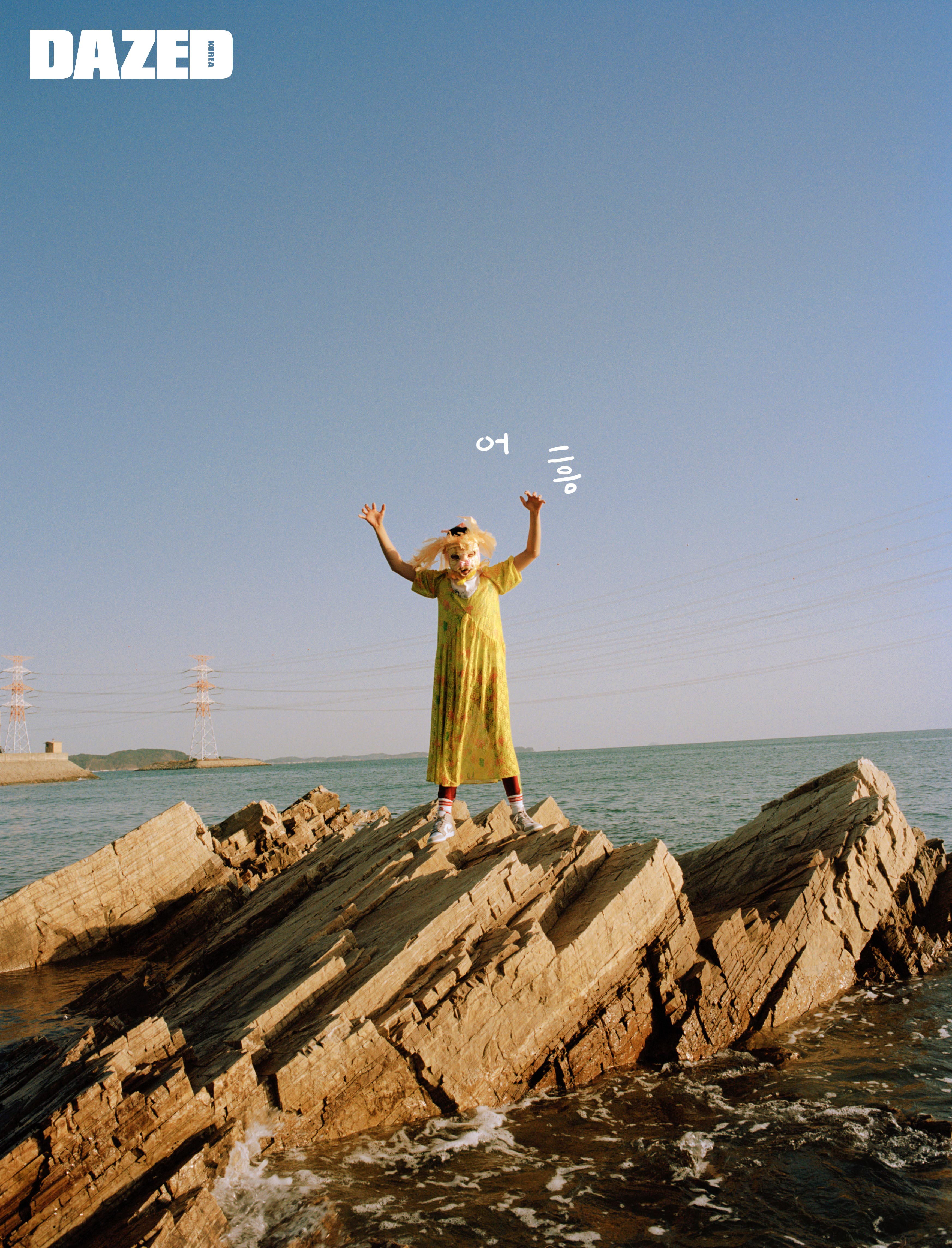 티셔츠는 킴 존스(Kim Jones), 그레이 스니커즈는 나이키(Nike), 헤드피스는 오성석(Oh Seongseok), 옐로 드레스와 레깅스, 삭스는 모두 에디터의 것.