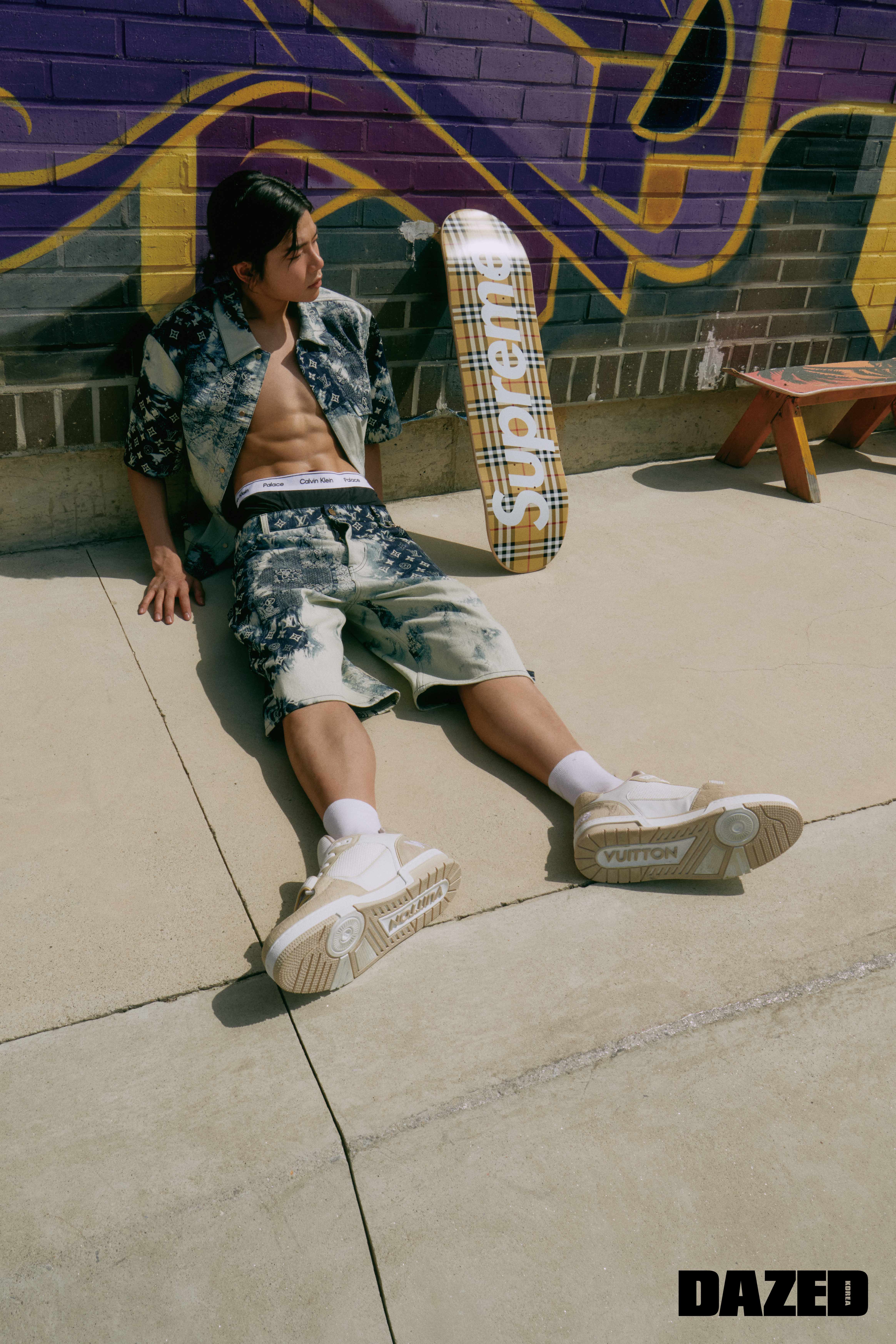 모노그램 프린트 하프 슬리브리스 재킷과 하프 팬츠, 트레이너 스니커즈는 모두 루이 비통(Louis Vuitton), 언더웨어는 돌체앤가바나(Dolce&Gabbana), 시그너처 패턴 프린트 덱은 버 버 리 × 슈 프 림(Burberry × Supreme), 보드와 삭스는 에디터의 것.