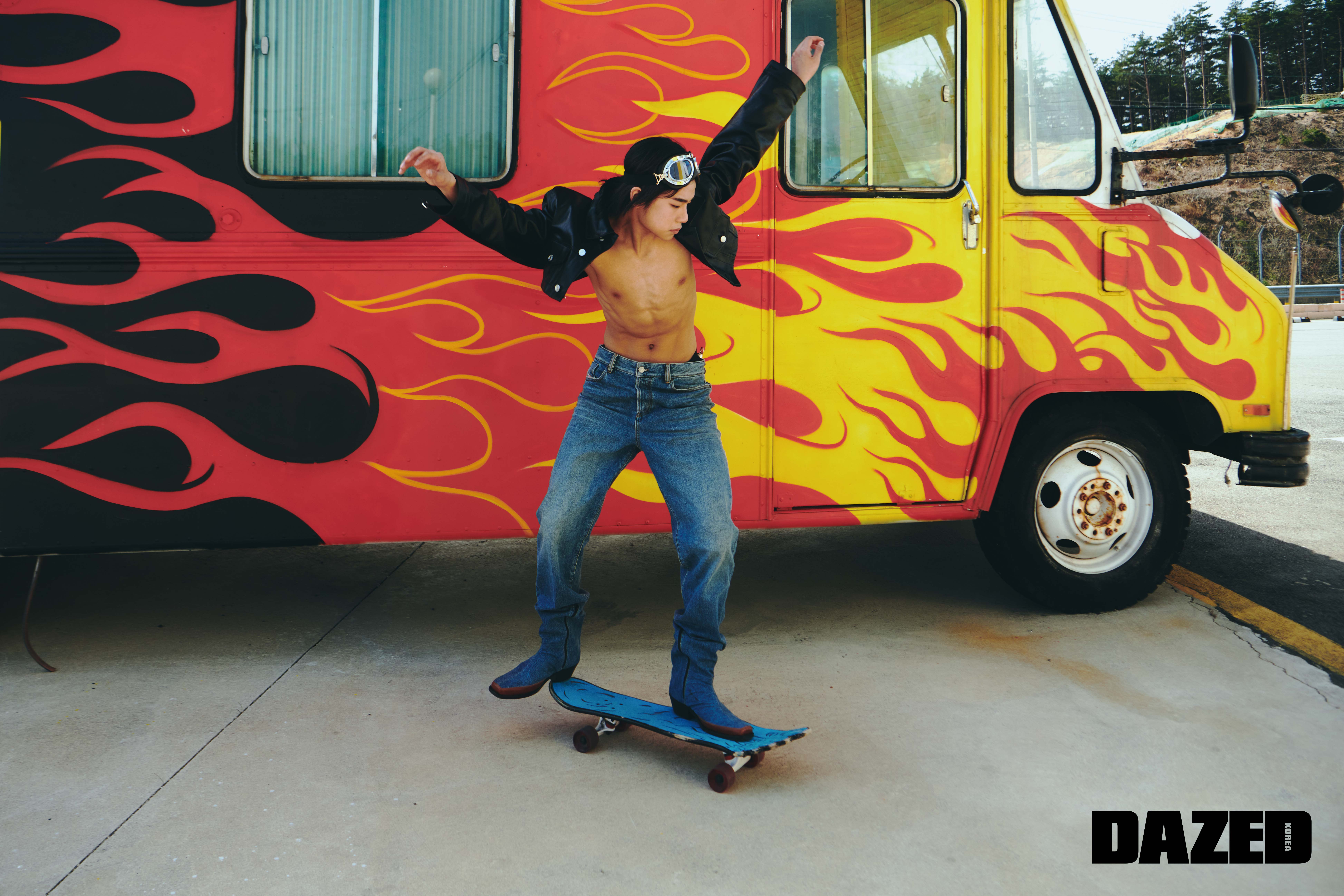 블랙 크롭트 레더 재킷과 언더웨어는 VTMNTS, 데님 팬타 부츠는 디젤(Diesel), 보드와 고글은 에디터의 것.