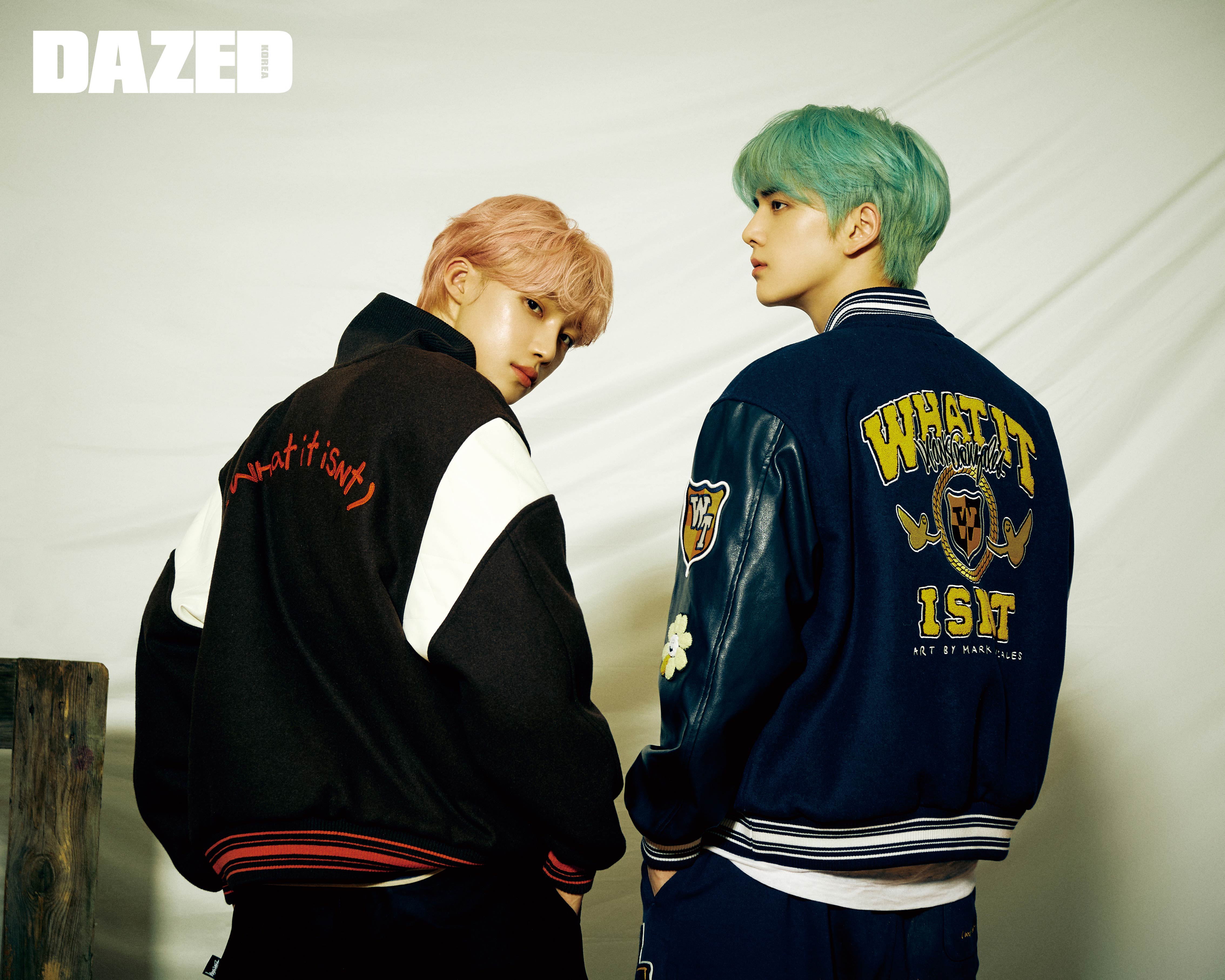 뉴가 입은 와릿이즌 패치가 돋보이는 블랙 컬러의 스타디움 재킷은 와릿이즌(What it isNt), 톱과 블랙 컬러 와이드 팬츠는 스타일리스트의 것. 영훈이 입은 와릿이즌 패치가 돋보이는 네이비 컬러의 스타디움 재킷과 스웨트팬츠는 와릿이즌(What it isNt), 톱은 스타일리스트의 것.
