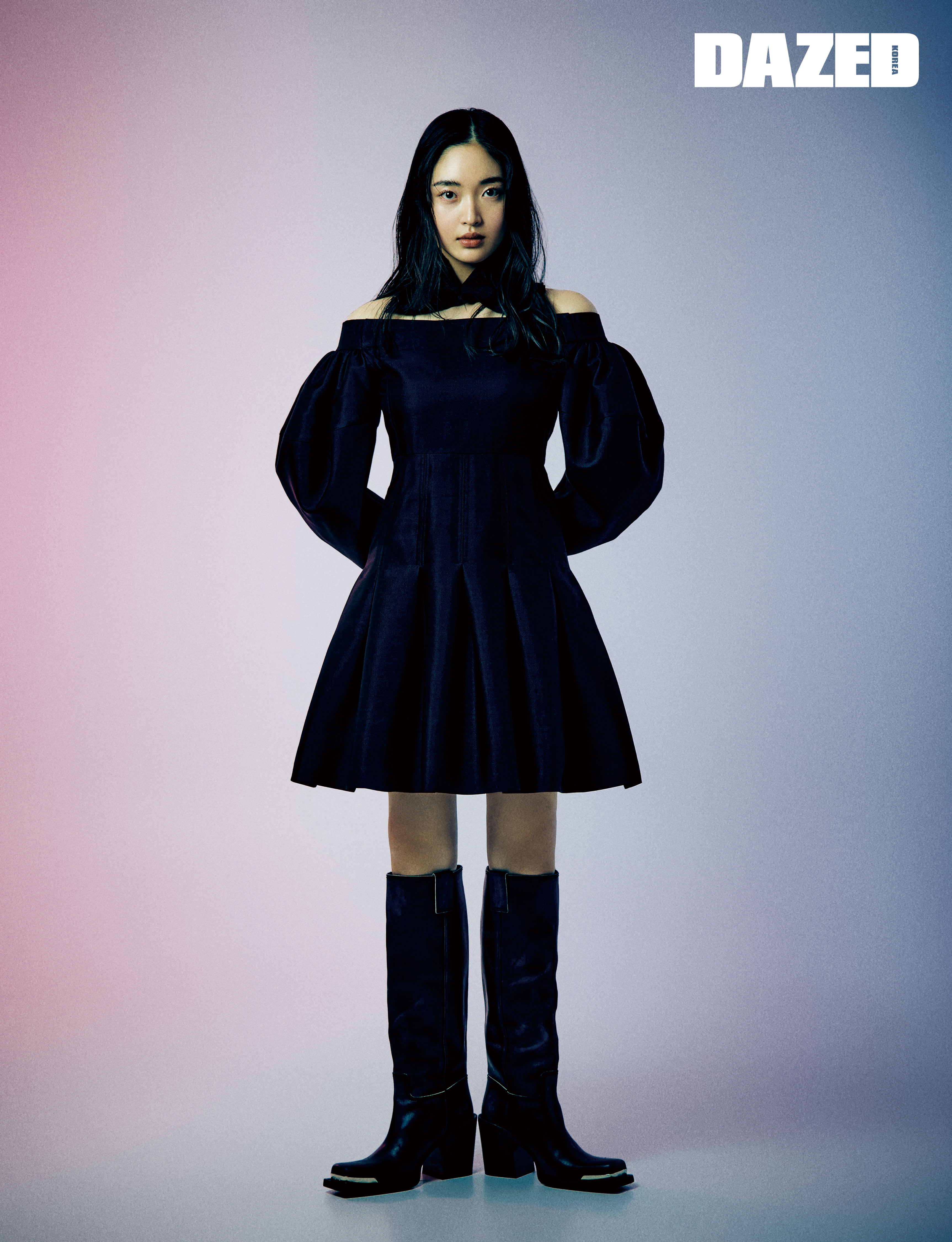 오프숄더 드레스는 방떼(Venté), 블랙 칼라는 로맨시크(Romanchic), 레더 부츠는 미우미우(Miu Miu).