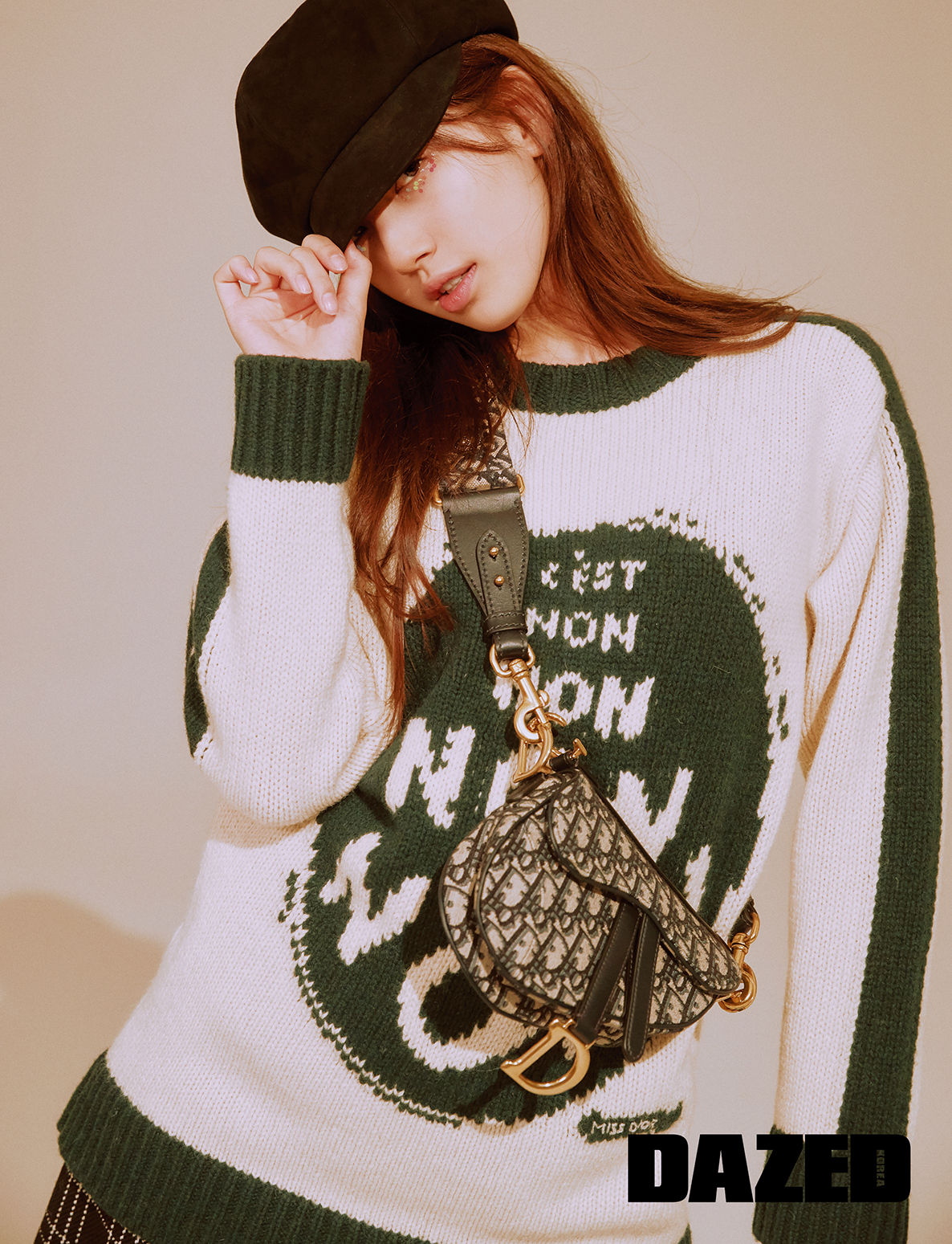 울과 캐시미어 소재의 니트, 체크 패턴 라이트 울 소재 팬츠, 샤이니 카프스킨 사이드 라인 하이 부츠, 고트 스킨 벨벳 소재의 디올 레볼루션 캡은 모두 디올(Dior).