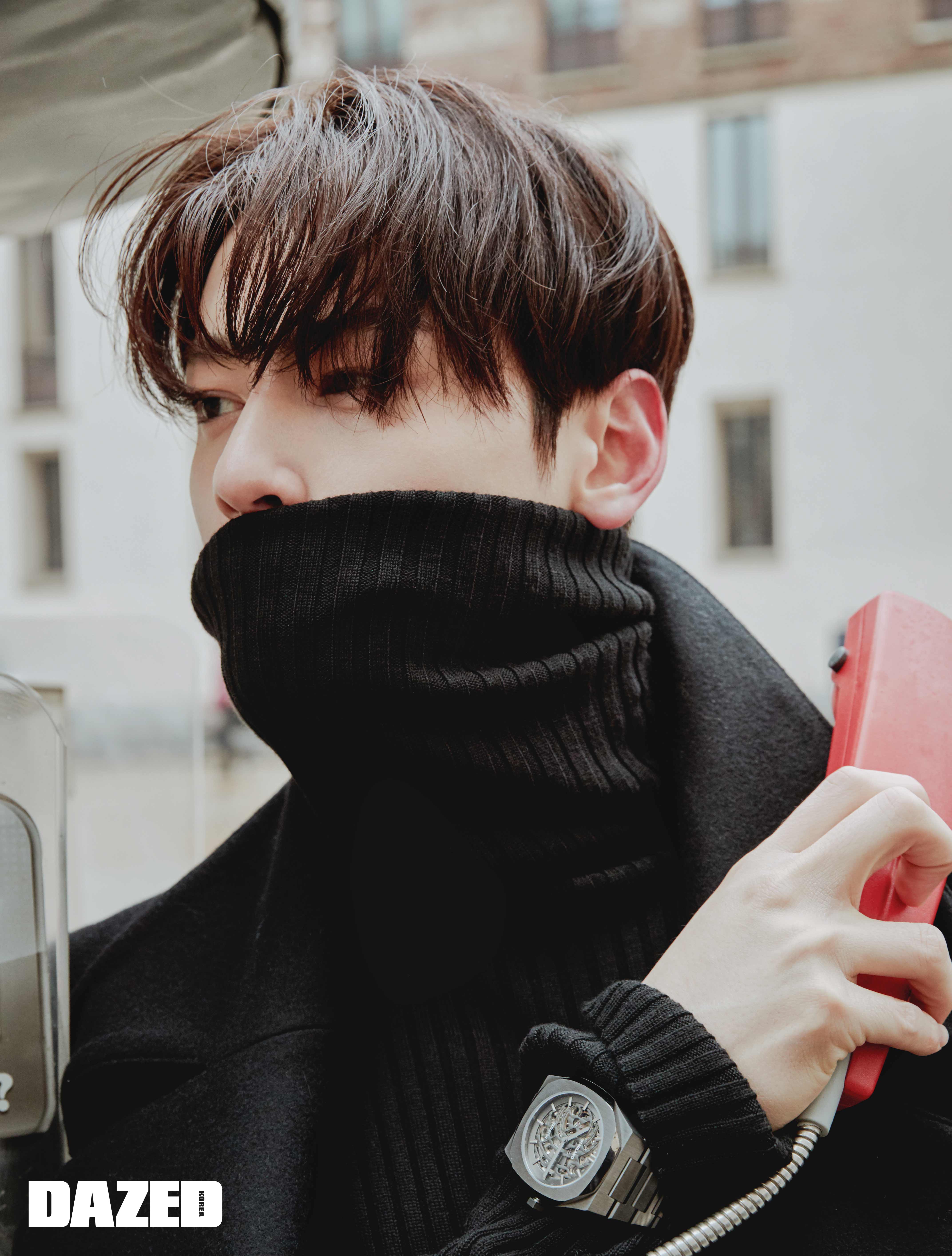코트는 르메르(Lemaire), 시스루 다이얼이 매력적인 스켈레톤 디자인의 워치는 디원밀라노(D1 MILANO), 안에 입은 터틀넥 톱과 카고 팬츠, 베레는 모두 스타일리스트의 것.