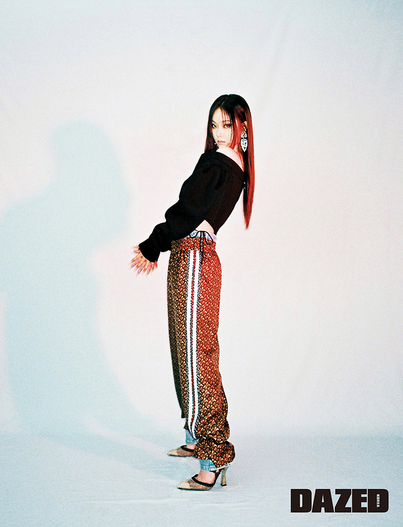 코르셋 라인의 오프숄더 톱과 토마스 버버리 모노그램 컬렉션의 패턴 트랙 팬츠는 버버리(Burberry), 이너로 입은 데님 팬츠는 리바이스(Levi’s), 볼드한 이어링은 엠포리오 아르마니(Emporio Armani), 스틸레토 힐은 펜디(Fendi).