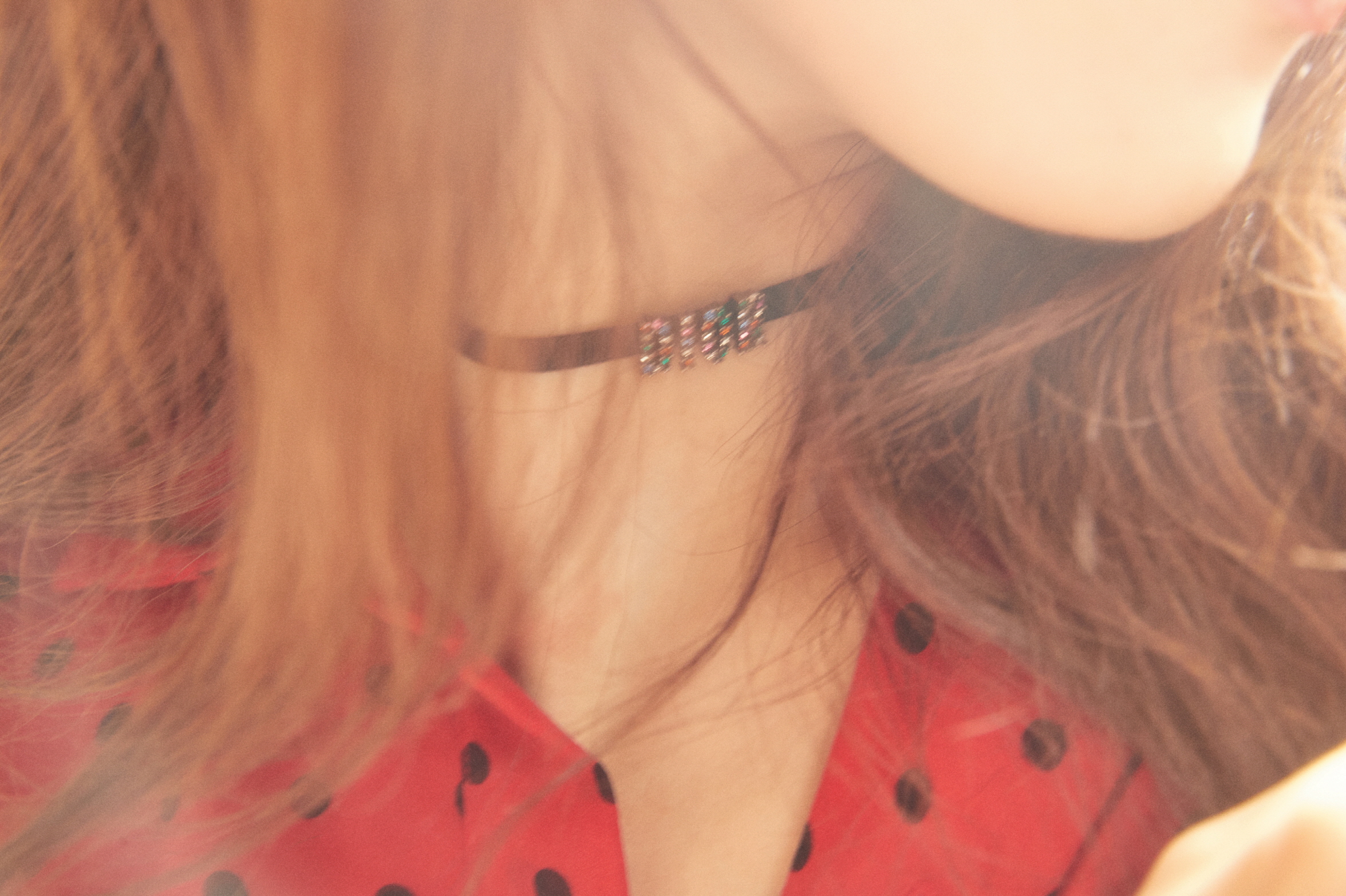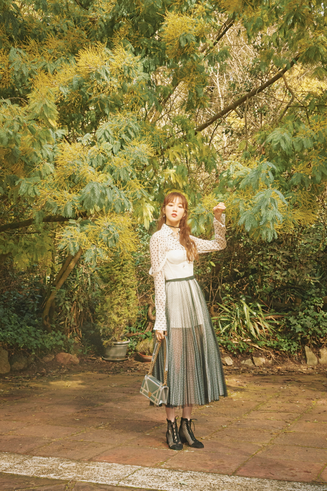 실크 도트 프린트 블라우스와 울 & 실크 프릴 스커트, 스톤 장식 초커는 모두 디올(Dior).