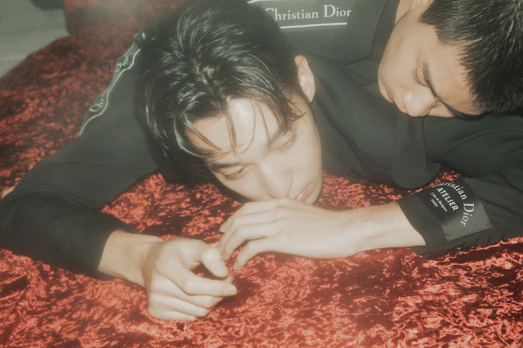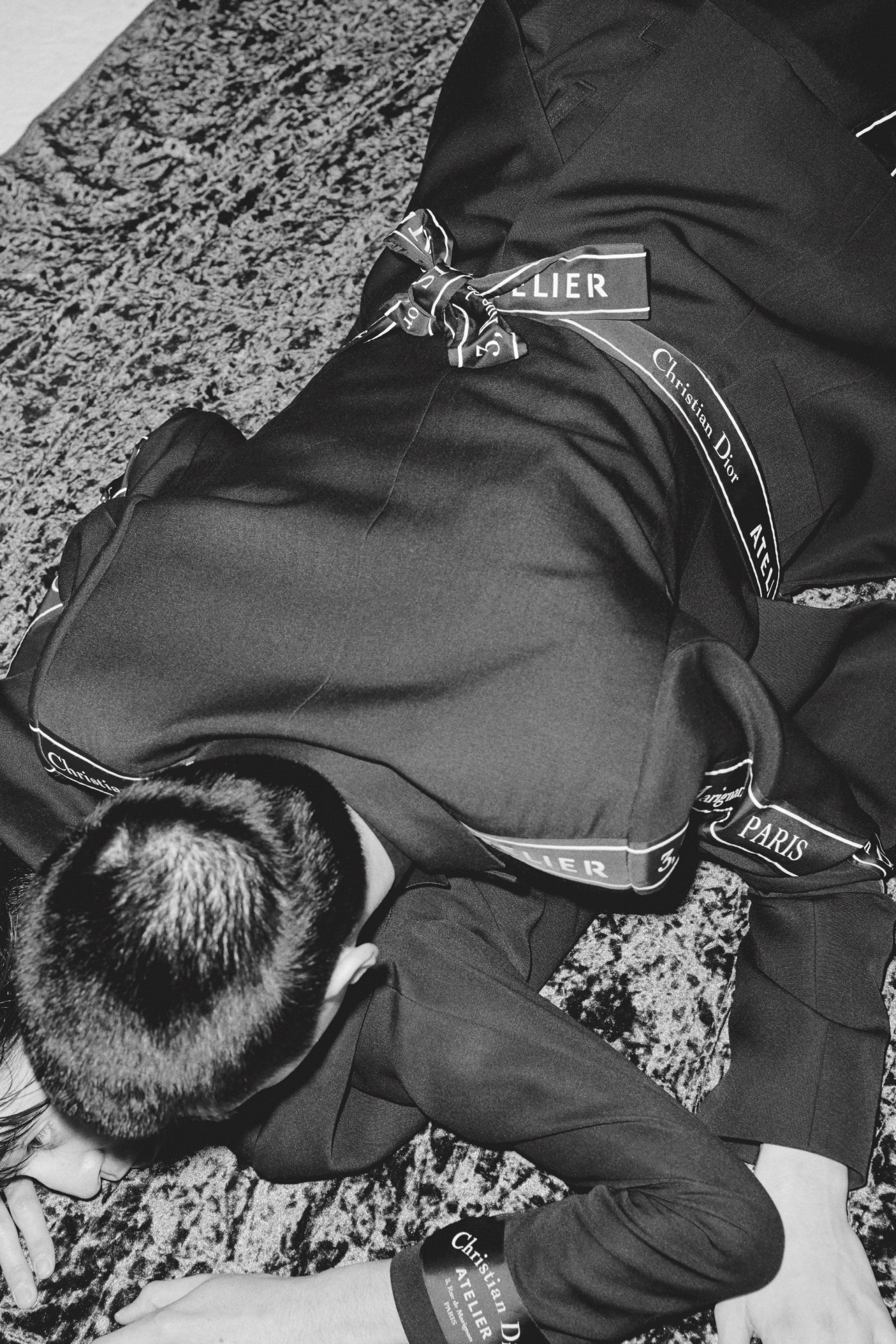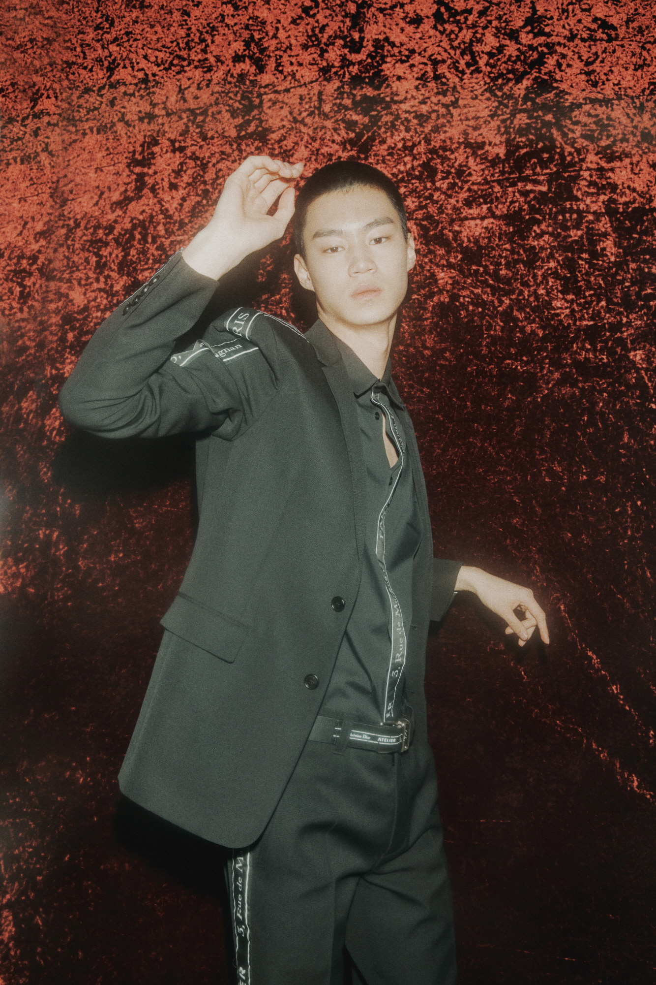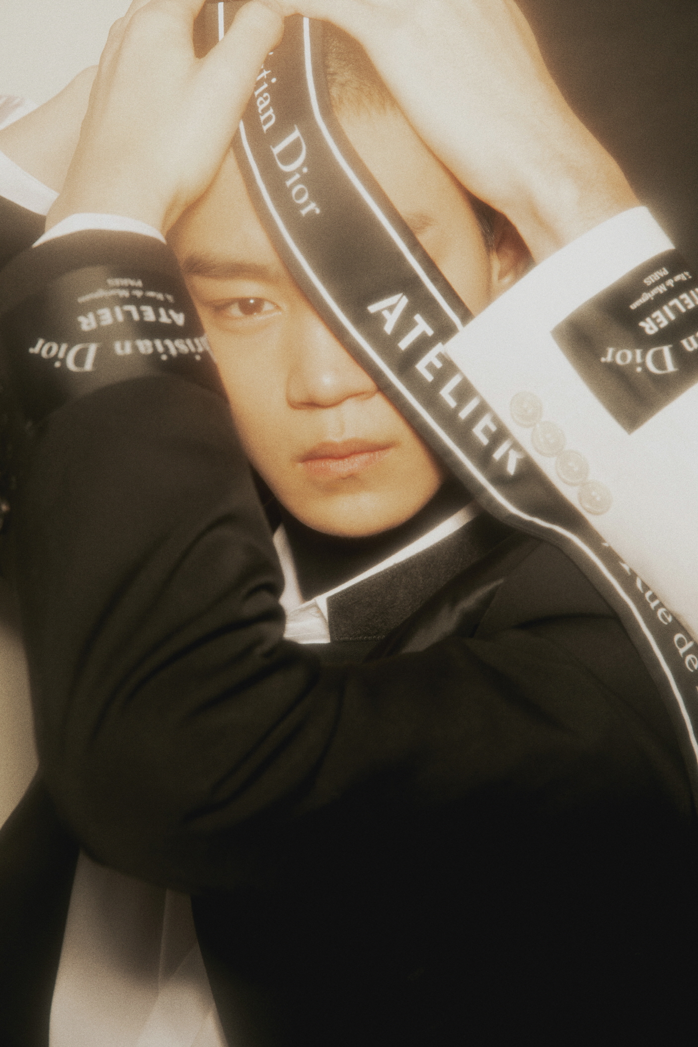 우석이 입은 ‘Christian Dior ATELIER’ 리본 장식의 블랙 울 오토만 투 버튼 재킷과 팬츠, 슬리브리스 셔츠, ‘Christian Dior ATELIER 3, rue de Marignan’ 프린트 송아지 가죽 35mm 벨트, B01 시그너처 장식의 블랙&화이트 송아지 가죽 스니커즈는 모두 디올 옴므(Dior Homme),