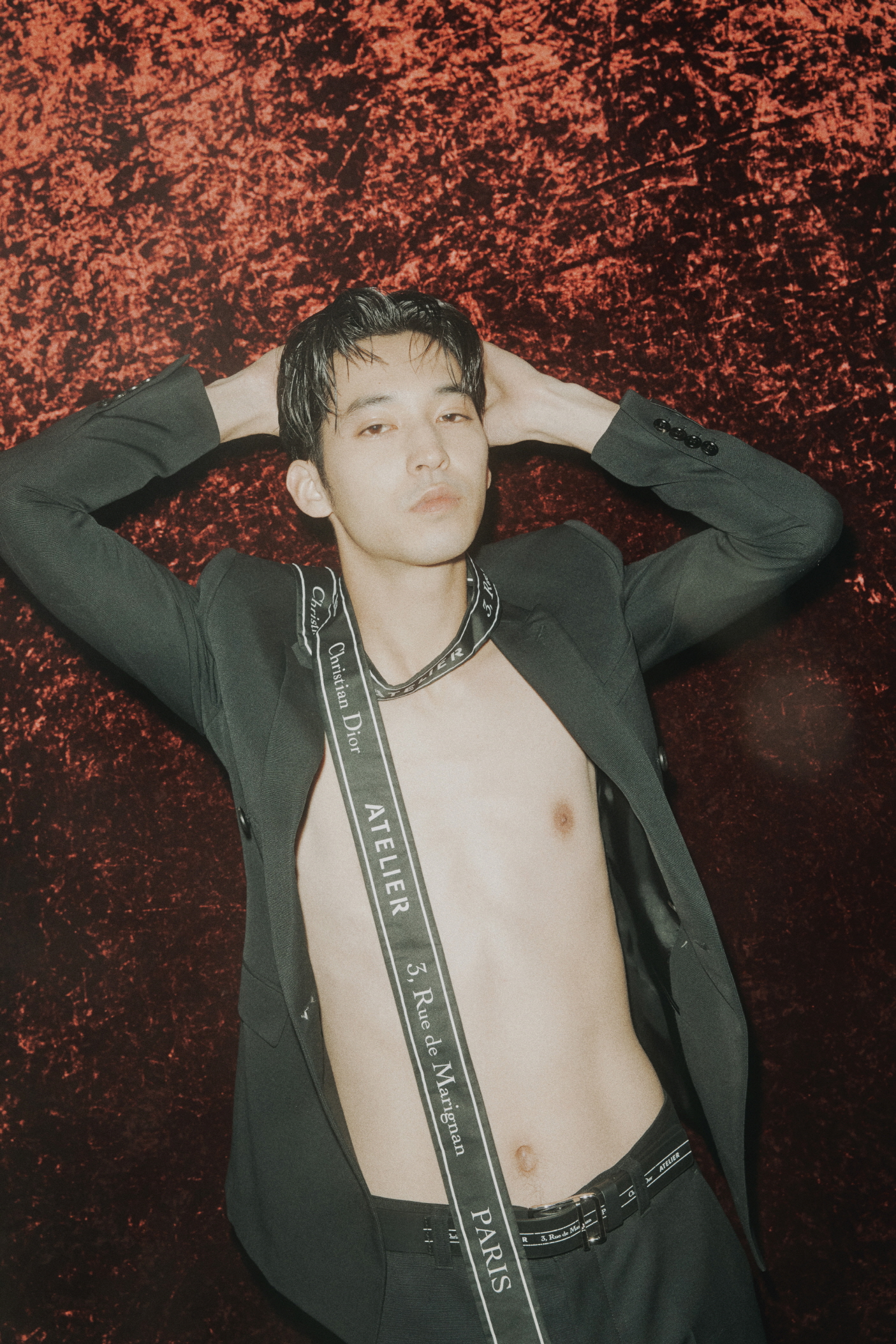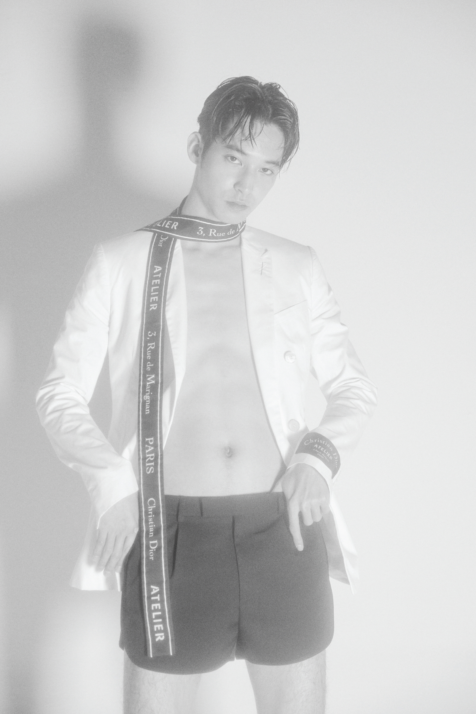 하야세가 입은 디올 옴므 헤리티지 칼라 장식의 울 슬리브리스 재킷과 팬츠, 소매 끝을 연상시키는 ‘Christian Dior ATELIER’ 라벨과 혼 버튼을 이용해 ‘테일러’ 버전으로 재해석한 블랙 울 스카프는 모두 디올 옴므(Dior Homme),