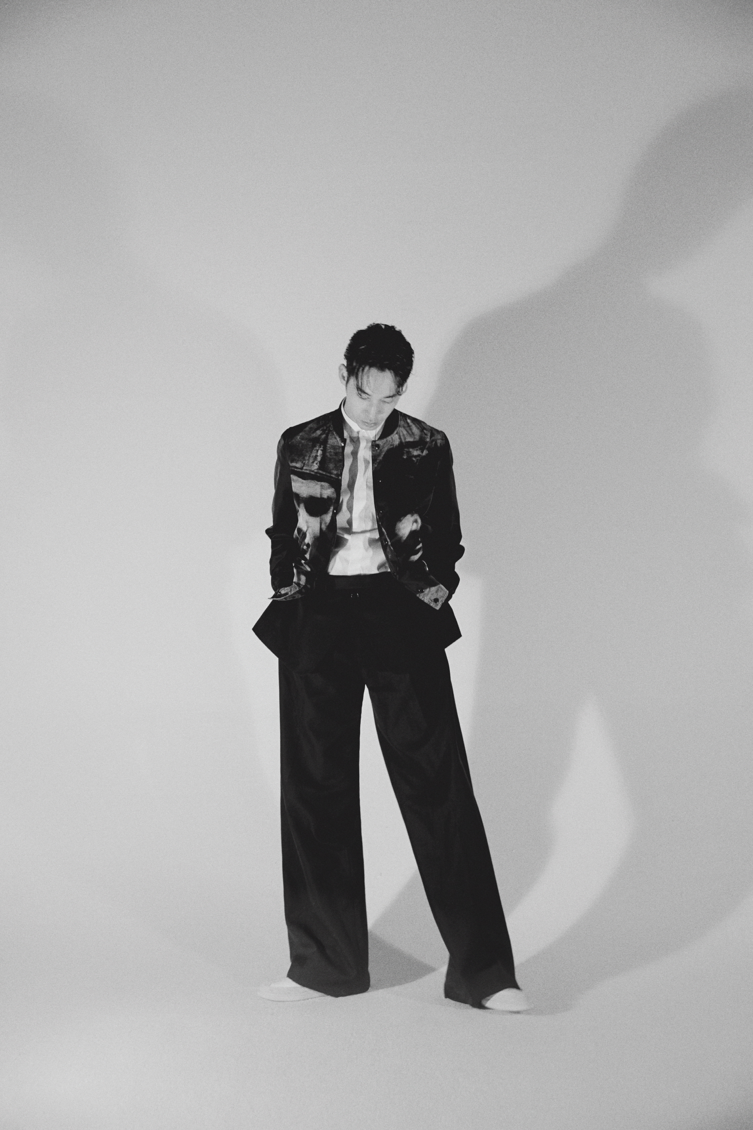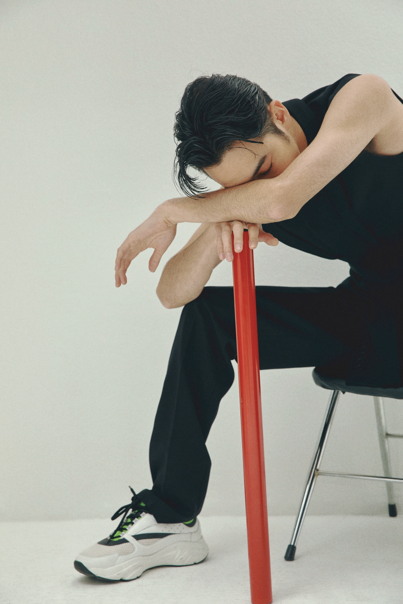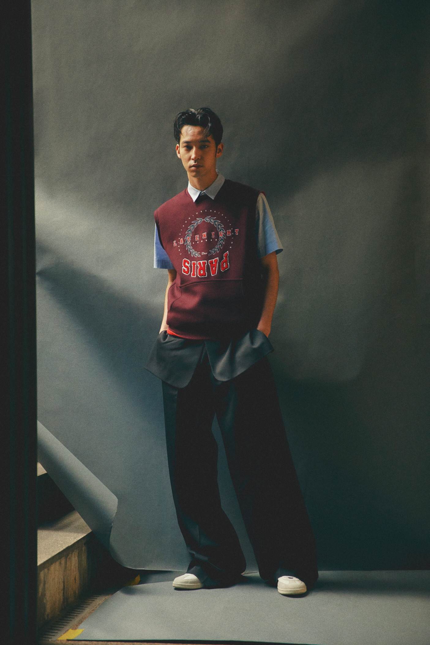하야세가 입은 더블 코튼 저지 버건디 슬리브리스 스웨트셔츠, 스트레치 코튼 쇼트 슬리브 셔츠, 허리 밴드에 장식한 재킷 바스크가 멋스러운 블랙 울 오토만 플리츠 와이드 팬츠, B01 시그너처 장식의 블랙&화이트 송아지 가죽 스니커즈는 모두 디올 옴므(Dior Homme).