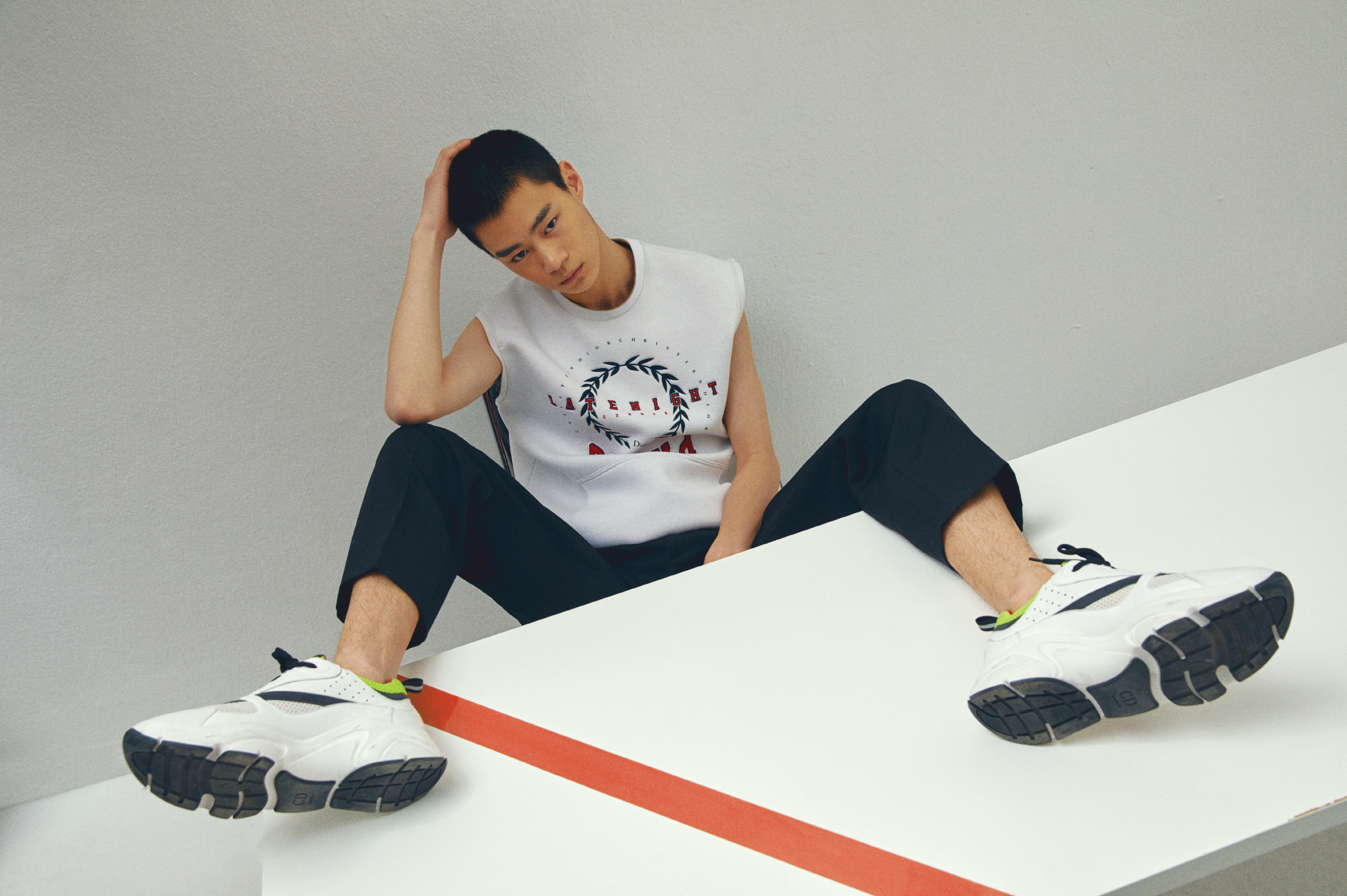 더블 코튼 저지 화이트 슬리브리스 스웨트셔츠, 허리 밴드에 장식한 재킷 바스크가 멋스러운 블랙 울 오토만 소재 플리츠 와이드 팬츠, ‘Dior Homme’ 시그너처 장식의 블랙 송아지 가죽과 레드&화이트 테크니컬 니트 스니커즈는 모두 디올 옴므(Dior Homme).