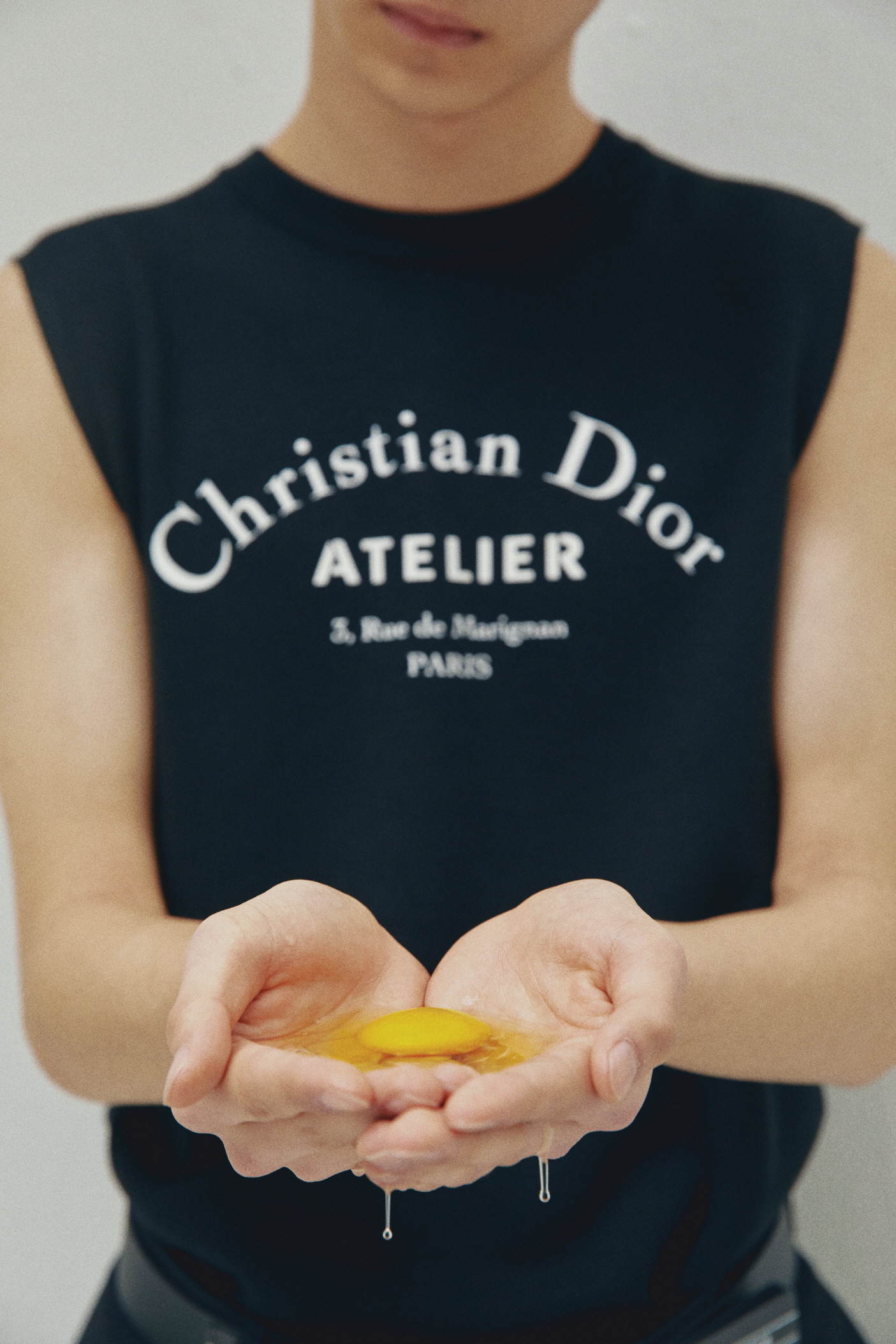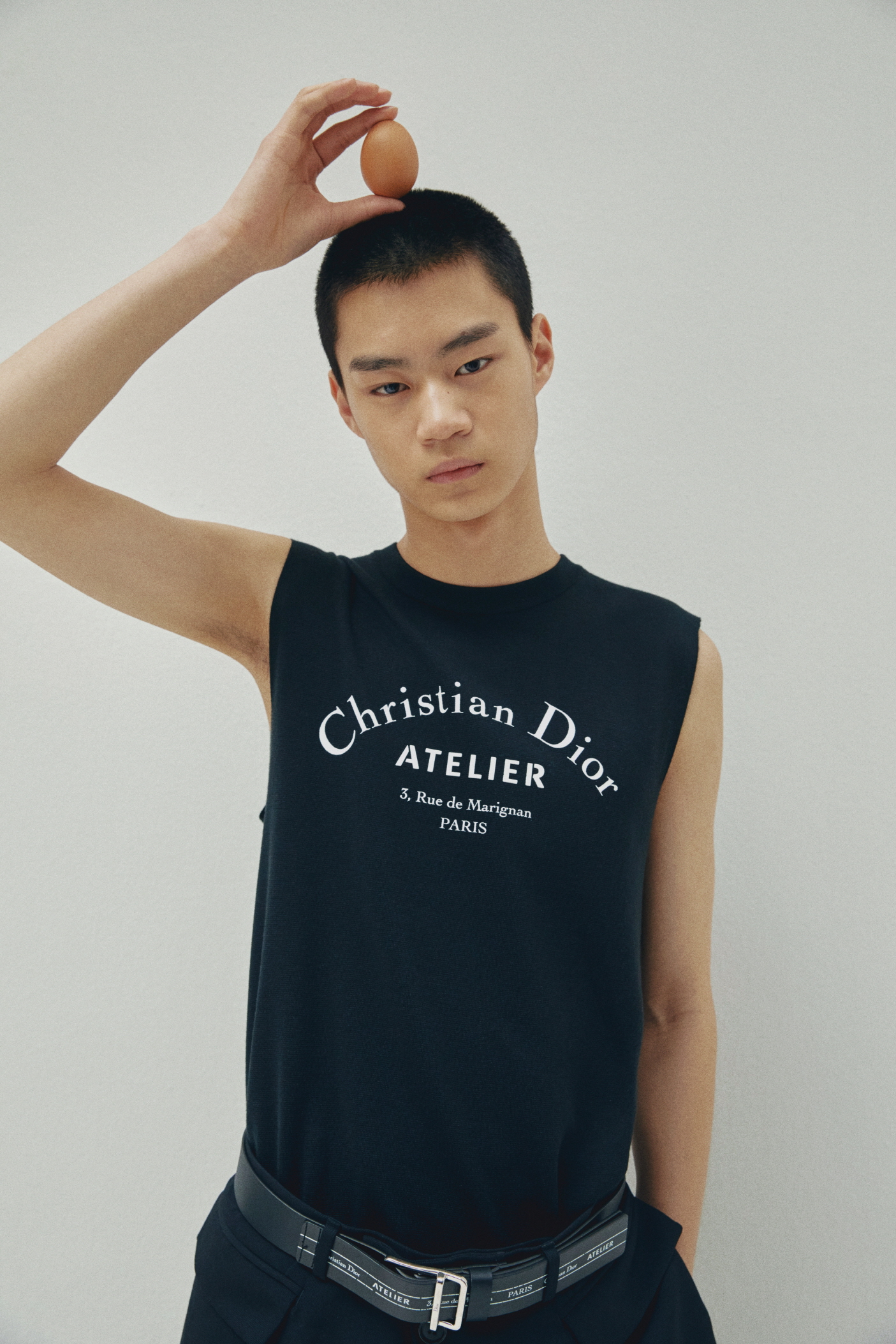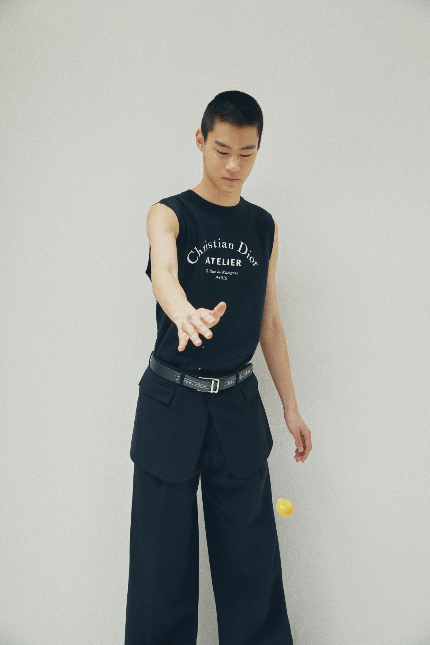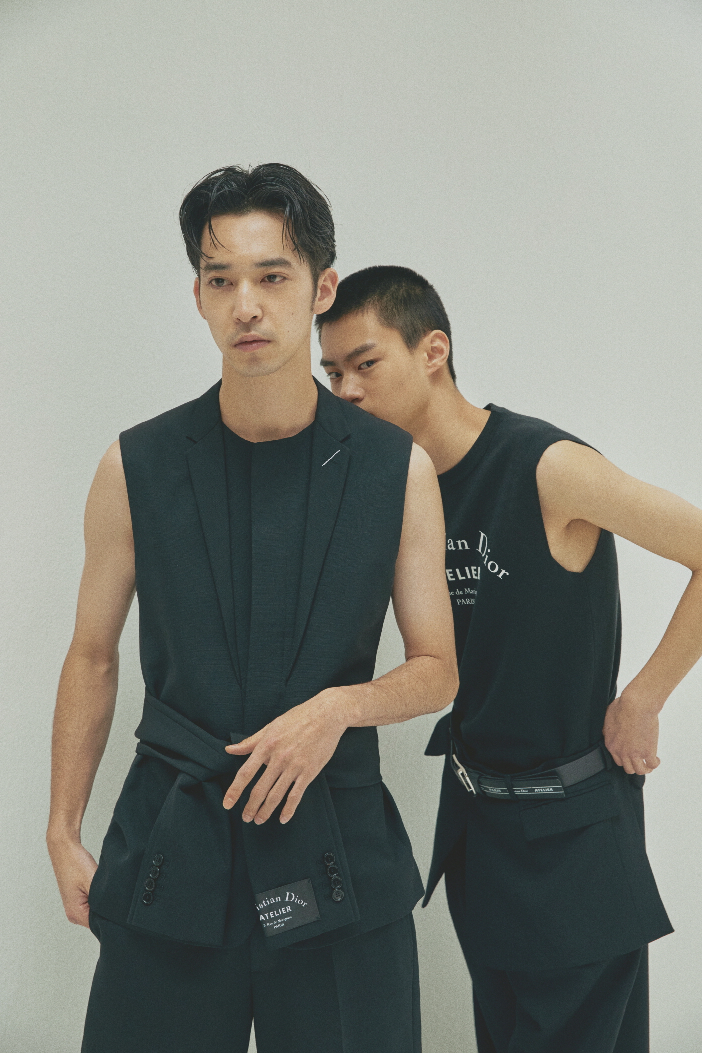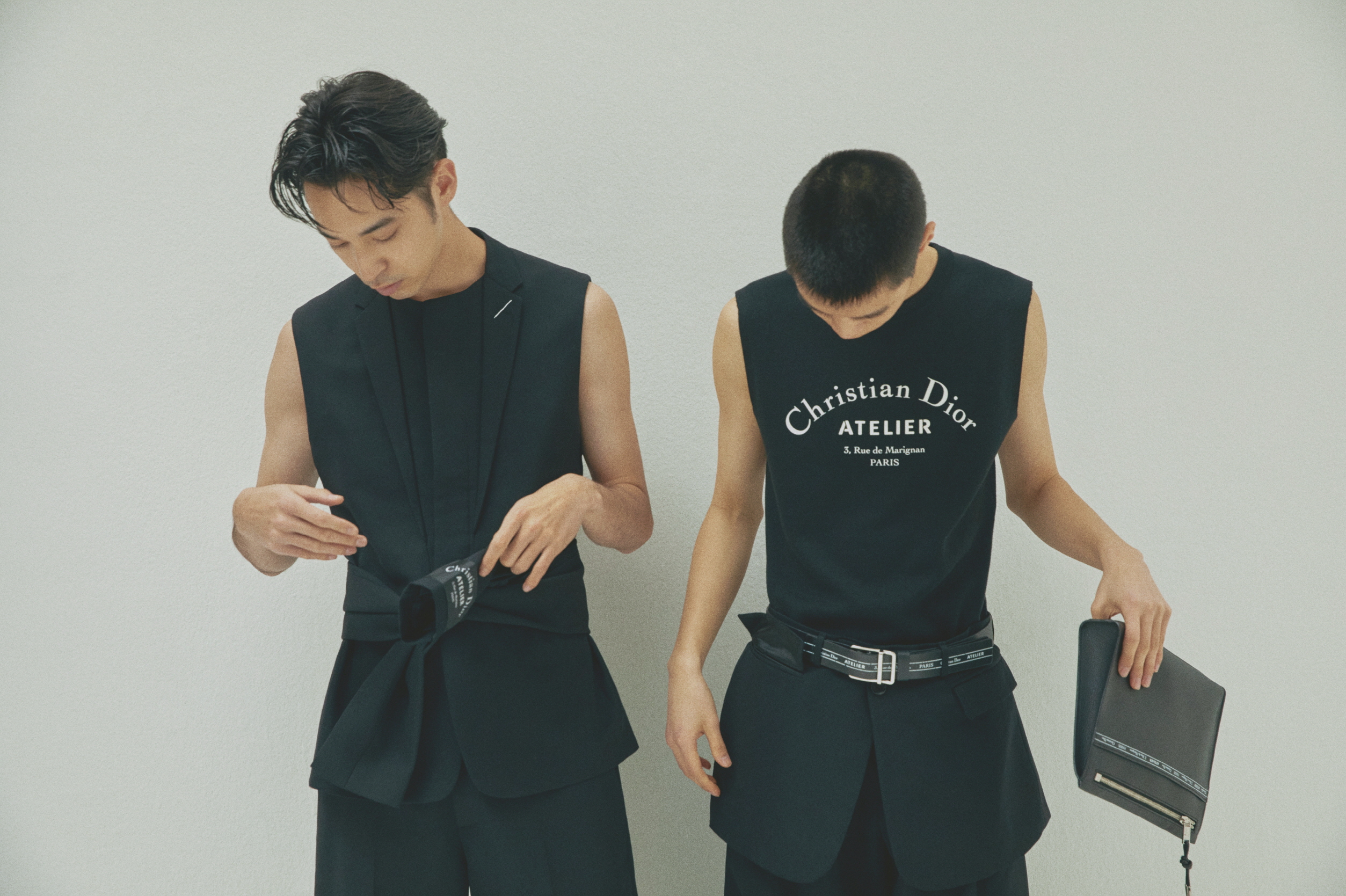 가슴에 장식한 ‘Christian Dior ATELIER’ 프린트가 돋보이는 블랙 슬리브리스 스웨트셔츠, 허리 밴드에 장식한 재킷 바스크가 멋스러운 블랙 울 오토만 플리츠 와이드 팬츠, ‘Christian Dior ATELIER 3, rue de Marignan’ 프린트 송아지 가죽 35mm 벨트는 모두 디올 옴므(Dior Homme).