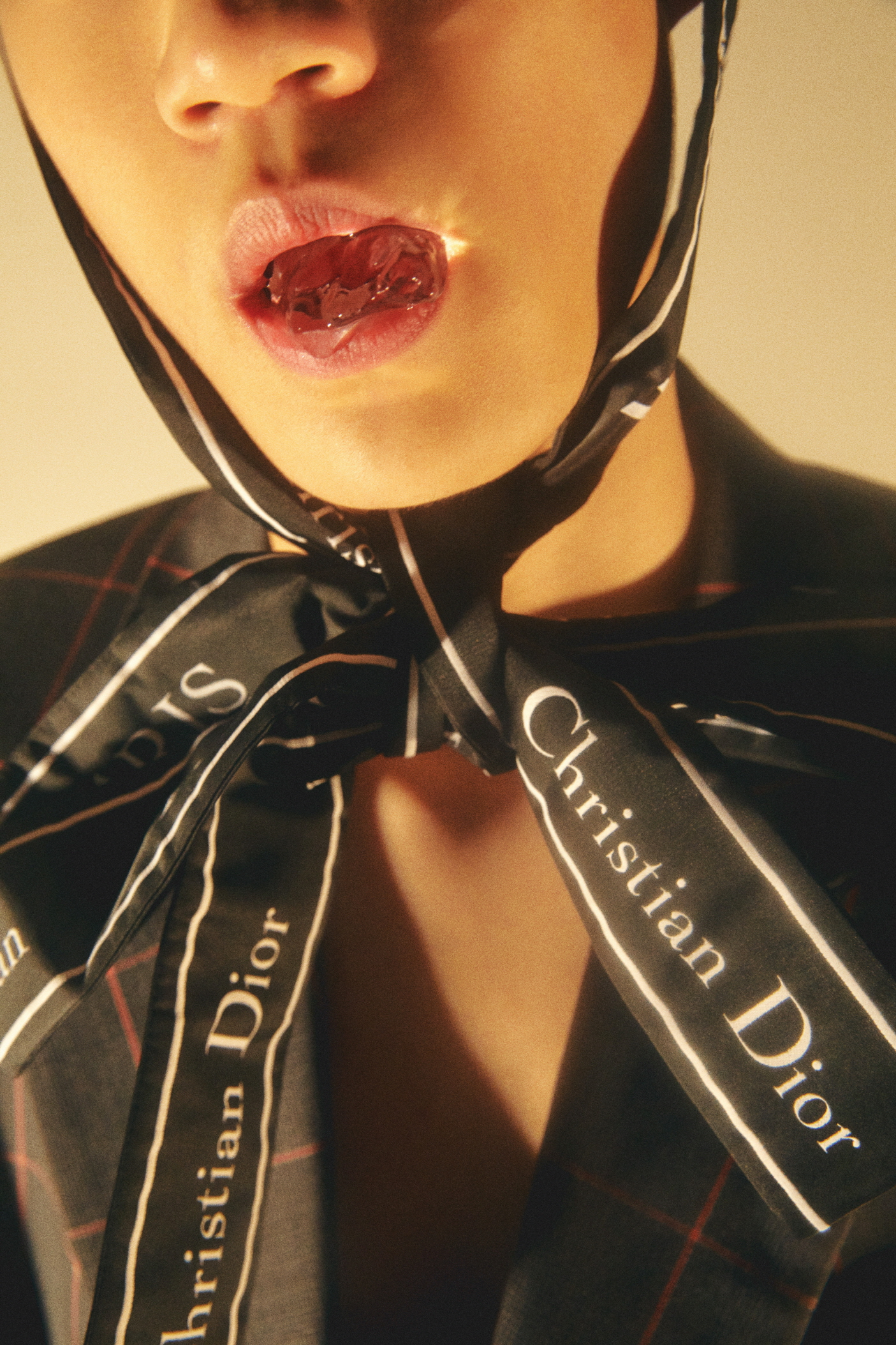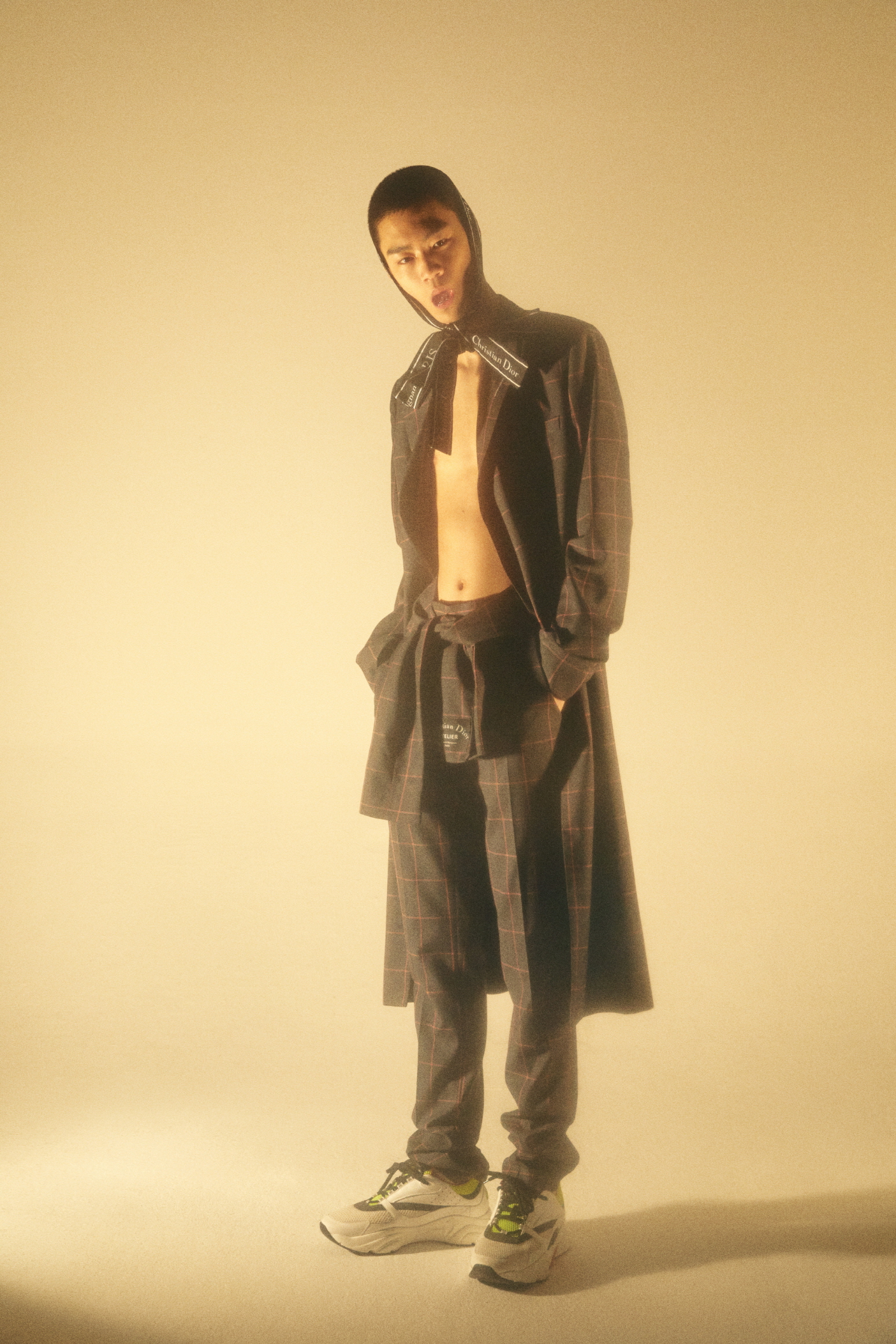 레드 체크 울 저지 그레이 더블브레스트 롱 코트와 팬츠, 허리춤에 멘 웨이스트 스카프, 헤어 액세서리로 감싼 ‘Christian Dior ATELIER’ 모티브의 섬세한 새틴 스카프, ‘Dior Homme’ 시그너처 장식의 블랙 송아지 가죽과 레드&화이트 테크니컬 니트 스니커즈는 모두 디올 옴므(Dior Homme).