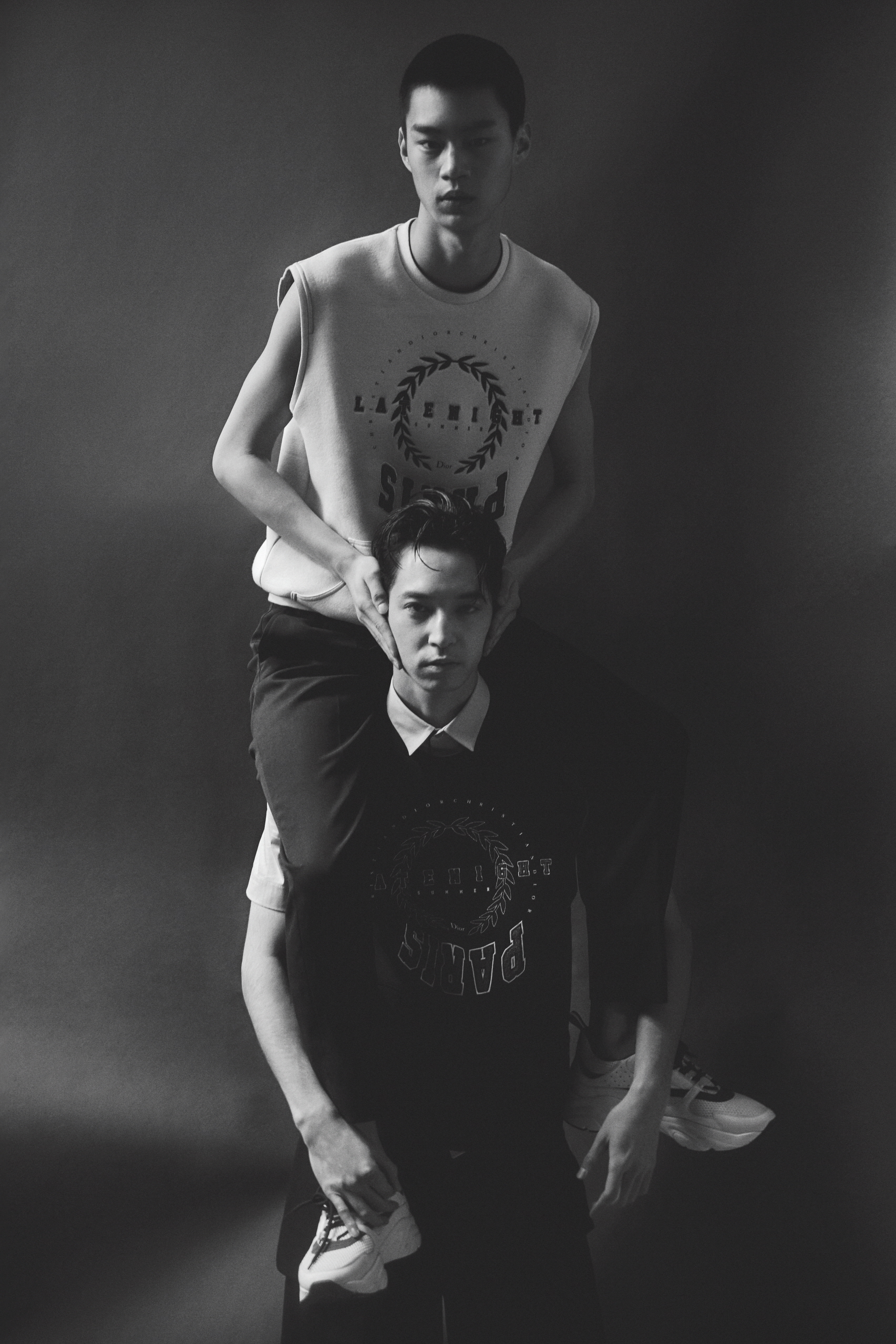 우석이 입은 가슴의 ‘Christian Dior ATELIER’ 프린트가 돋보이는 블랙 슬리브리스 스웨트셔츠, 허리 밴드에 장식한 재킷 바스크가 멋스러운 블랙 울 오토만 플리츠 와이드 팬츠, ‘Christian Dior ATELIER 3, rue de Marignan’ 프린트 송아지 가죽 35mm 벨트, 손에 쥔 ‘Dior Homme’, ‘ATELIER’ 프린트의 블랙 그레인 송아지 가죽 서류가방은 모두 디올 옴므(Dior Homme).