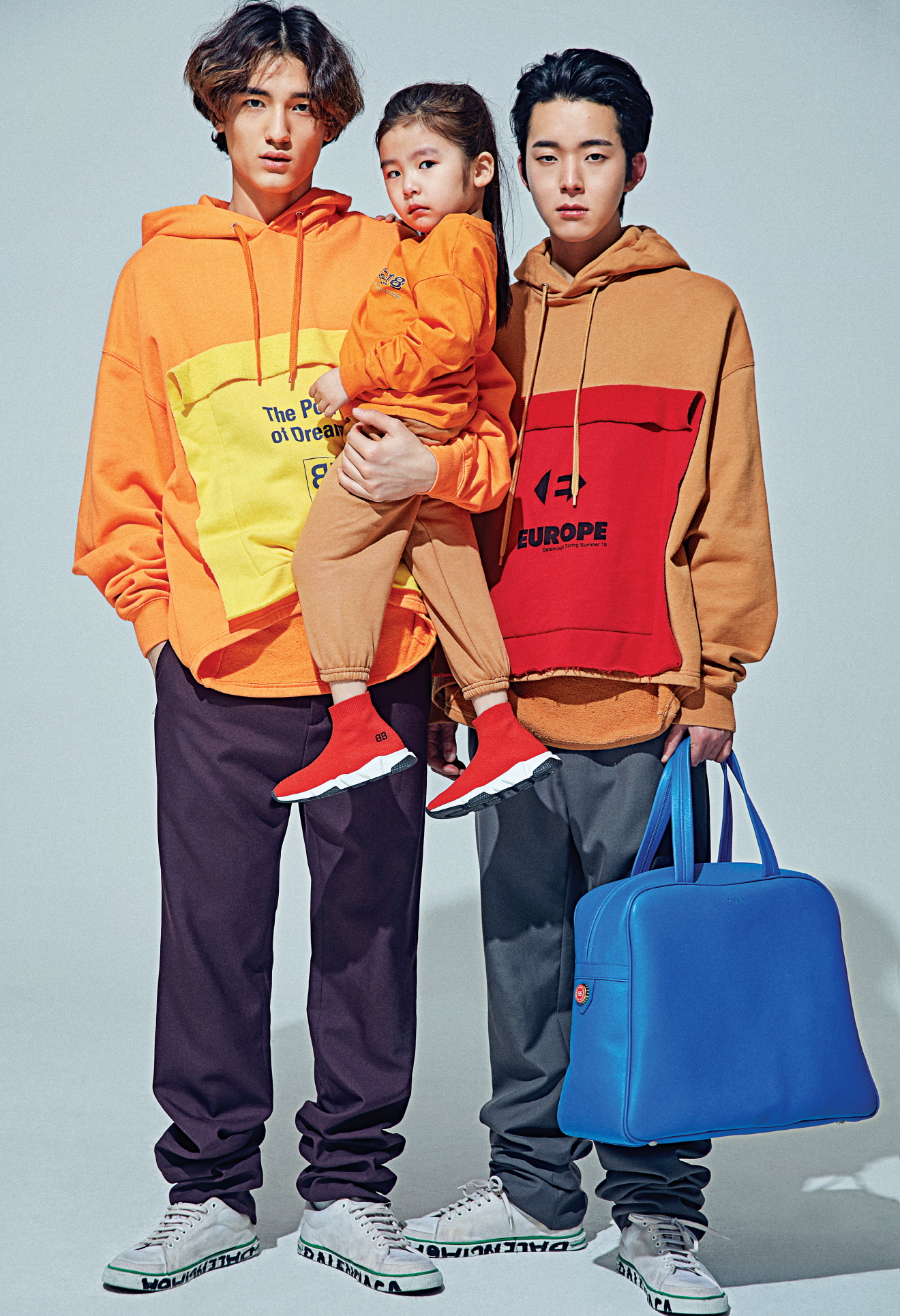 원진이 입은 ‘EUROPE’ 후디, 웨이브 로고 조깅 팬츠, 스피드 러너는 모두 발렌시아가(Balenciaga).