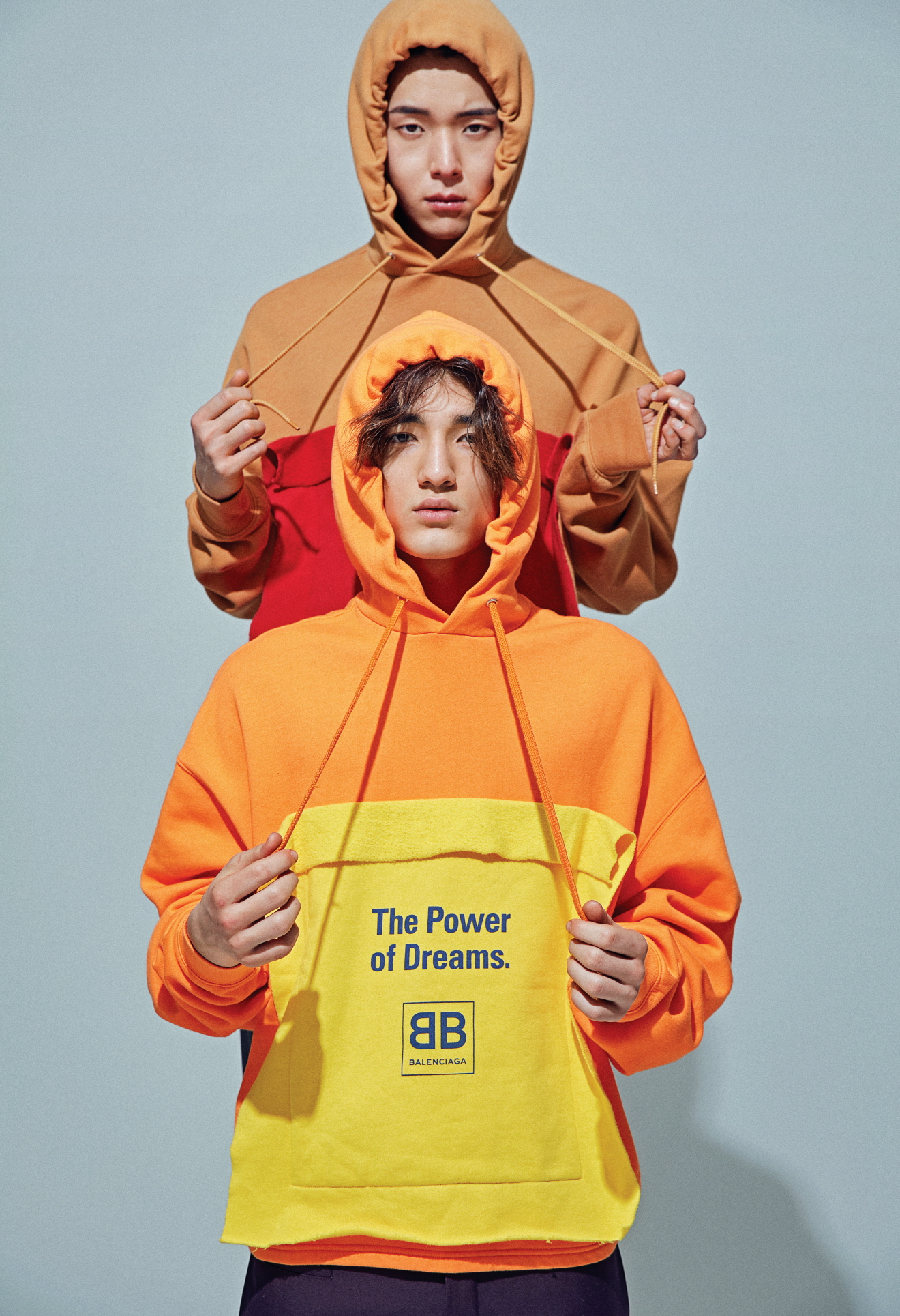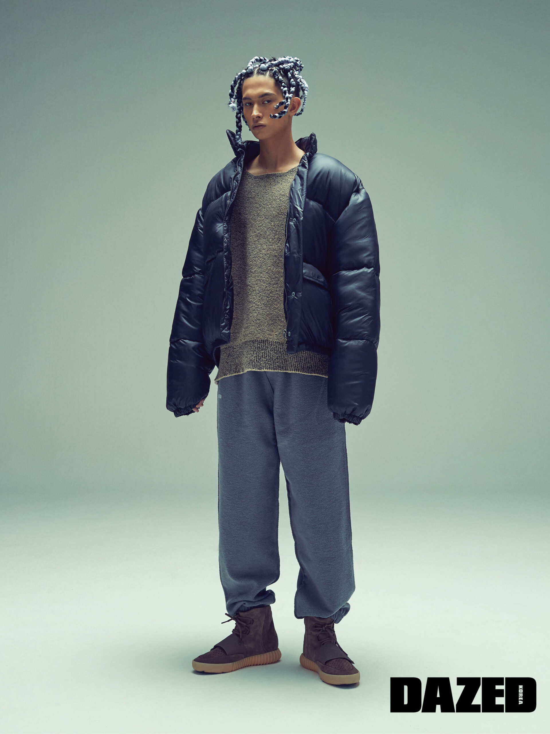 원진이 입은 ‘DREAM’ 저지 티셔츠, BB 로고 조깅 팬츠, 스피드 트레이너는 모두 발렌시아가(Balenciaga).