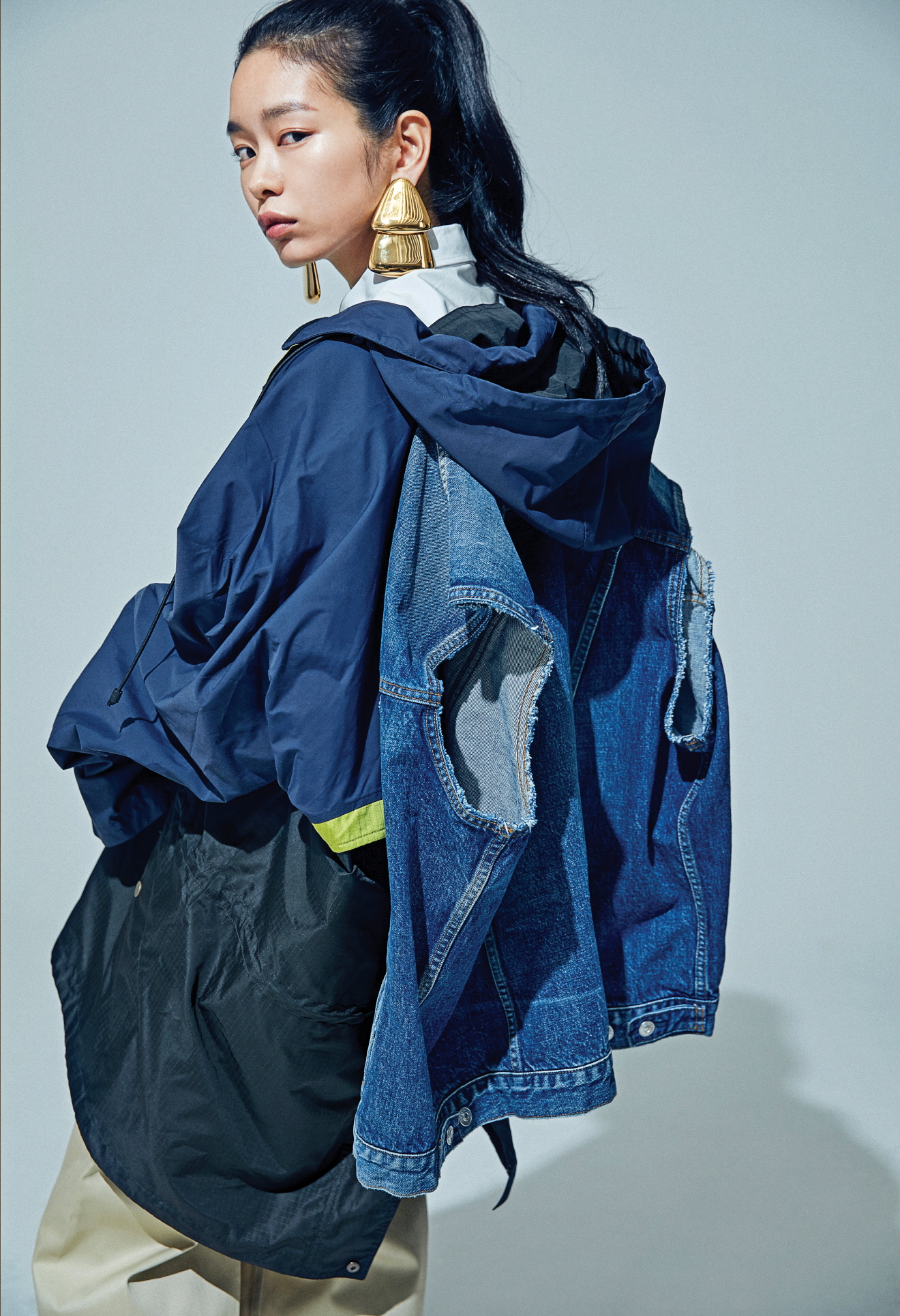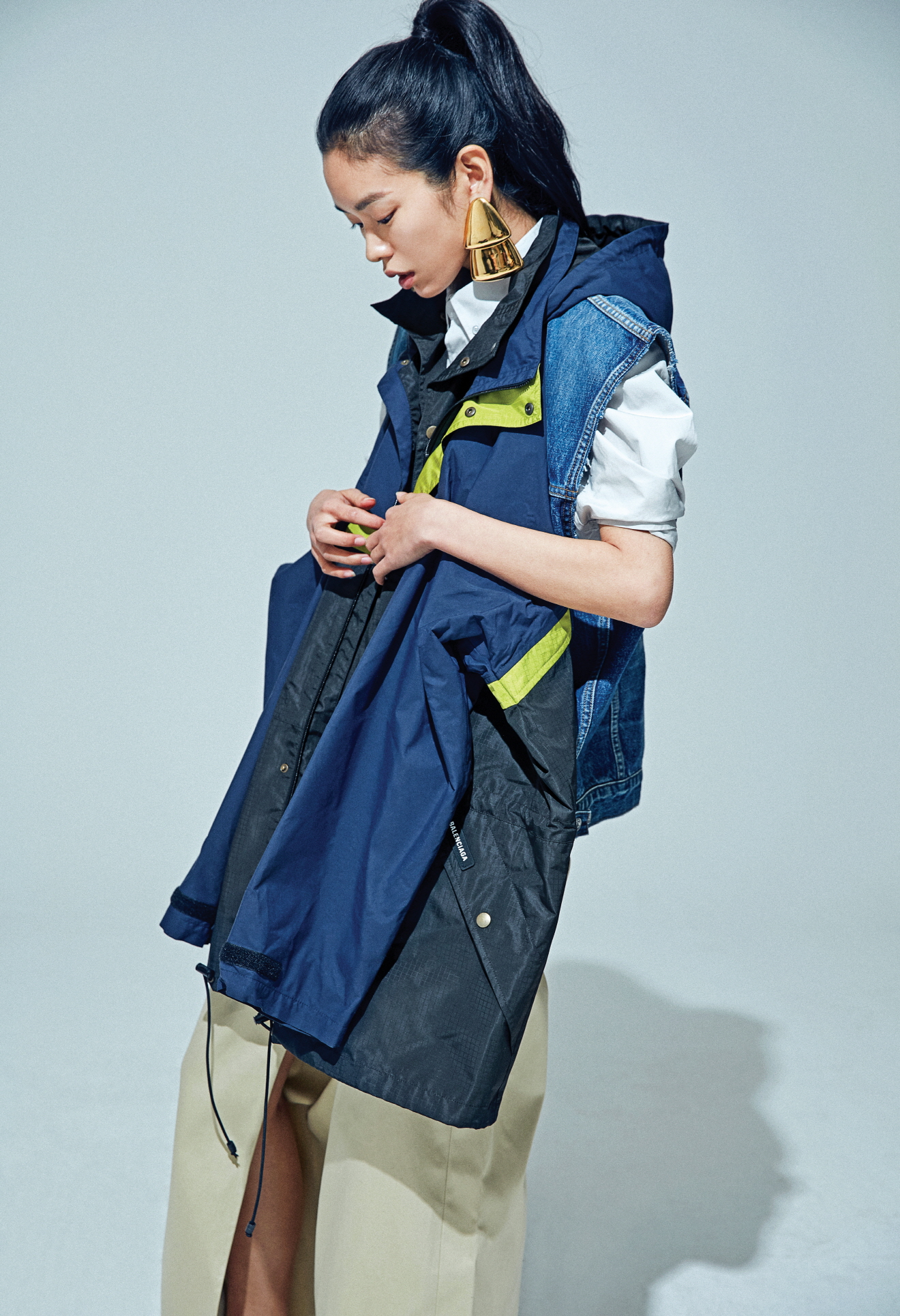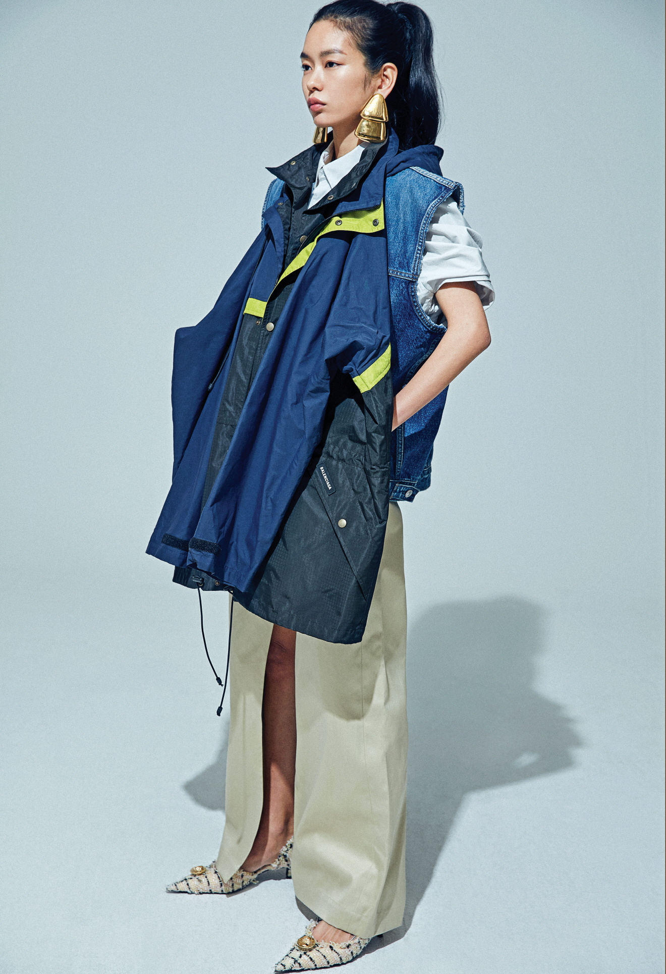 재킷과 베스트를 결합한 하이브리드 더블 파카 데님 재킷, 랩 치노 팬츠, 트위드 펌프스, 이어링은 모두 발렌시아가(Balenciaga).