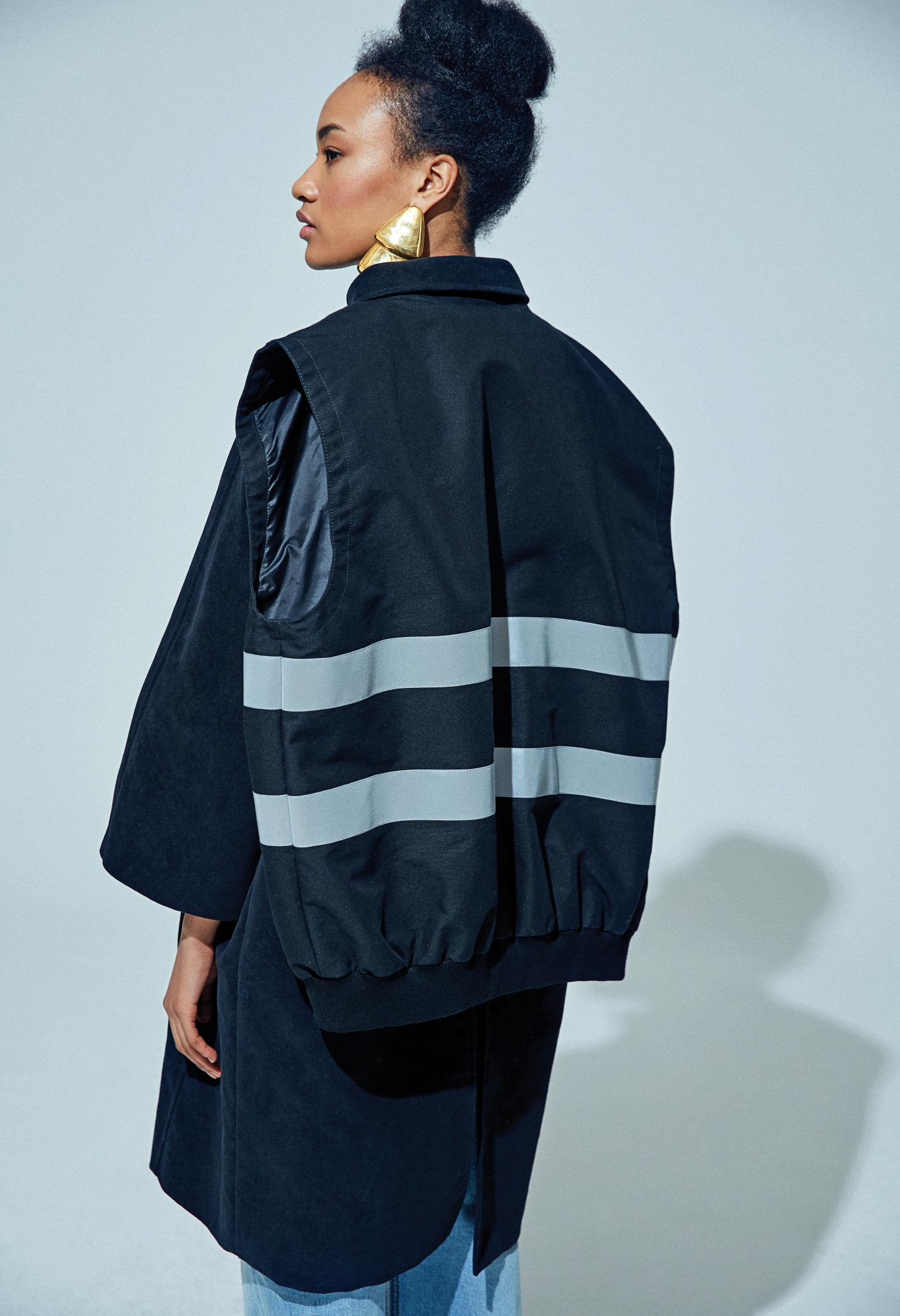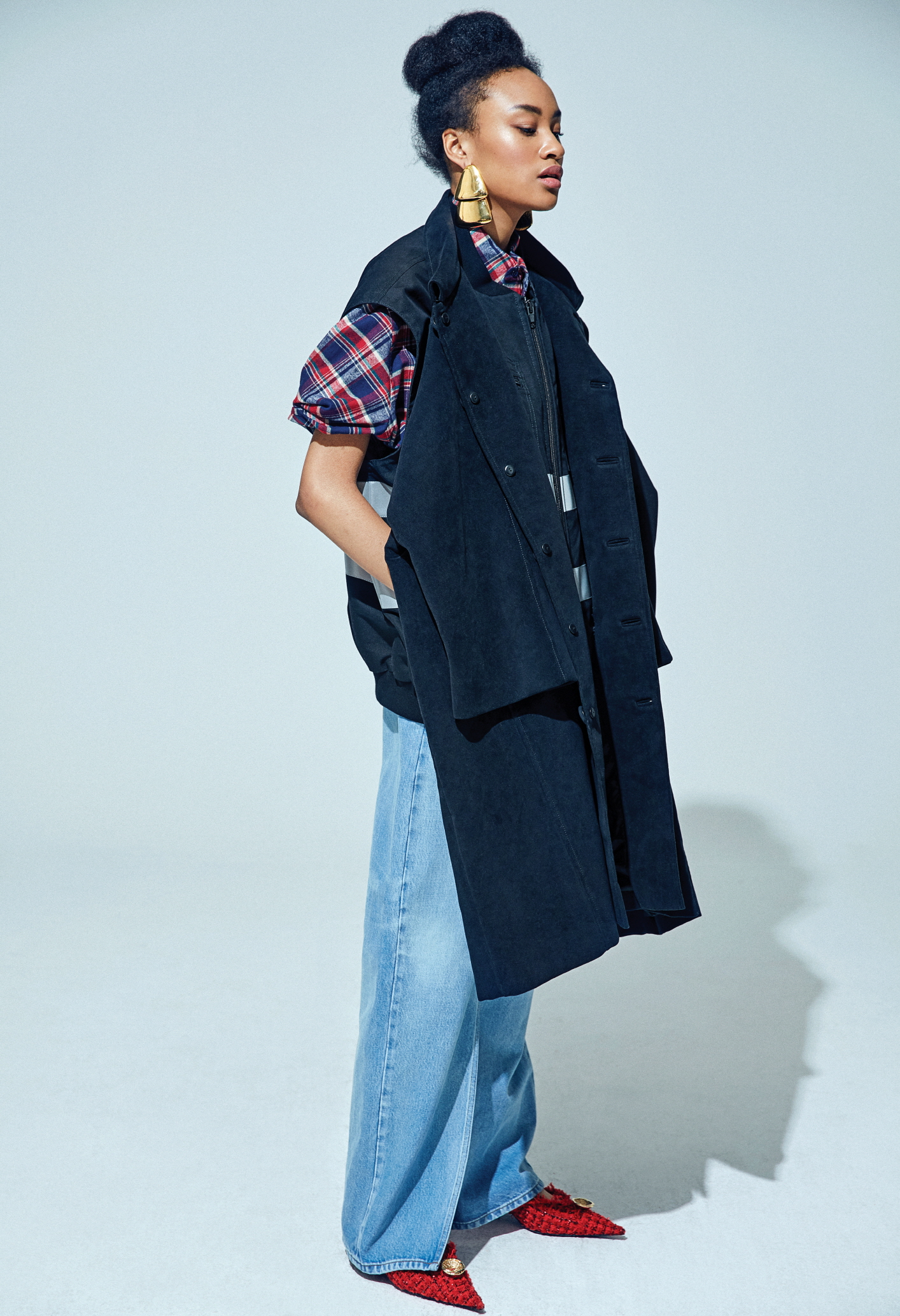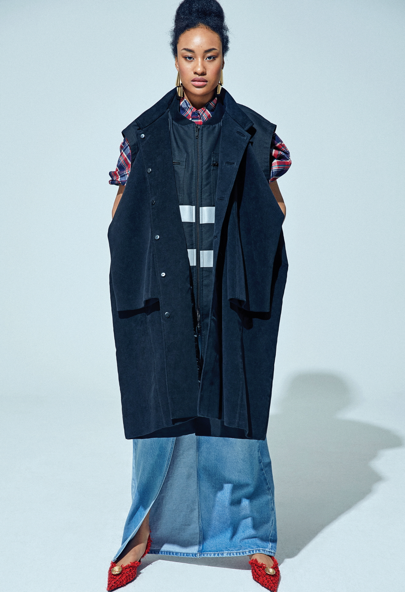 재킷과 베스트를 결합한 하이브리드 더블 파카 데님 재킷, 랩 치노 팬츠, 트위드 펌프스, 이어링은 모두 발렌시아가(Balenciaga).