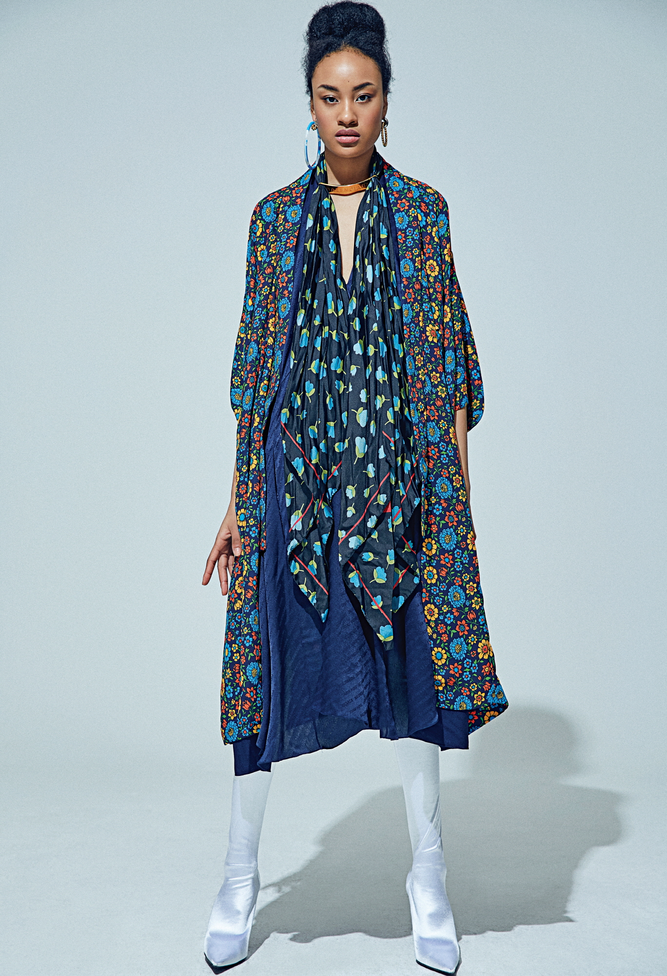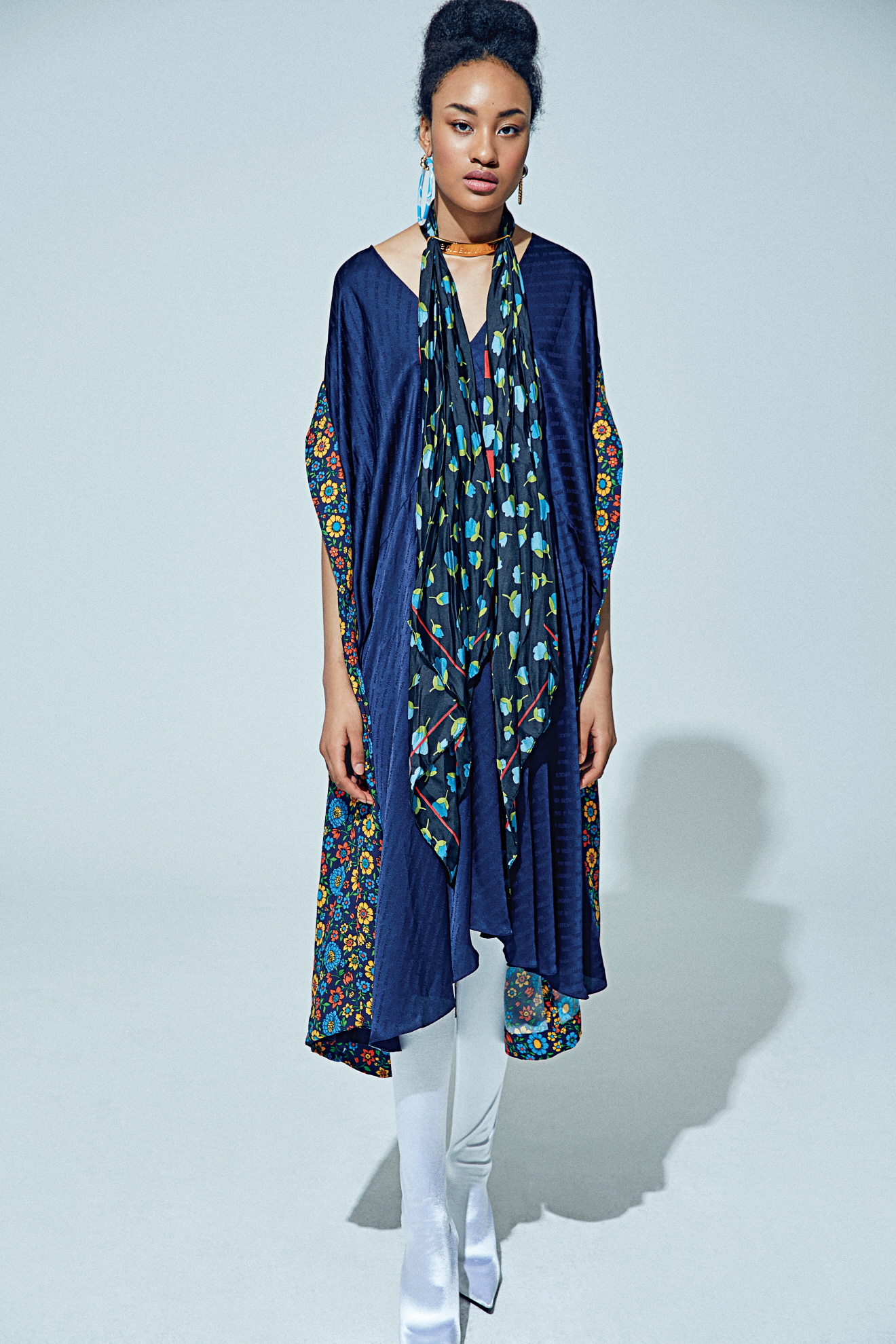 드레스 또는 로브 형태로 착용 가능한 더블 카프탄 기모노, 네크리스, 팬타 슈즈, 후프 이어링은 모두 발렌시아가(Balenciaga).