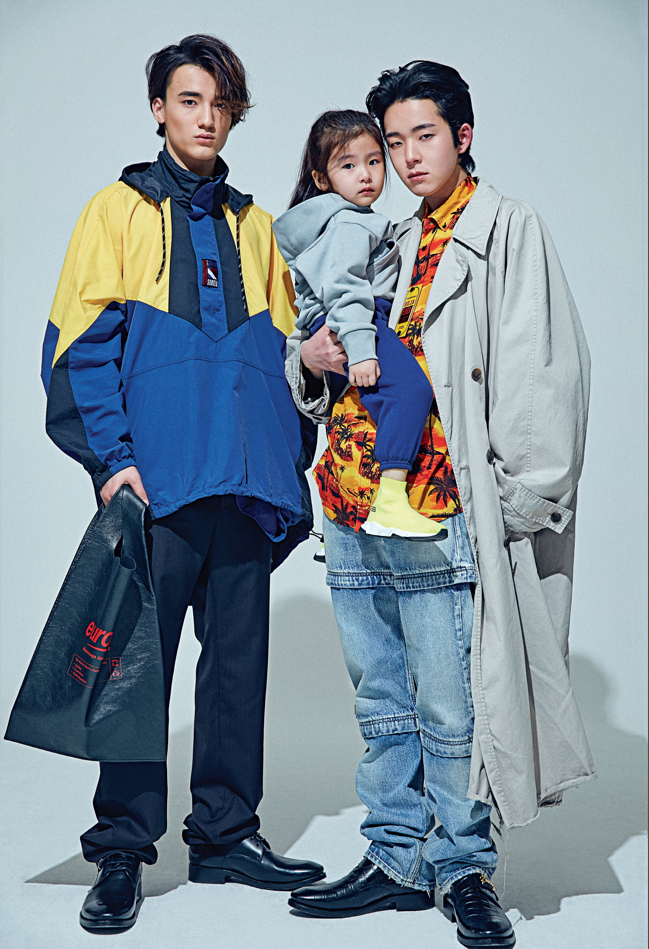 토비가 입은 두 가지 방법으로 착용 가능한 더블 헴 윈드브레이커, 더블 벨트 팬츠, 더비 슈즈는 모두 발렌시아가(Balenciaga), 마사시가 입은 빈티지한 밑단이 특징인 워시드 트렌치코트, 하와이안 셔츠, 모듈 팬츠, 스탬프 배지, 몽크 스트랩 클리퍼는 모두 발렌시아가(Balenciaga),