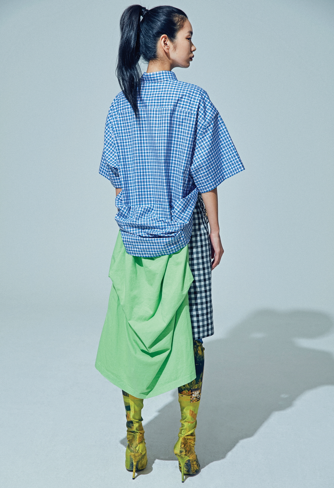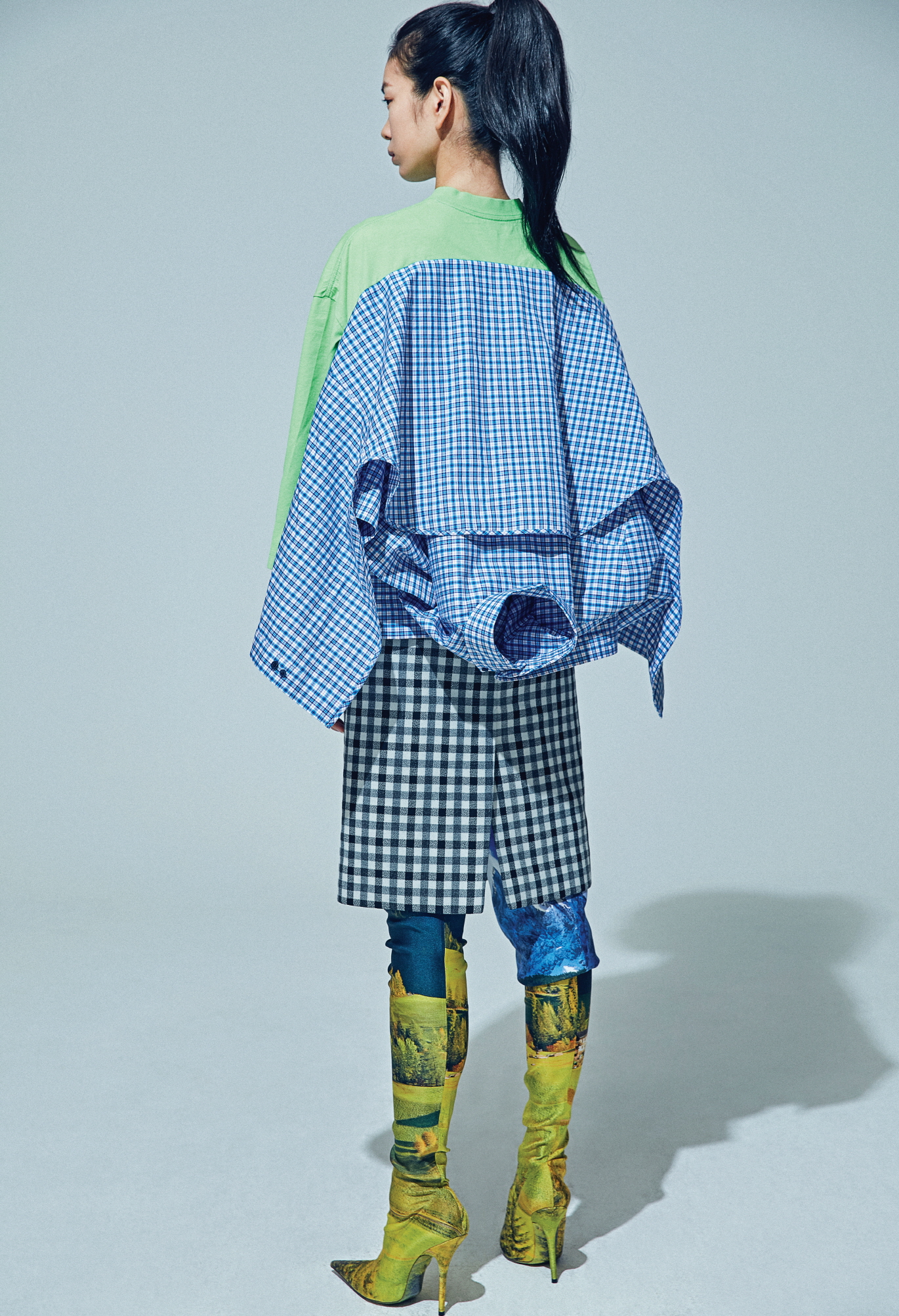 티셔츠와 셔츠를 결합한 콤비네이션 셔츠, 수베니어 참 벨트 디테일을 결합한 하운즈투스 체크 펜릴 스커트, 스크린 세이버에서 영감을 받은 사이하이 부츠, 이어링은 모두 발렌시아가(Balenciaga).
