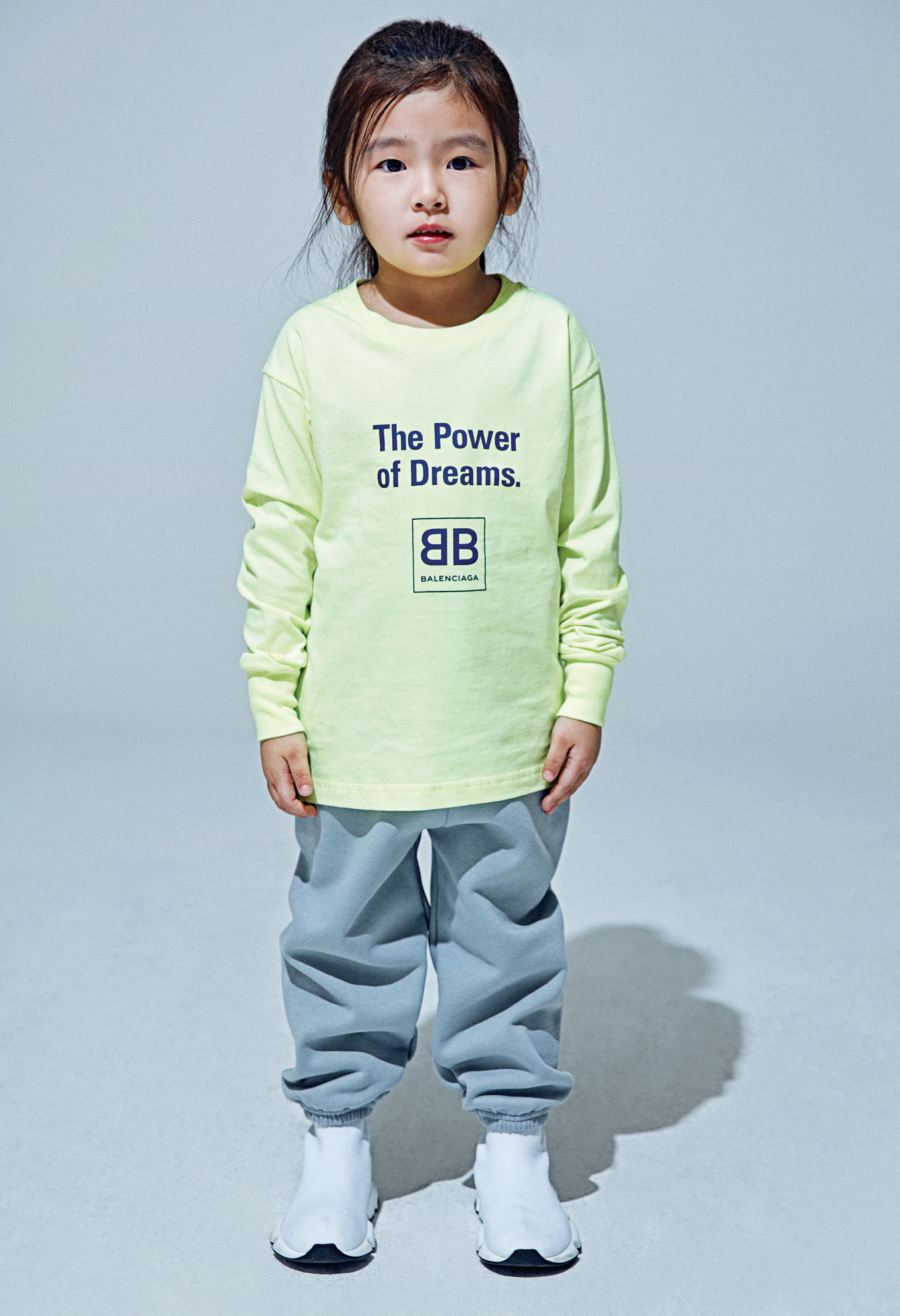 ‘The Power of Dreams’ 티셔츠, BB 로고 조깅 팬츠, 스피드 트레이너는 모두 발렌시아가(Balenciaga).