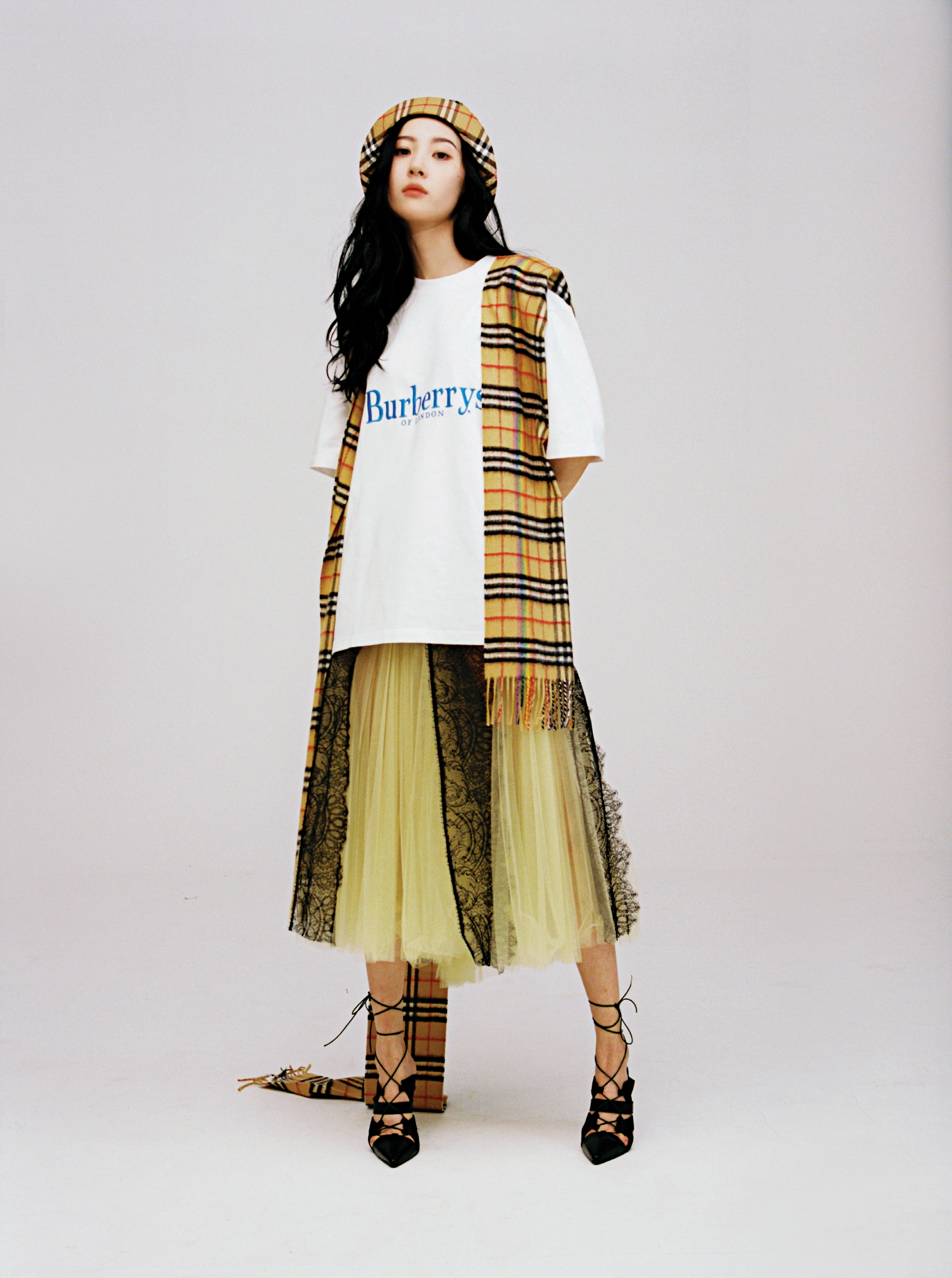옛 로고를 수놓은 티셔츠와 레이스 스커트, 클래식 체크 패턴 머플러와 버킷 해트는 모두 버버리(Burberry).