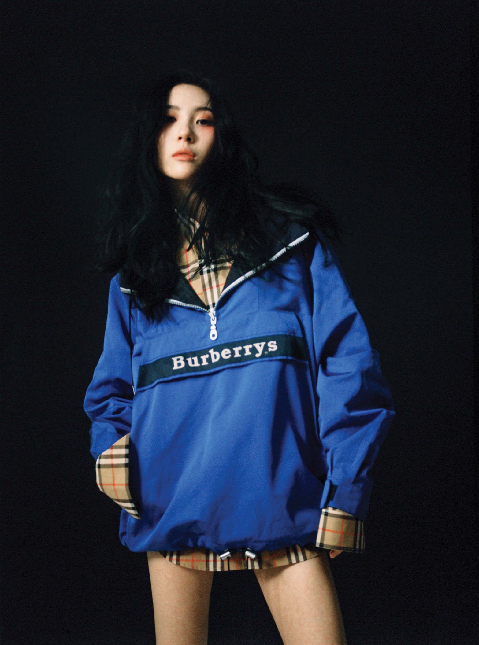 아노락 점퍼와 이너로 입은 체크 패턴 셔츠는 모두 버버리(Burberry).