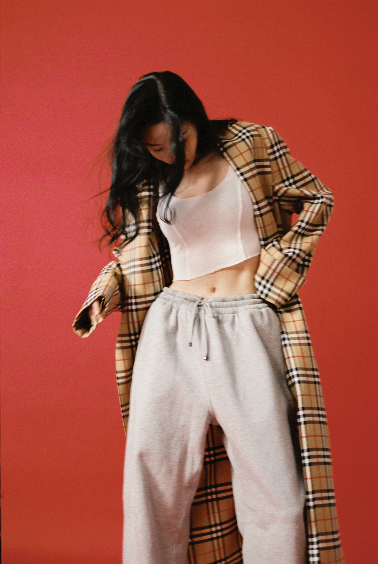 클래식 체크 패턴 로브와 그레이 스웨트팬츠는 모두 버버리(Burberry).