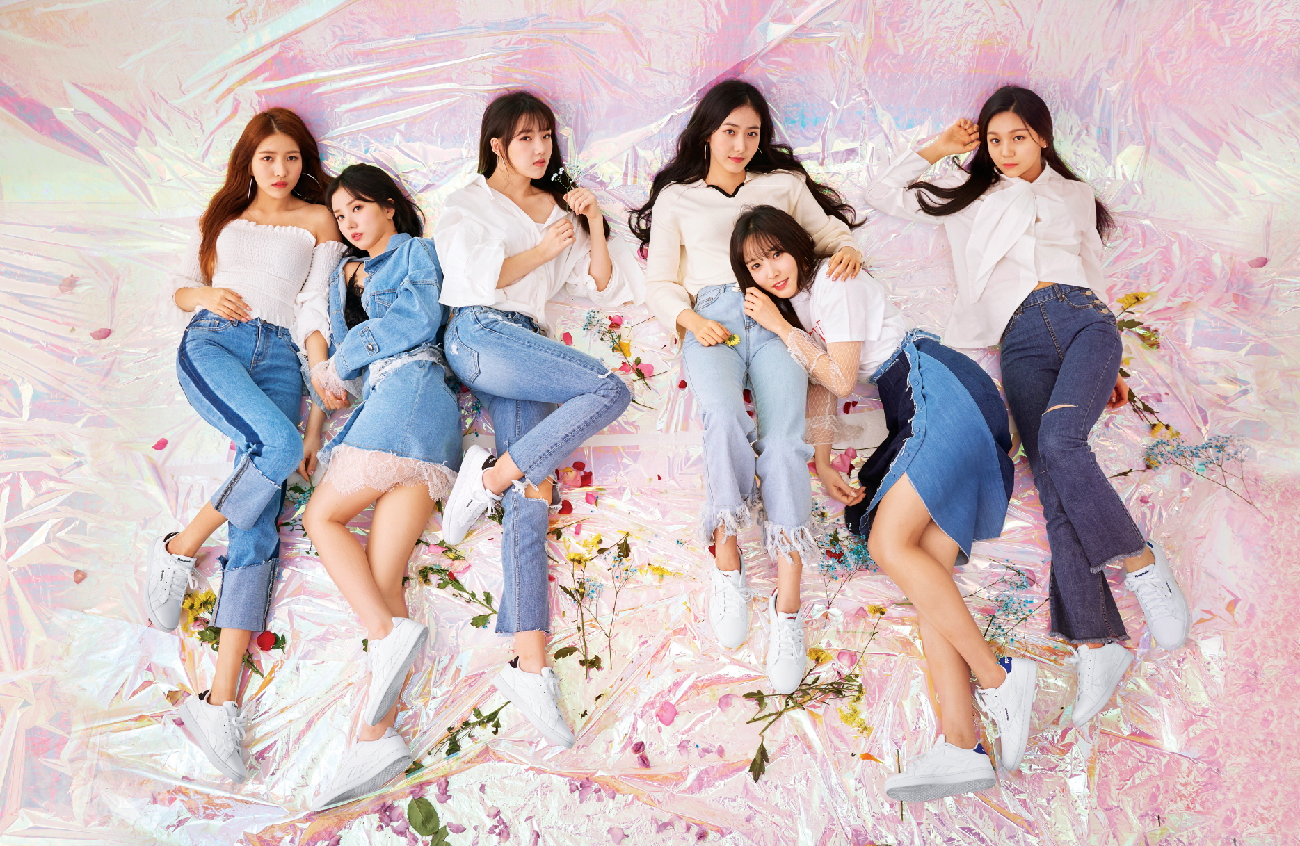 여자친구가 신은 스니커즈는 모두 리복 컴플리트 2LCS(Reebok Complete 2LCS), 소원이 입은 오프숄더 톱은 스타일난다(Style Nanda), 데님 팬츠는 느와(Noir), 은하가 입은 데님 재킷과 스커트는 모두 타게토(Targetto), 예린이 입은 톱은 비욘드 클로젯(Beyond Closet), 데님 팬츠는 스완 진(Swan Jeans), 신비가 입은 톱은 마가린 핑거스(Margarin Fingers), 데님 팬츠는 블랭크(Blank), 유주가 입은 데님 스커트는 렉토(Recto), 엄지가 입은 셔츠는 어나더 에이(Another A), 데님 팬츠는 오픈 플랜(Open Plan), 은하가 입은 이너와 유주가 입은 티셔츠는 모두 스타일리스트의 것.