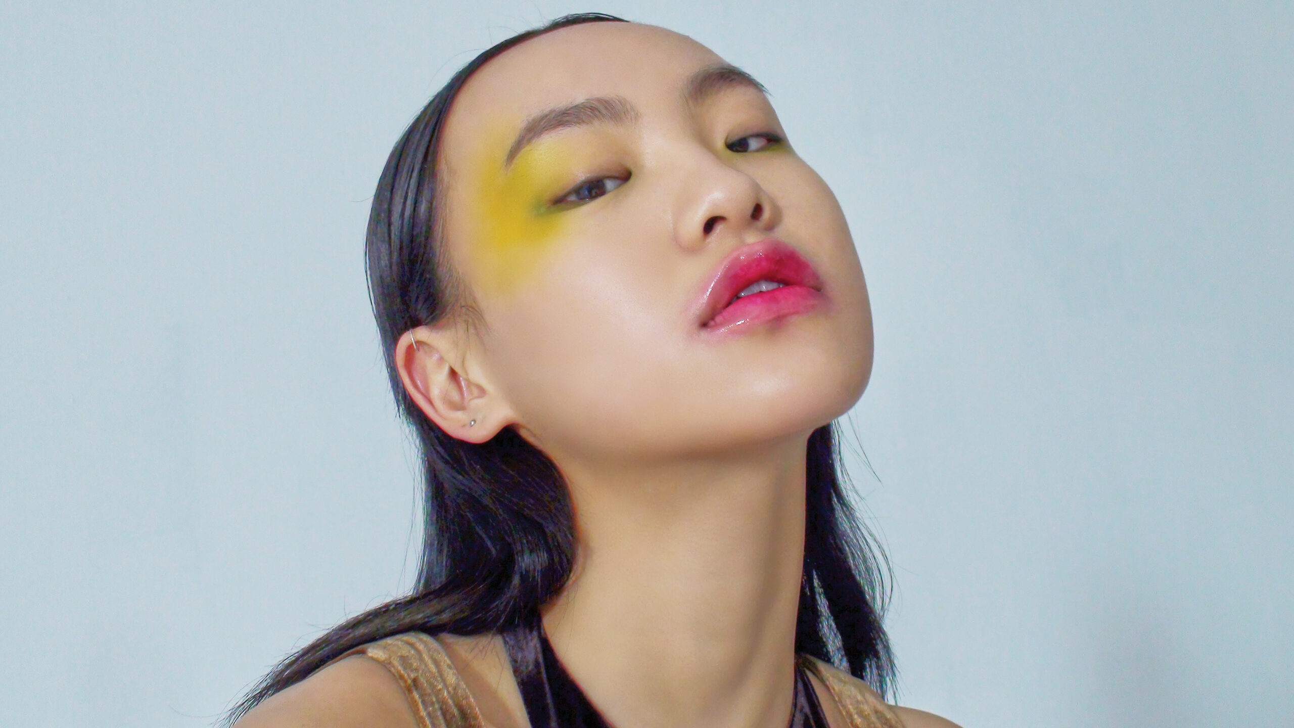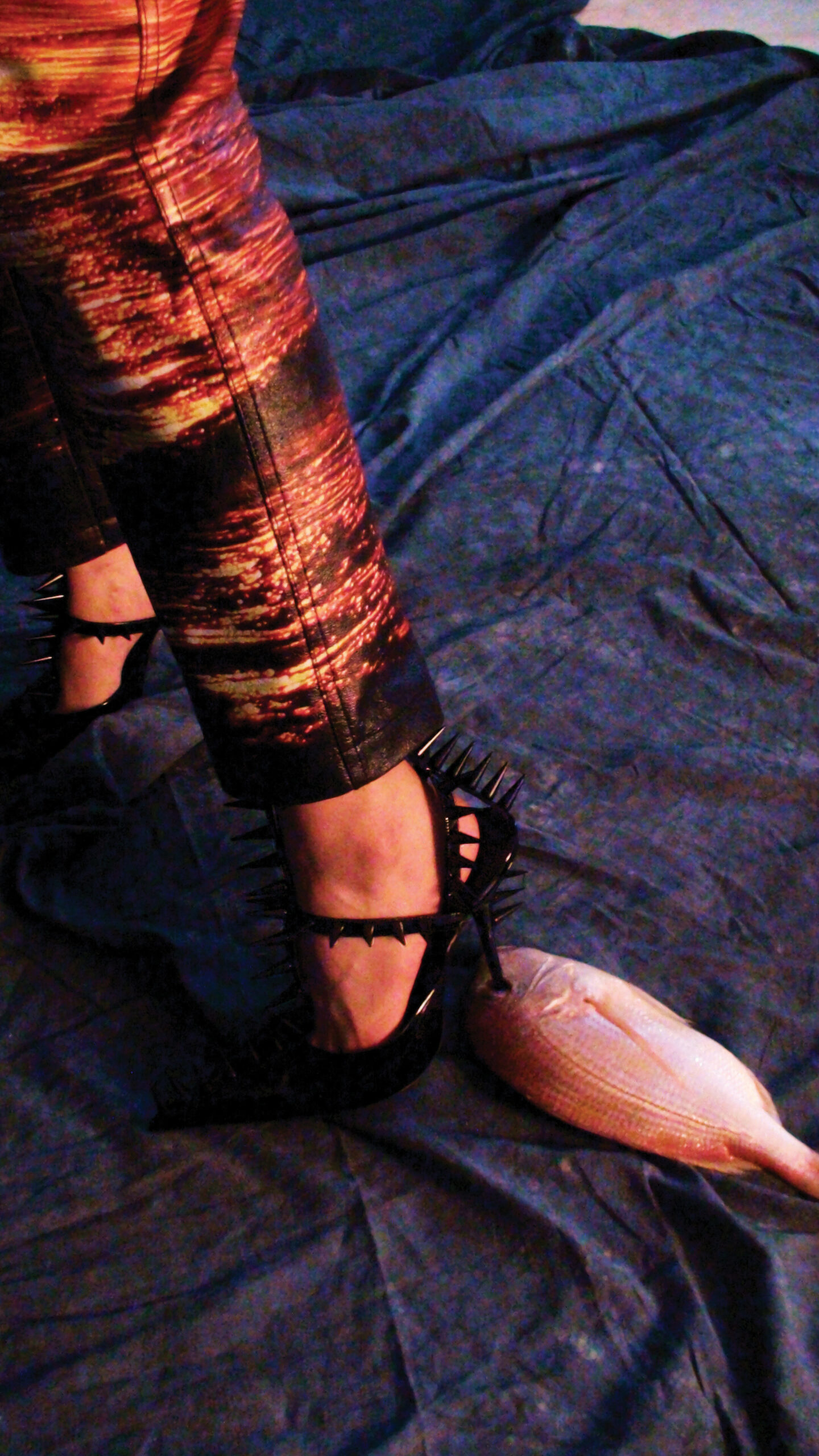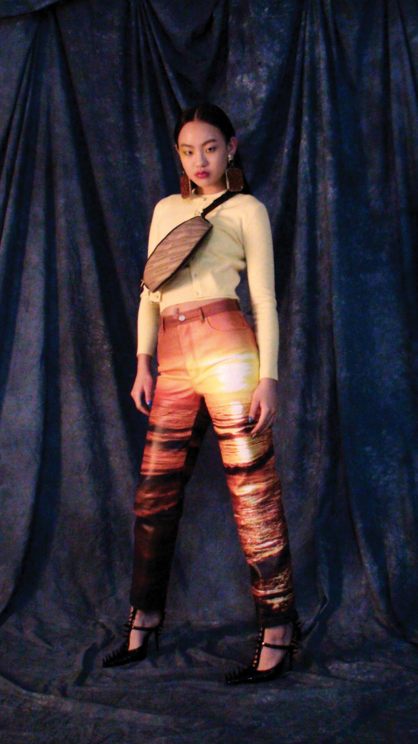 파스텔 옐로 니트 톱과 카디건, 화면보호기에서 영감을 받은 가죽 팬츠, 빈티지 이어링, 로고 프린트 패니팩, 스파이크 힐은 모두 발렌시아가(Balenciaga).