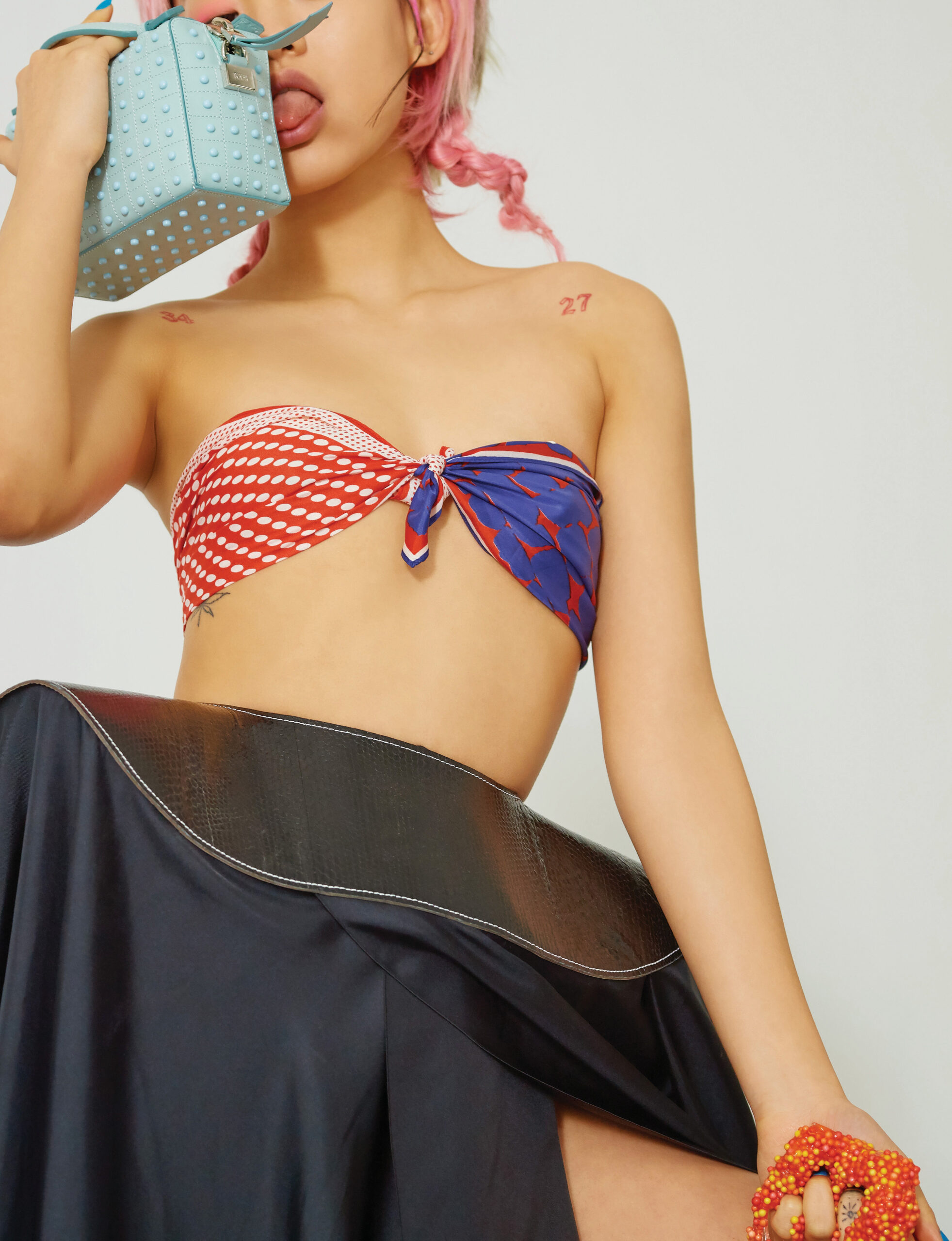 스커트처럼 연출한 구조적 실루엣의 원피스는 셀린느(Cline), 오른손에 든 고미노 미니 백은 토즈(Tod’s), 브라 톱처럼 연출한 두 개의 스카프는 모두 에디터의 것.