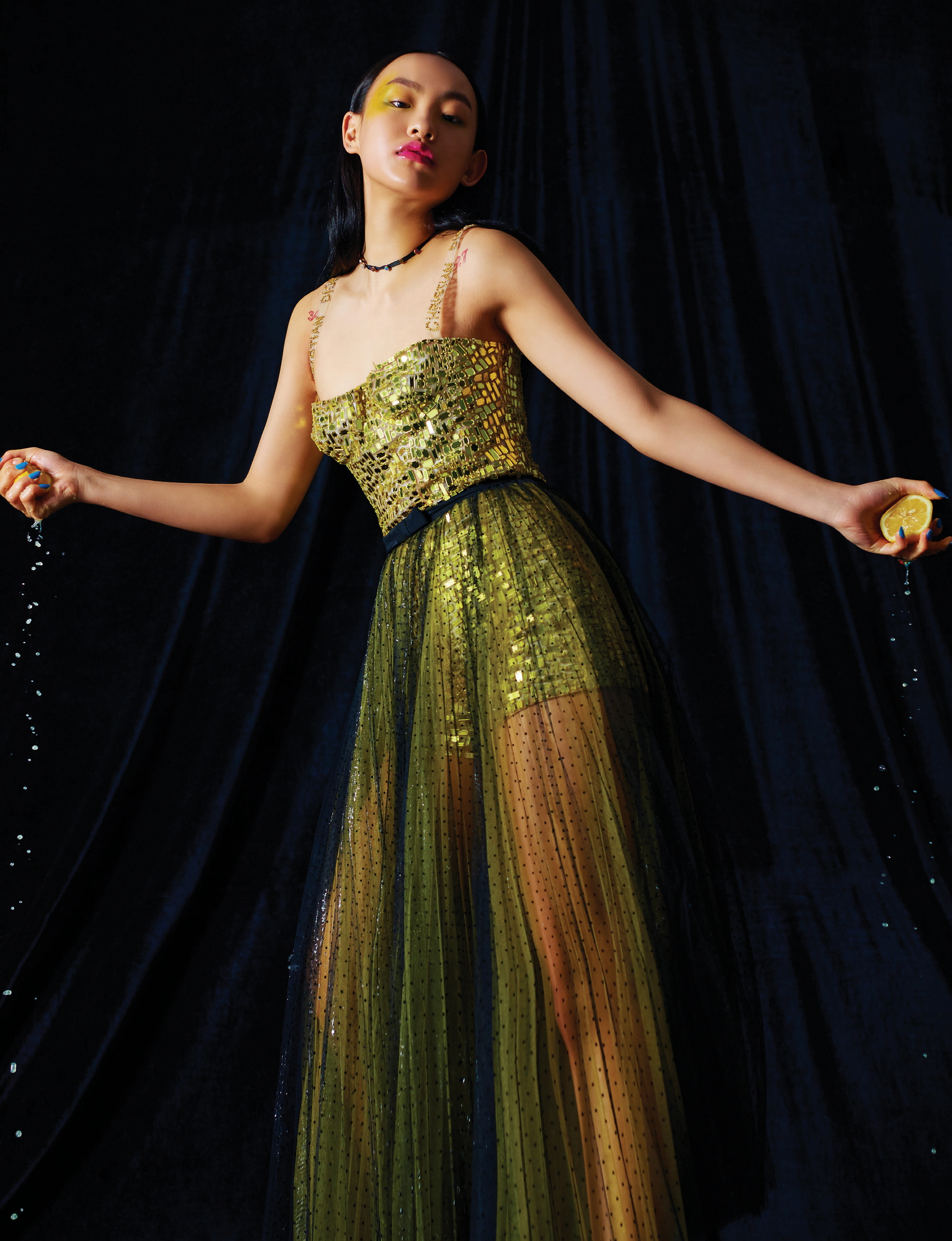 황금색 비즈 장식으로 뒤덮인 점프슈트, 도트 무늬가 수놓인 샤 스커트, 앙증맞은 사이즈가 눈에 띄는 초커는 모두 디올(Dior).