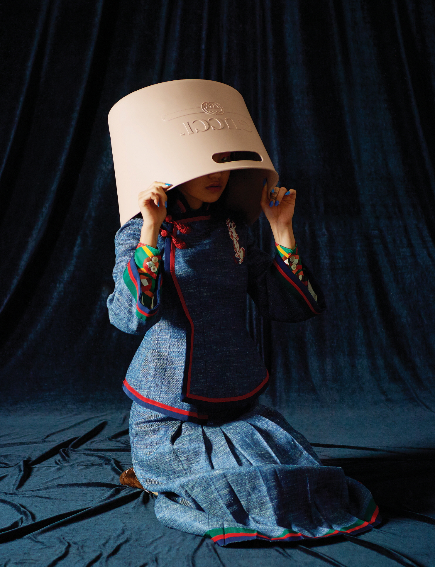 한눈에 구찌라는 걸 알 수 있는 스트라이프 파이핑 재킷과 플리츠스커트, 프린트 실크 블라우스, 로고를 양각 처리한 PVC 백, 벨벳 슬리퍼는 모두 구찌(Gucci).