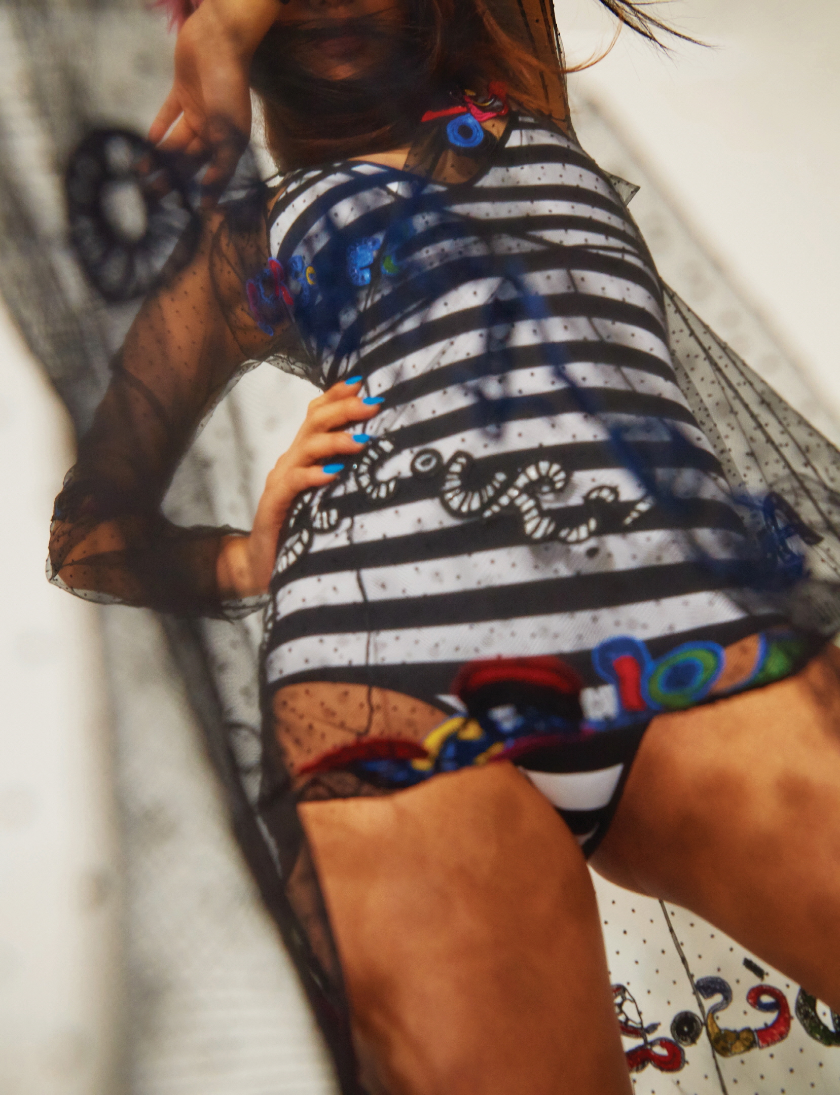 자수 장식 샤 원피스와 줄무늬 보디슈트는 모두 디올(Dior).
