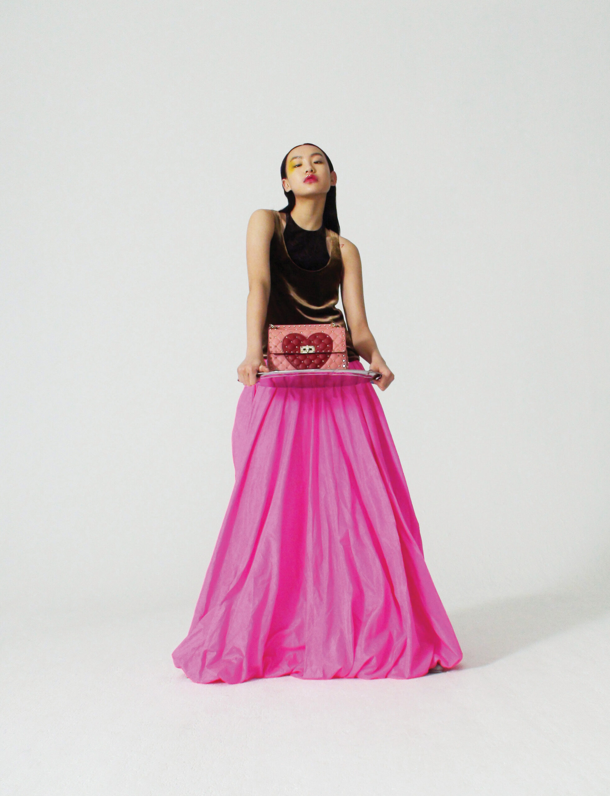 진달래색 롱 드레스와 브라 톱은 모두 발렌티노(Valentino), 은 쟁반에 받쳐 들고 있는 하트 스퀘어 백은 발렌티노 가라바니(Valentino Garavani).