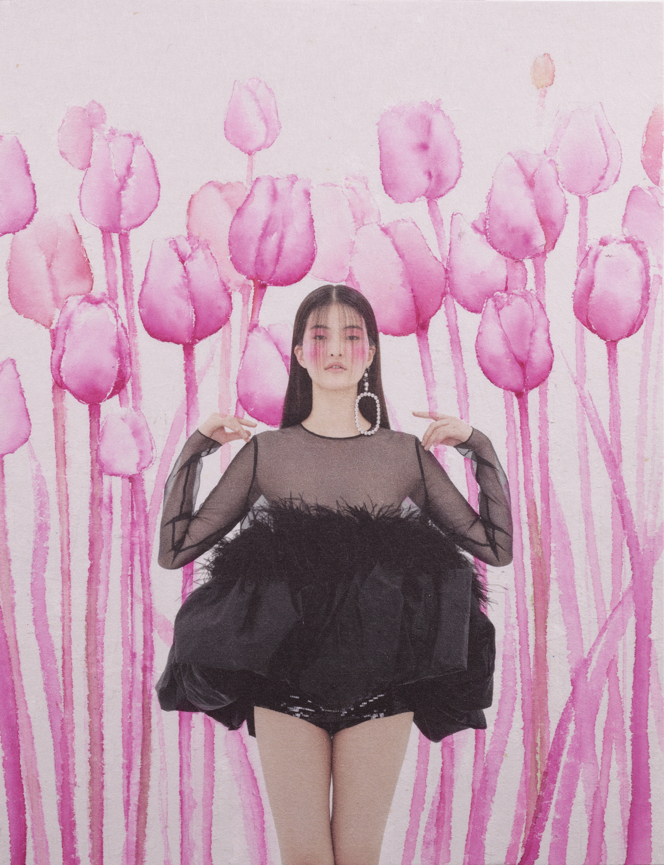플로럴 자수가 놓인 시스루 원피스는 버버리(Burberry), 맥시 사이즈의 후프 이어링은