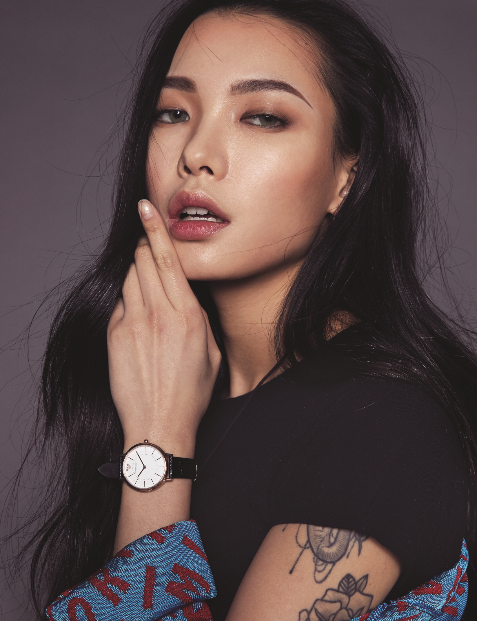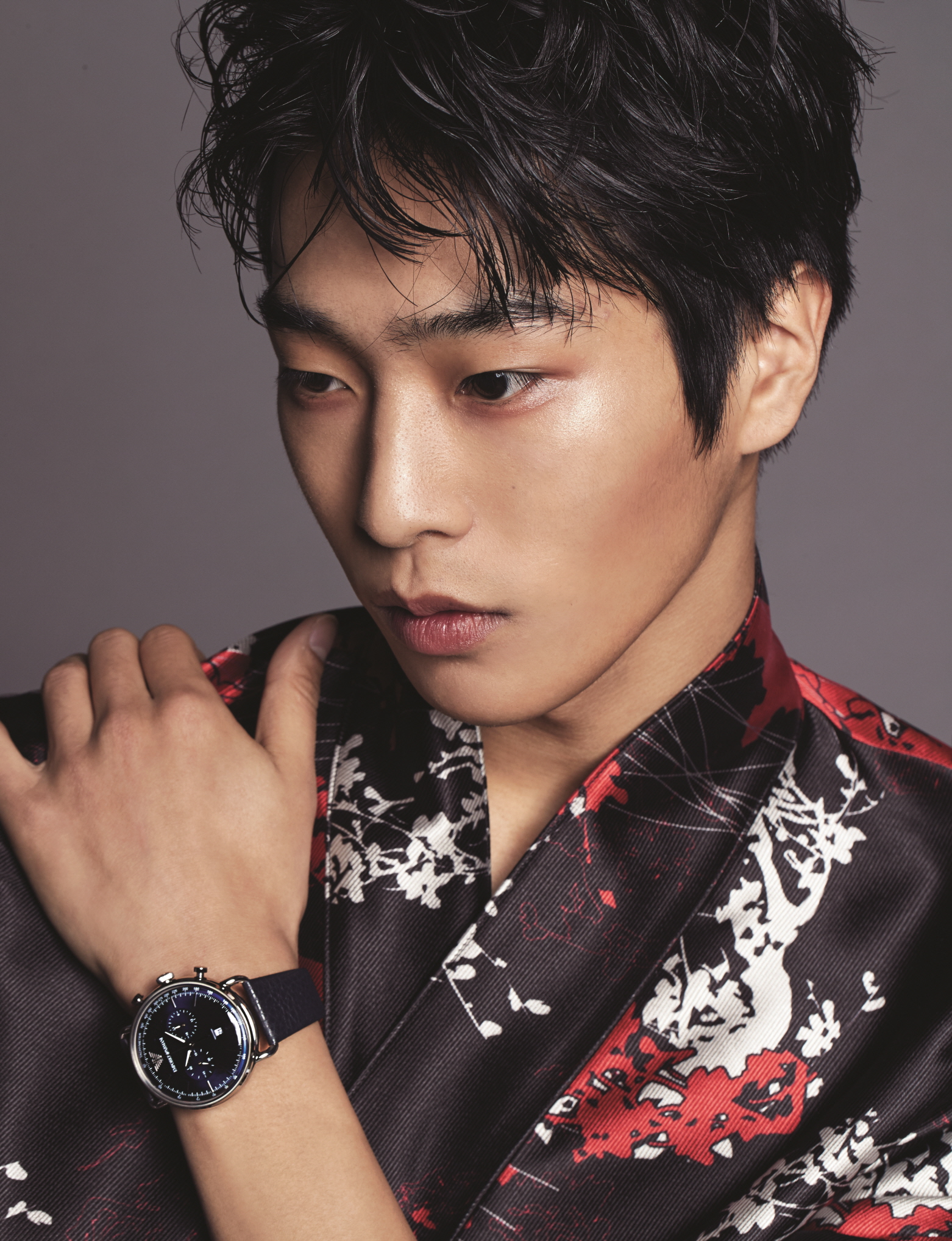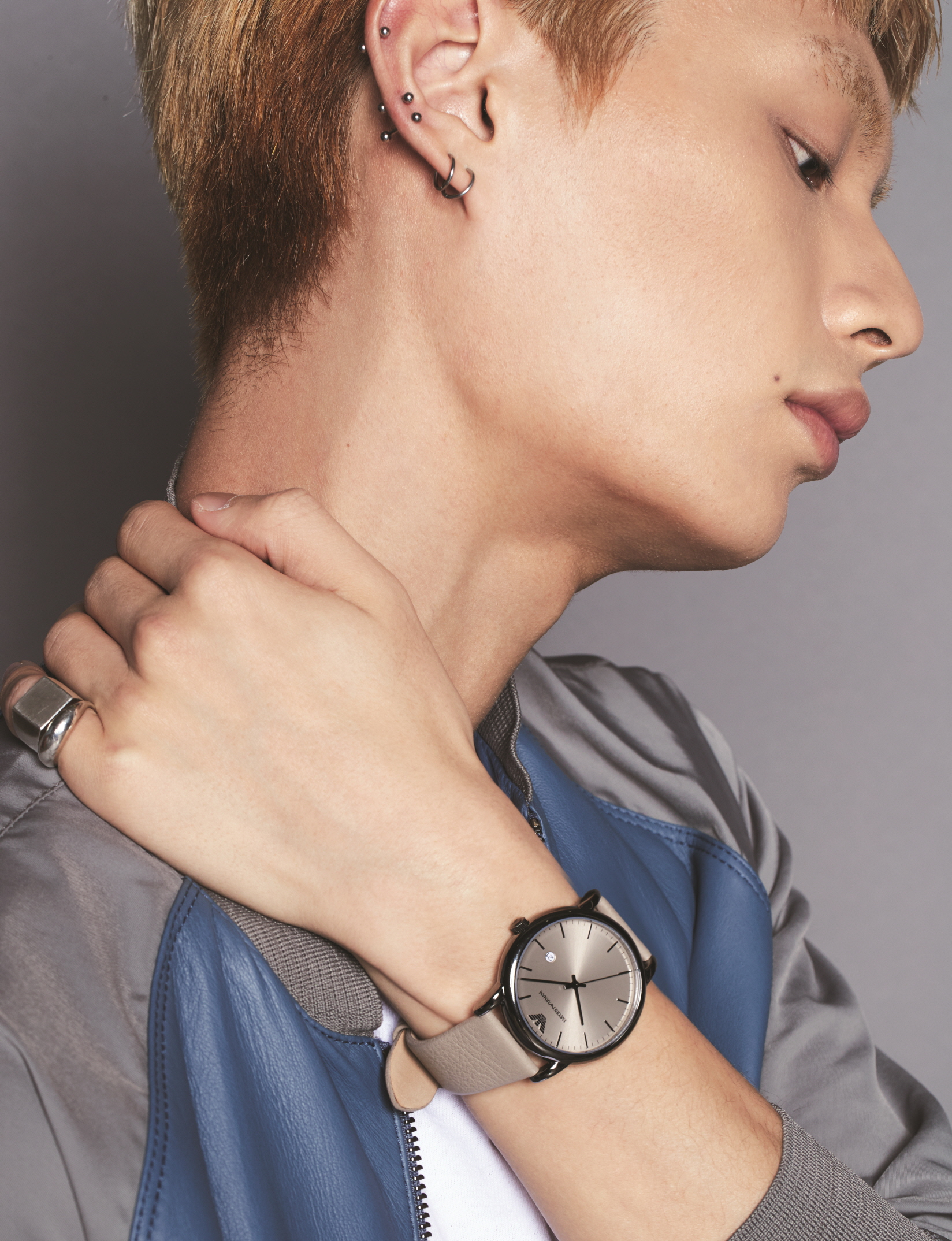 라운드 스테인리스 톤 케이스에 다크 블루의 짙은 컬러감으로 매니시한 감성을 표현한 에이비에이터 워치는 엠포리오 아르마니 워치(Emporio Armani Watch), 오리엔탈 무드의 재킷은 엠포리오 아르마니(Emporio Armani).