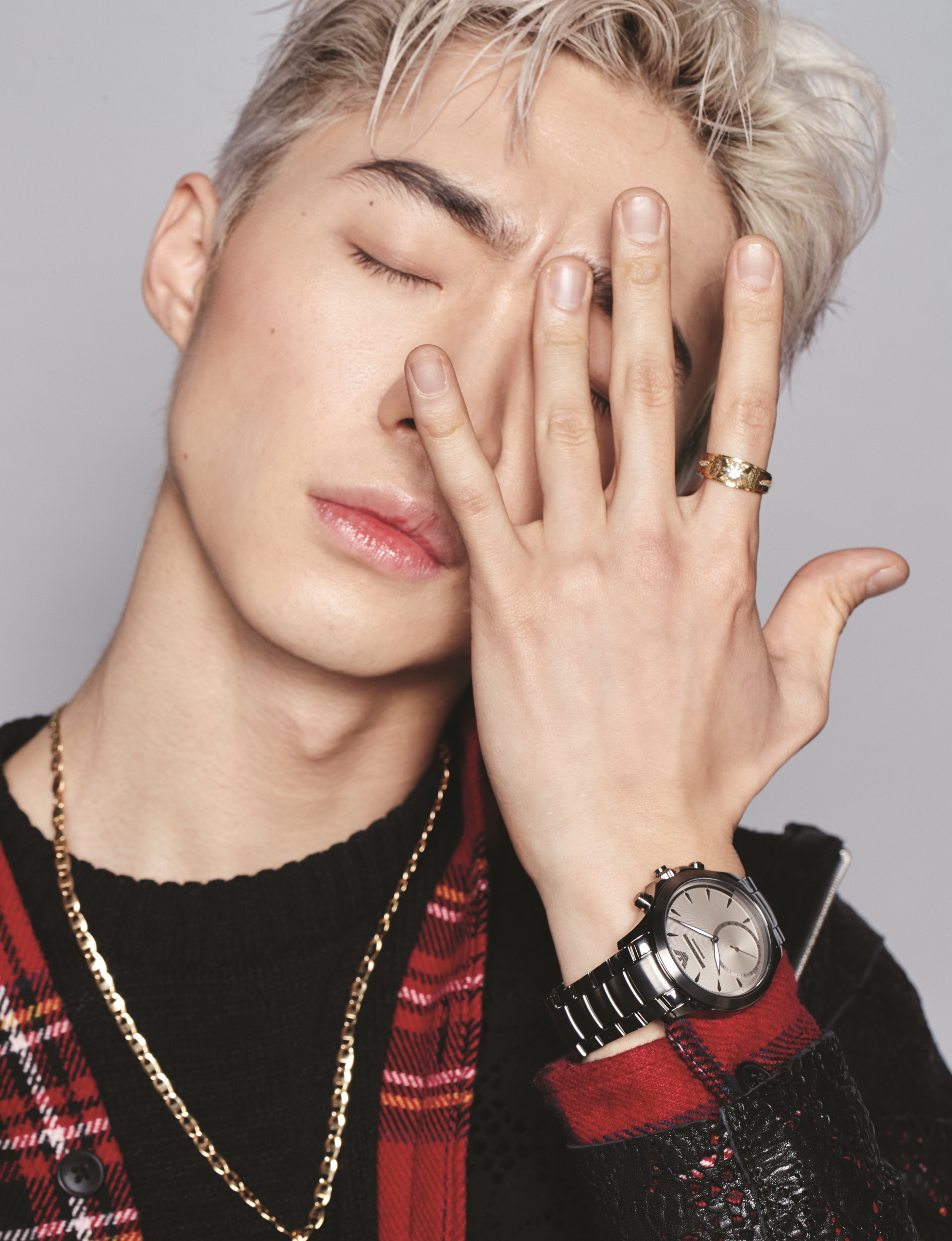 그레이 다이얼의 알베르토 하이브리드 워치는 엠포리오 아르마니 워치(Emporio Armani Watch), 레더 재킷은 엠포리오 아르마니(Emporio Armani), 이너의 니트 톱과 체크 셔츠, 액세서리는 모델이 입고 온 것.