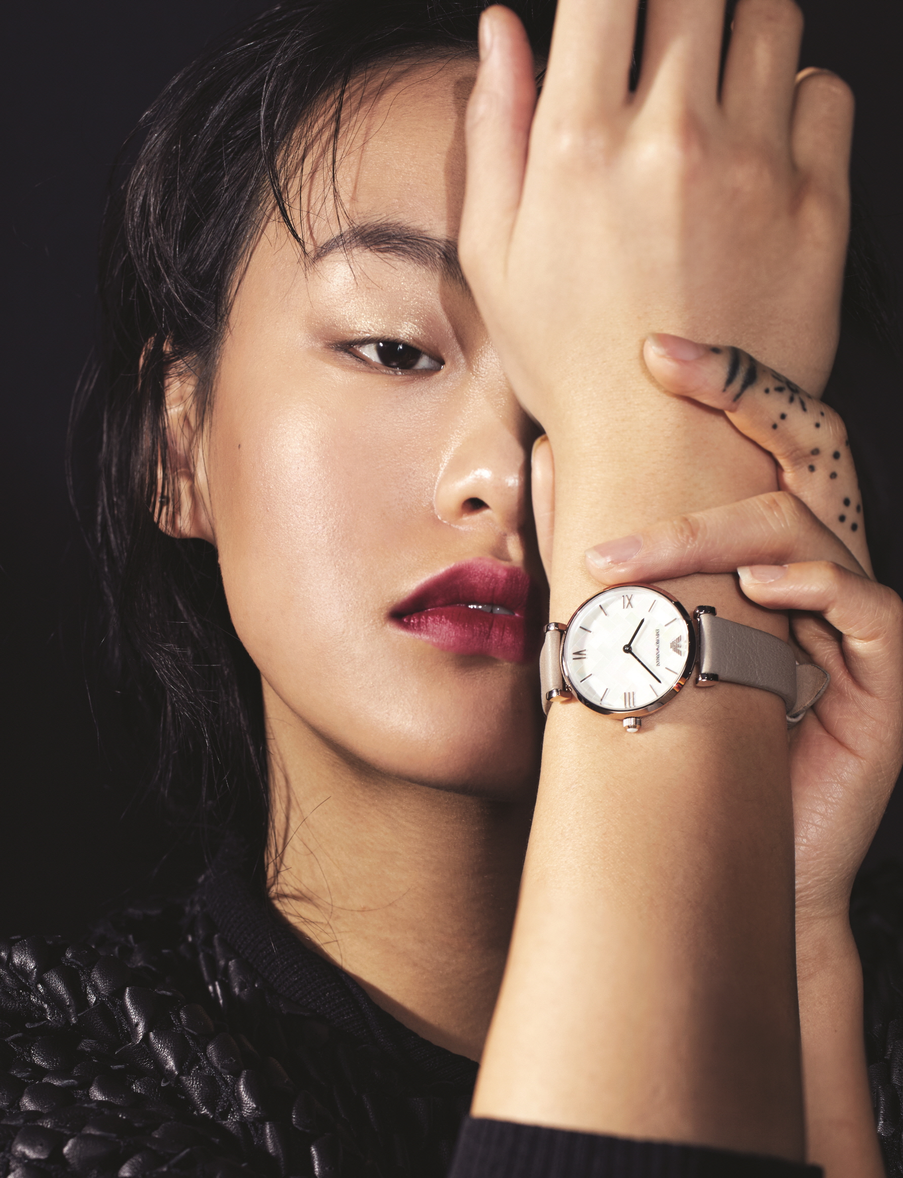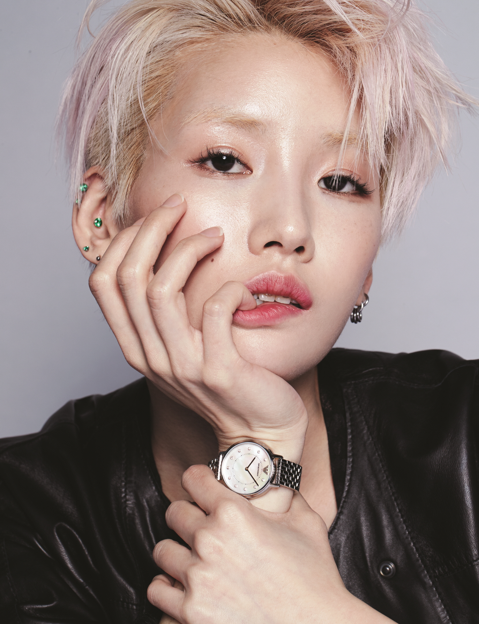 다이얼의 주얼 장식이 포인트인 스틸 브레이슬릿 워치는 엠포리오 아르마니 워치(Emporio Armani Watch), 레더 재킷은 엠포리오 아르마니(Emporio Armani).