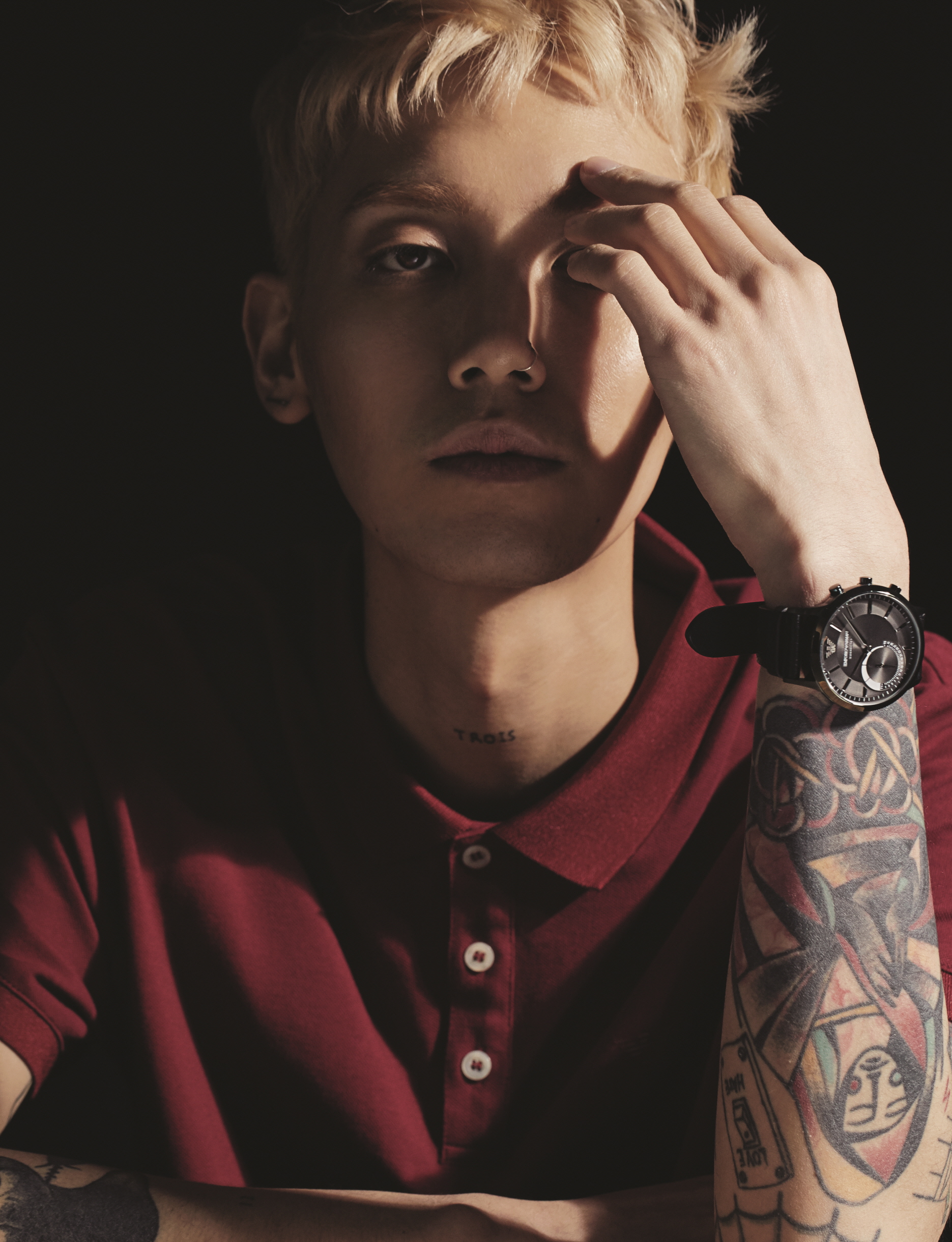 올리브 그린 컬러가 포인트인 레나토 하이브리드 워치는 엠포리오 아르마니 워치(Emporio Armani Watch), 와인색 테니스 티셔츠는 엠포리오 아르마니(Emporio Armani).