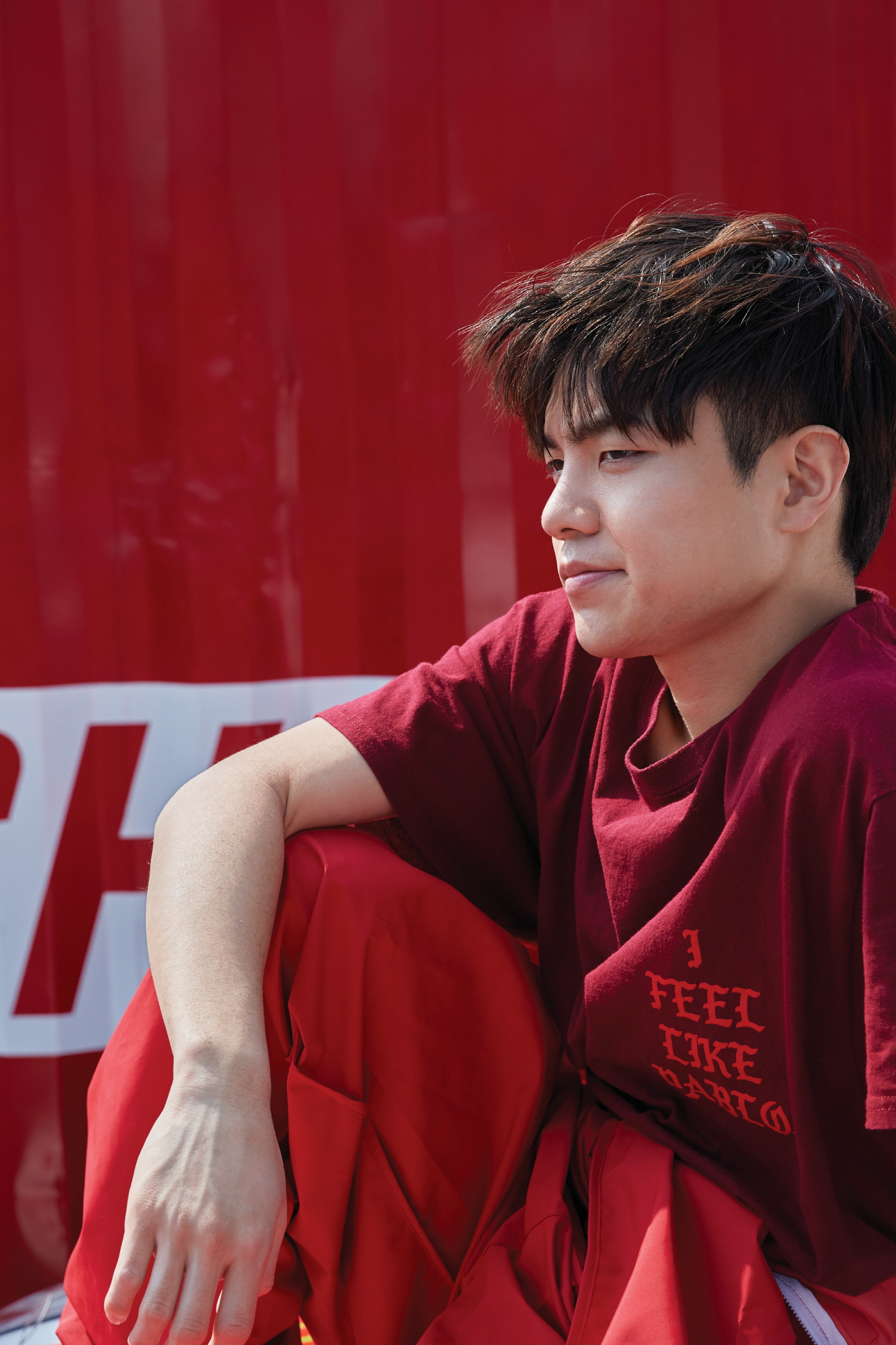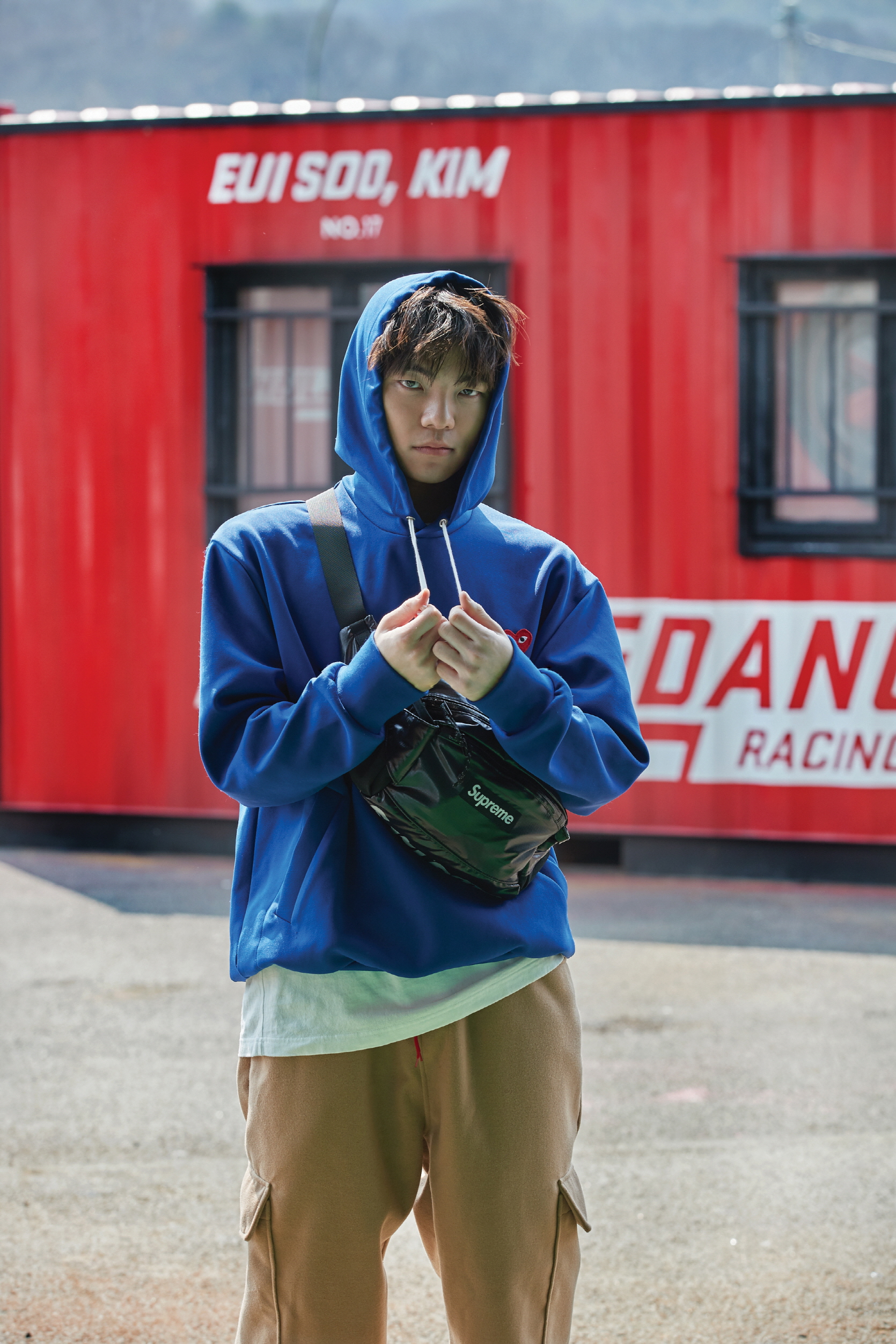 파란색 후디는 꼼데가르송(Comme Des Garcons), 힙색은 슈프림(SUPREME), 팬츠는 드윕(DWEEB)으로 모두 평소에 에디터가 즐겨 입는 것.
