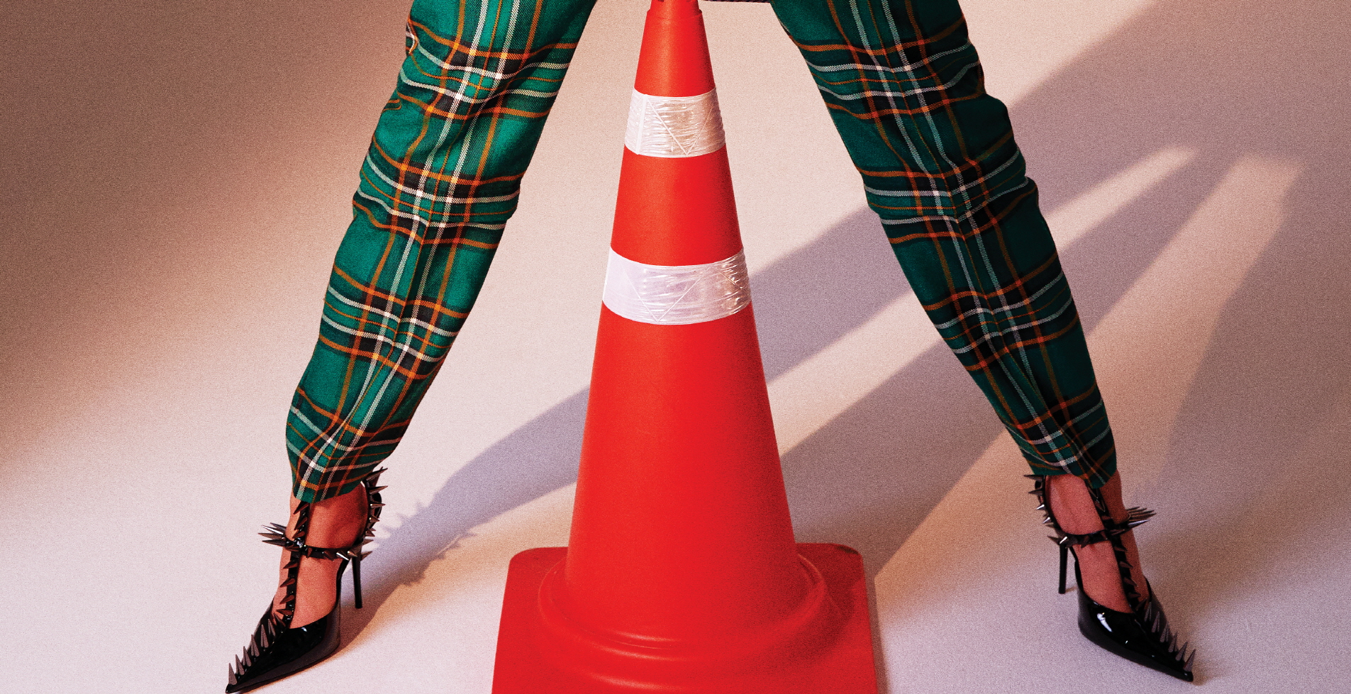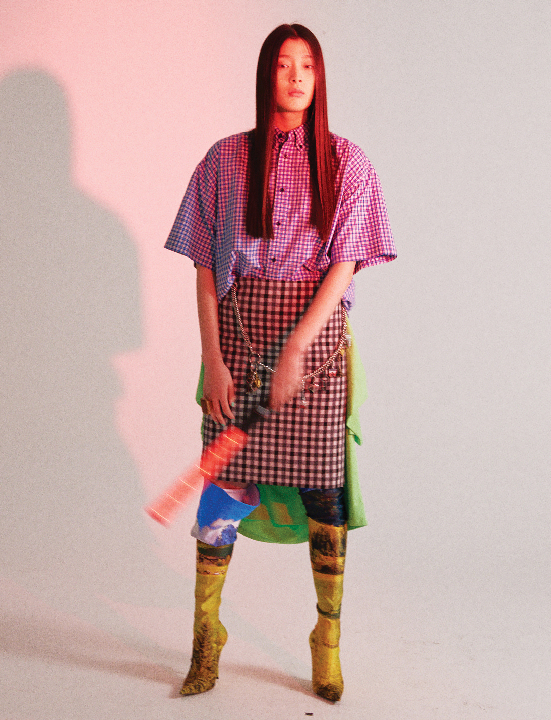 체크 팬츠와 스파이크 샌들은 모두 발렌시아가(Balenciaga).