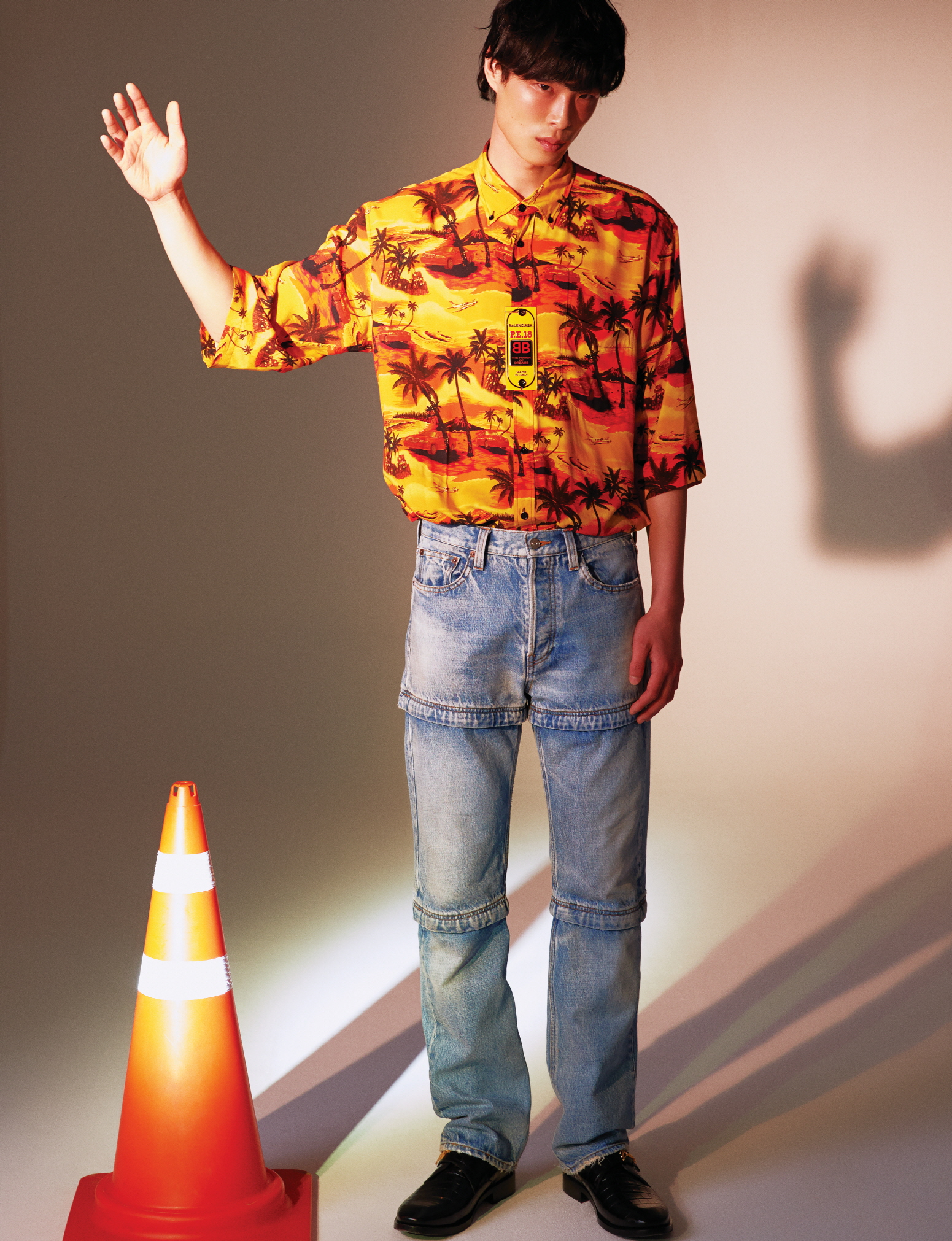 하와이언 셔츠, 길이를 조절할 수 있는 데님 팬츠, 스탬프 배지, 슈즈는 모두 발렌시아가(Balenciaga).