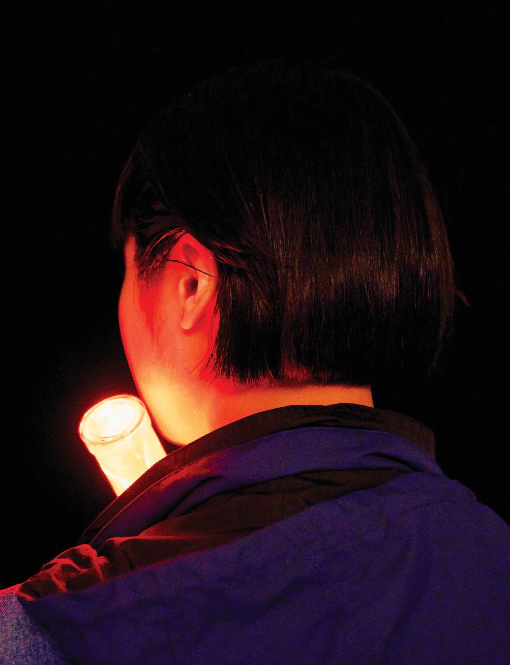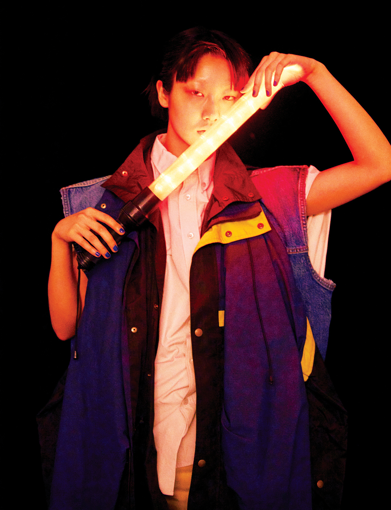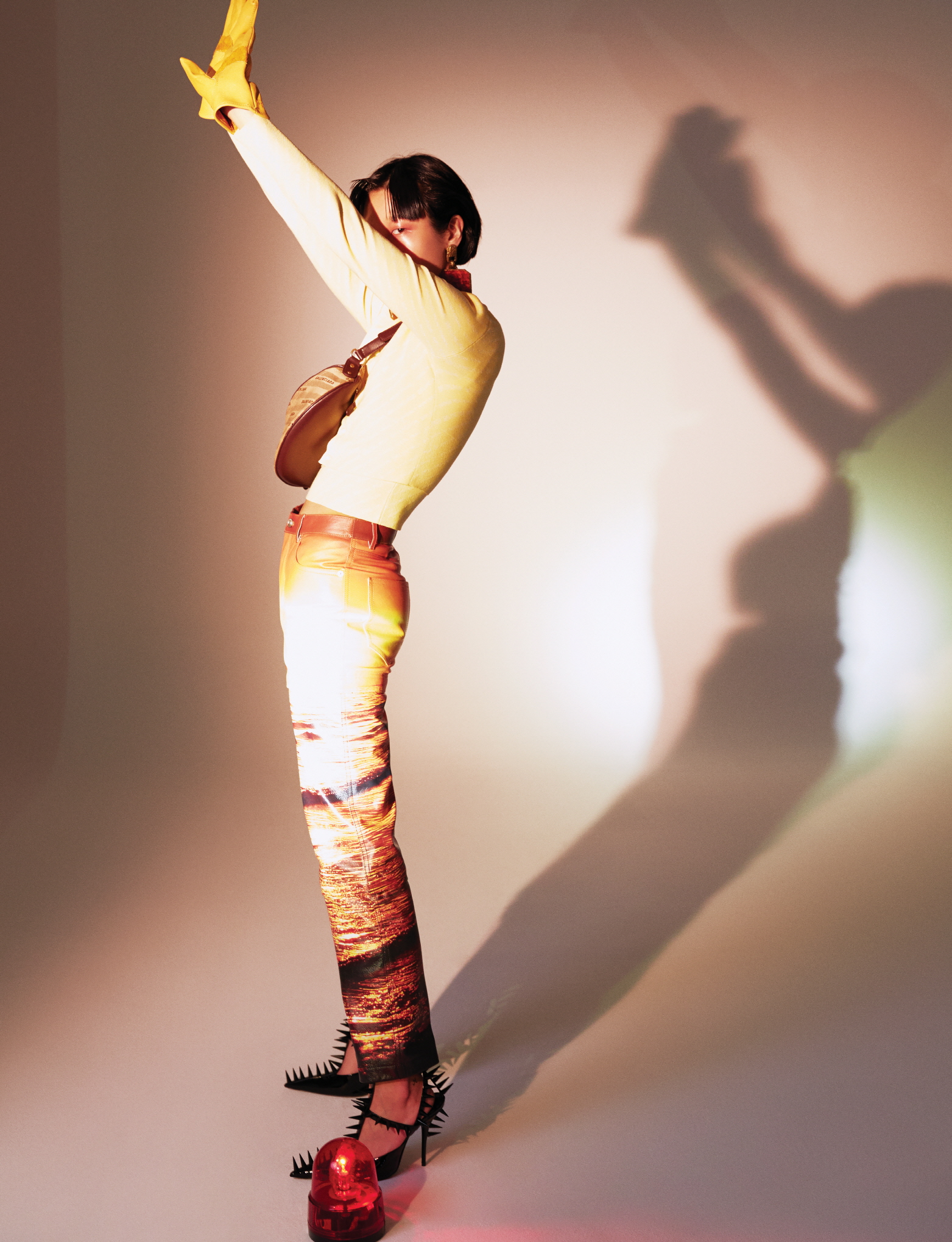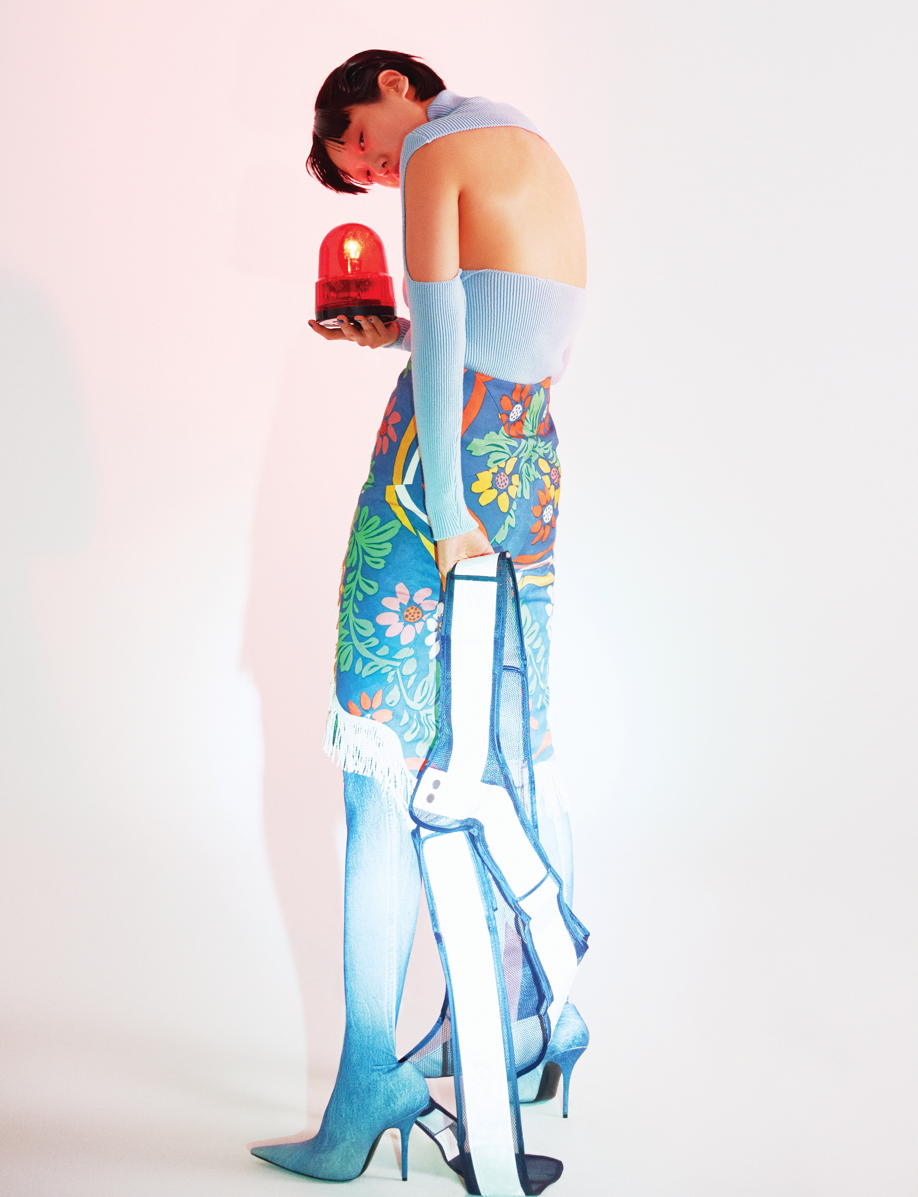 오픈 백 터틀넥, 스커트와 데님 부츠는 모두 발렌시아가(Balenciaga), 반사 테이프 디테일이 있는안전 요원 조끼는 에디터가 준비한 것.