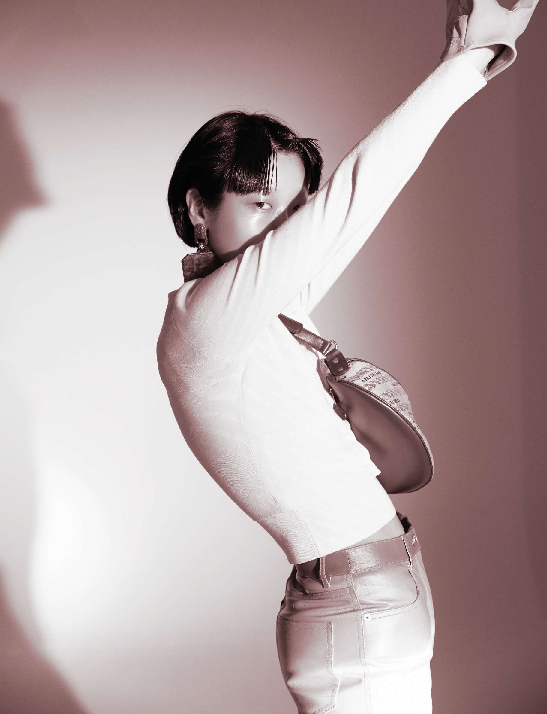 로고가 들어간 니트 톱과 카디건, 가죽 팬츠, 스파이크 샌들, 로고 패니팩, 스퀘어 이어링은 모두 발렌시아가(Balenciaga).