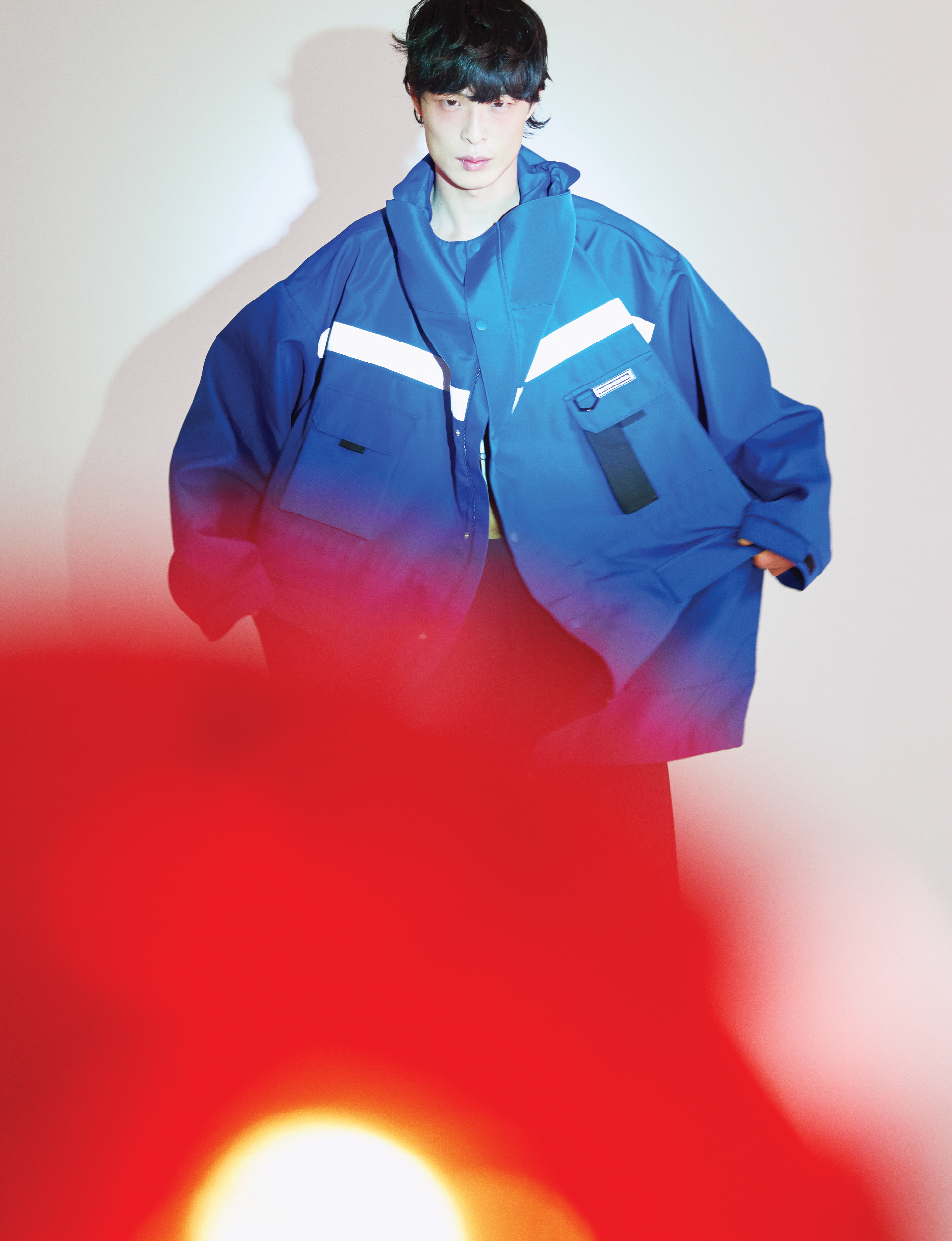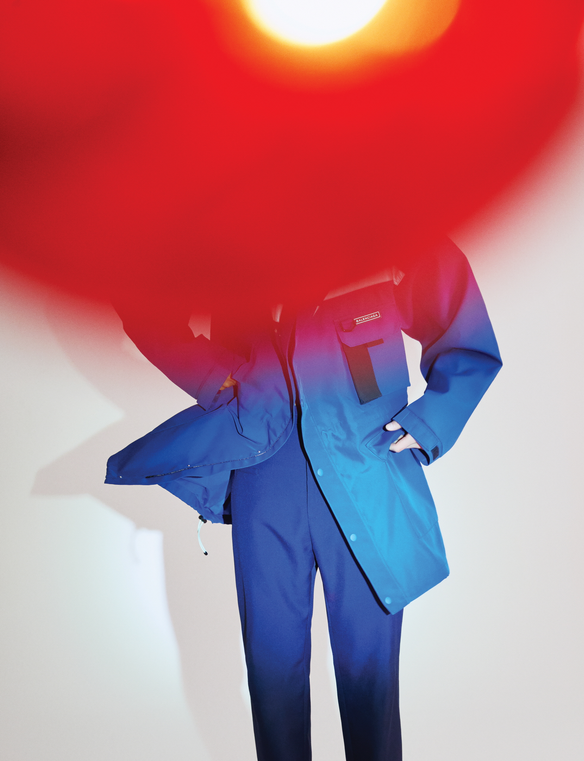 반사 테이프 디테일이 들어간 파카, 팬츠와 스니커즈는 모두 발렌시아가(Balenciaga).
