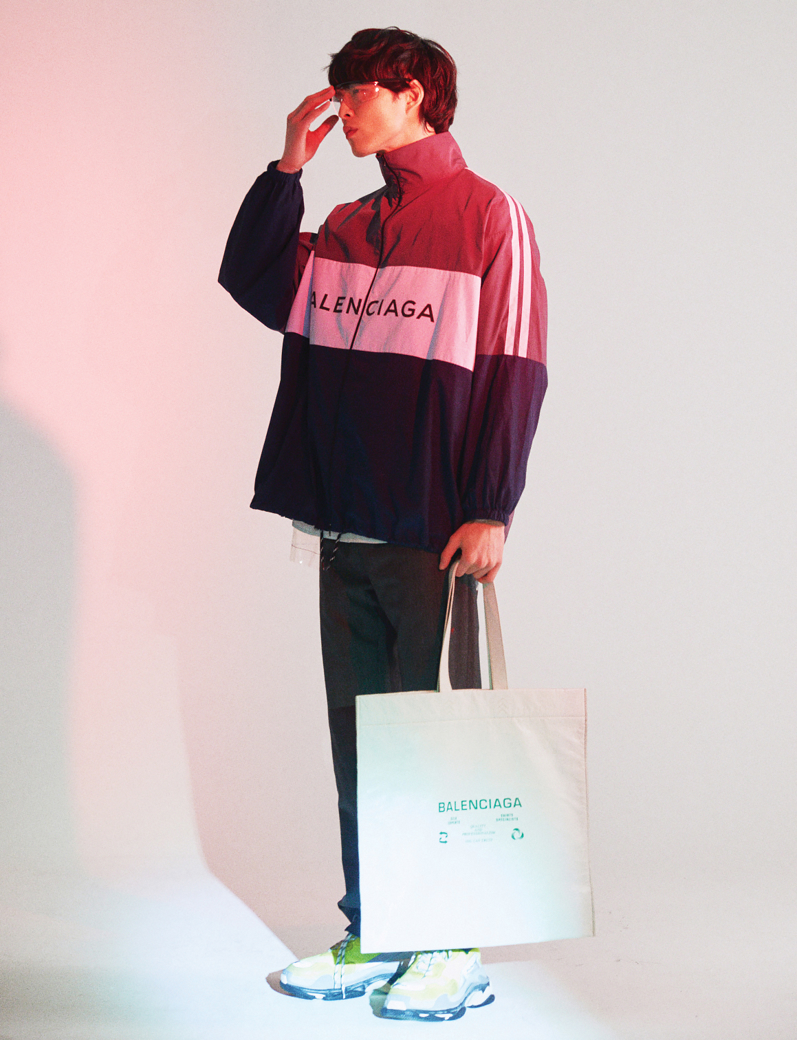 로고 트랙 슈트, 팬츠, 슈퍼마켓 쇼퍼 백, 트리플 S 스니커즈는 모두 발렌시아가(Balenciaga).