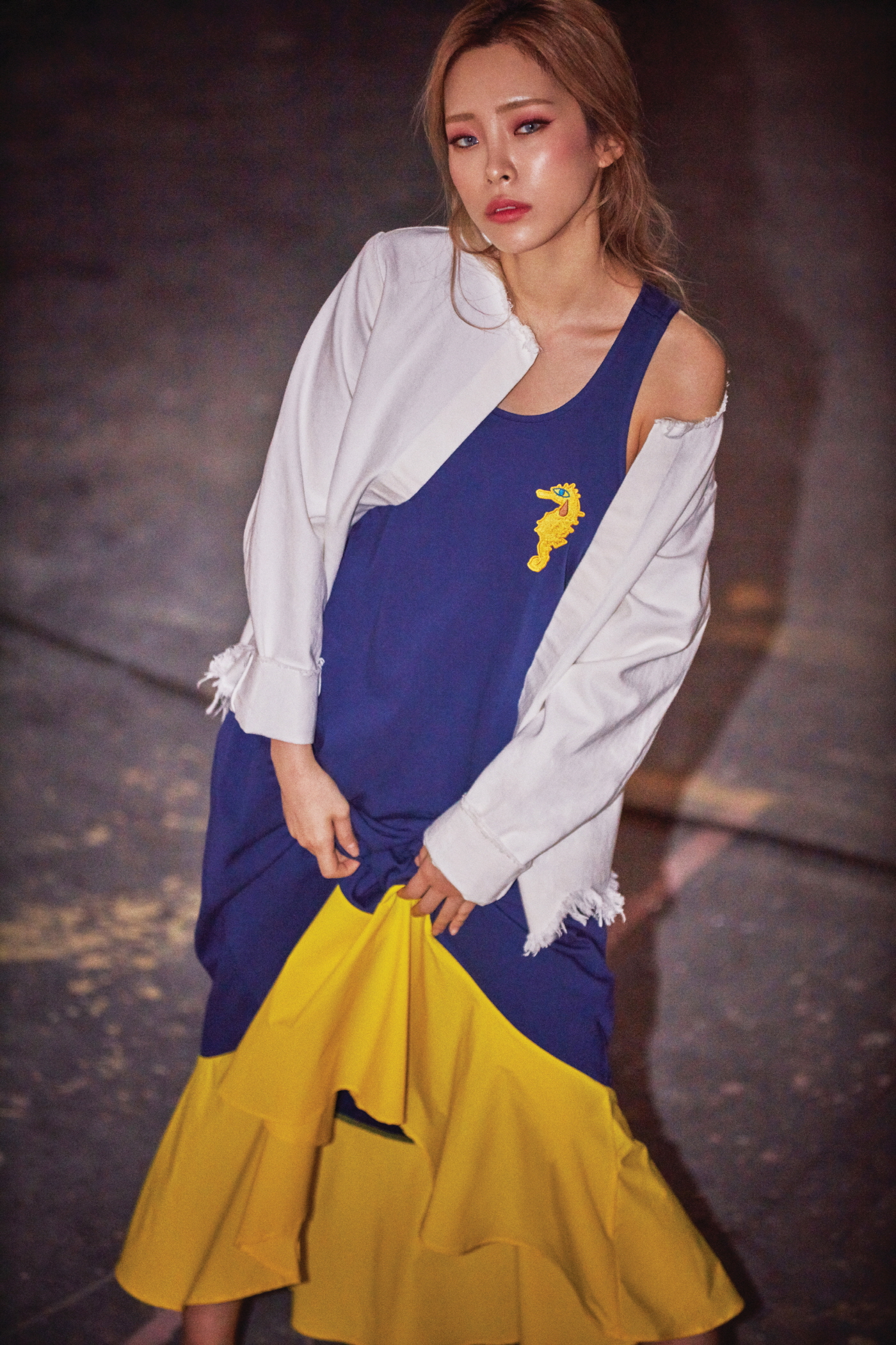 노란 해마를 수놓은 파란색 슬리브리스 원피스는 노아 컬렉션 by 코오롱스포츠(Noah Collection by Kolon Sport).