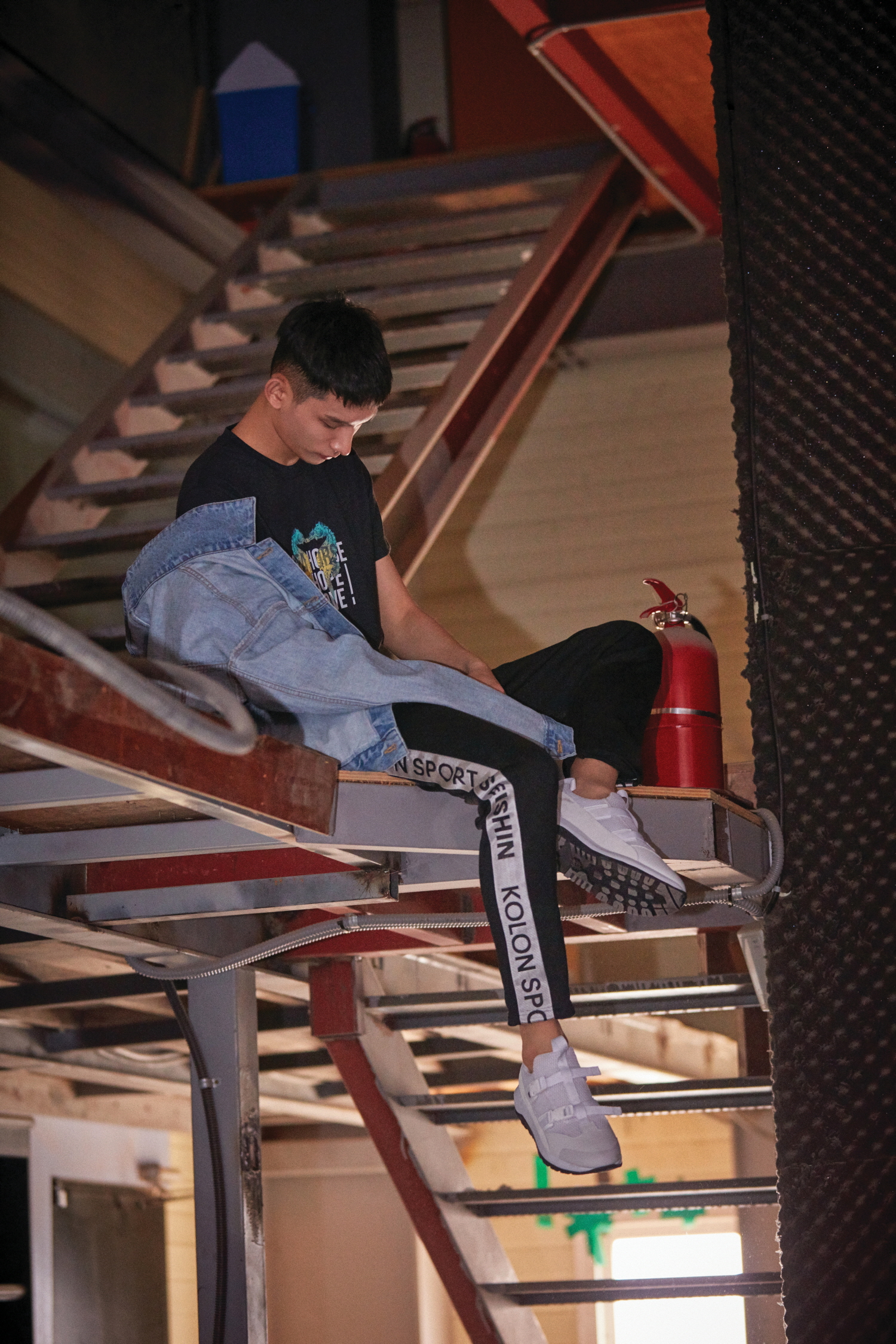 프린트 티셔츠는 노아 컬렉션 by 코오롱스포츠(Noah Collection by Kolon Sport), 바지 옆면을 레터링 처리한 팬츠는 세이신 by 코오롱스포츠(Kolon Sport + SEISHIN), 프랑스 디자인 스튜디오 APCS와의 컬래버레이션 에디션인 슬립온은 코오롱스포츠(Kolon Sport).